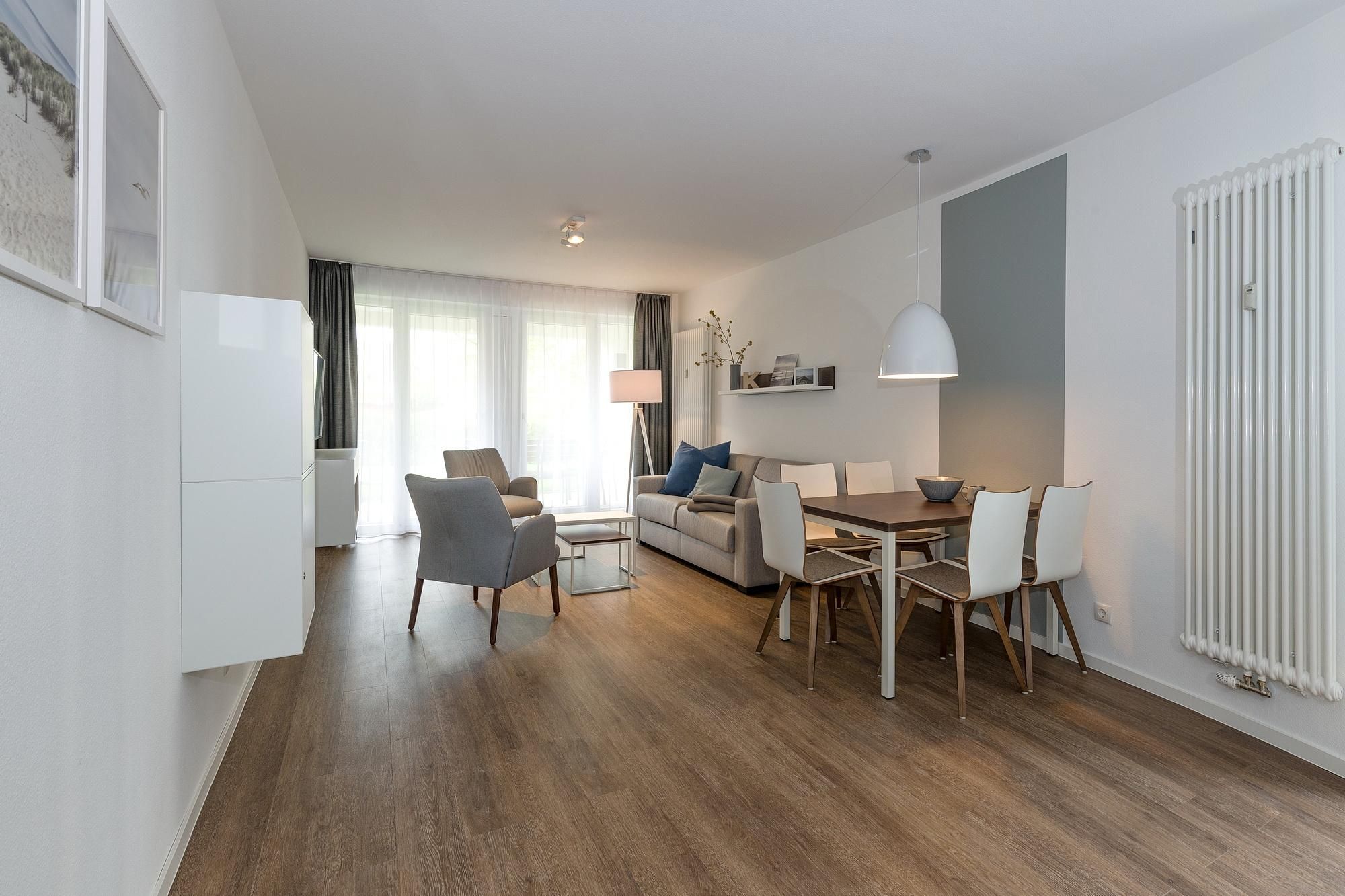 Das geschmackvoll eingerichtete Nichtraucher-Apartment verfügt über kostenfreies WLAN. Der Wohnbereich mit Schlafcouch, bietet eine voll ausgestattete offene Küchenzeile mit Geschirrspüler, Gefrierfach, Kaffeemaschine, Toaster, Wasserkocher und Mikrowelle, Backofen sowie einen großen Flatscreen-TV und ein Radio. Das Apartment verfügt über einen Esstisch für 5 Personen und einen behaglichen Sitzbereich. Zwei separate Schlafzimmer stehen euch zur Verfügung. Eines davon verfügt über ein Doppelbett (1,80 x 2,00 m) und einen eigenen Flatscreen-TV, ein weiteres über ein Etagenbett (0,90, x 2,00 m). Ein Kinderbett kann gegen Entgelt aufgestellt werden. Im stilvollen Badezimmer befinden sich eine große begehbare Dusche sowie ein Waschtisch mit Föhn und Kosmetikspiegel. Nach einem erlebnisreichen Urlaubstag lässt es sich auf der überdachten und mit Gartenmöbeln ausgestatteten Terrasse wunderbar entspannen.