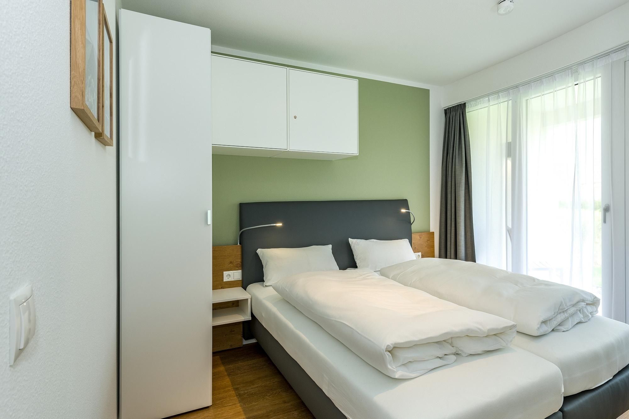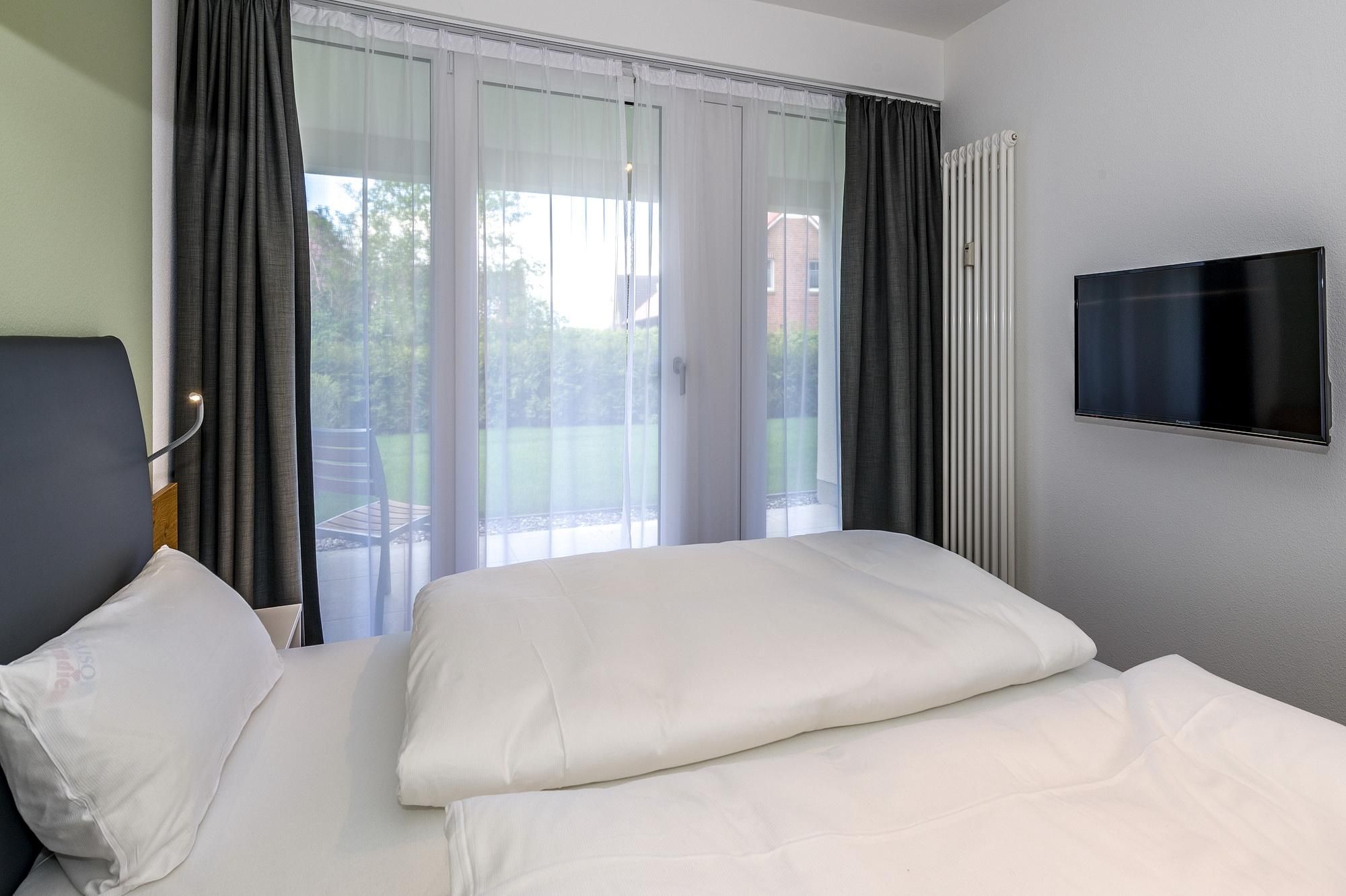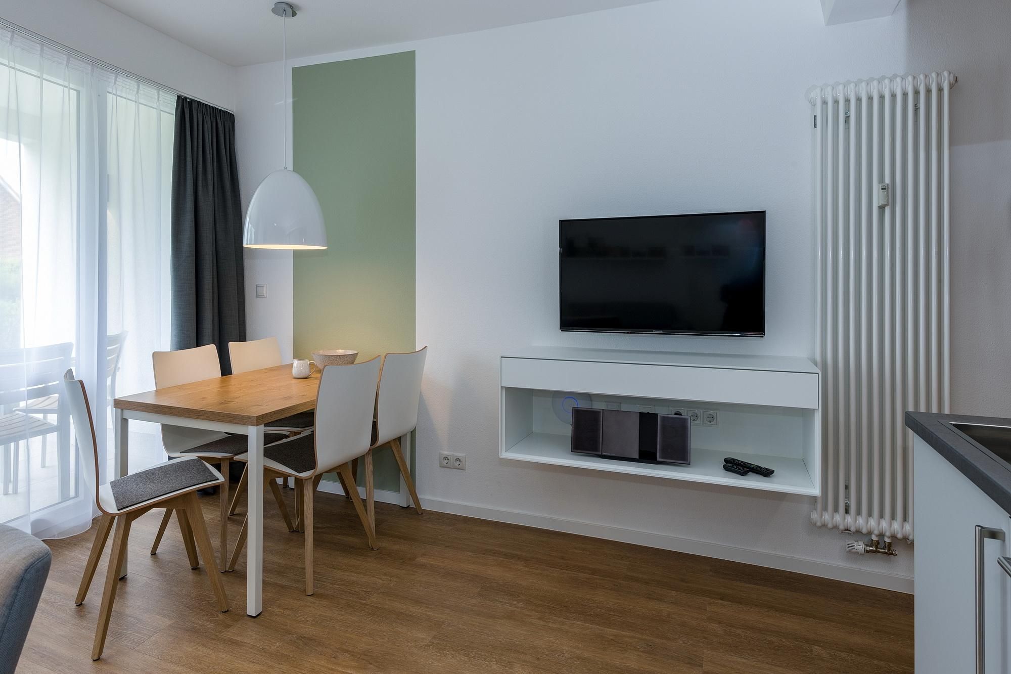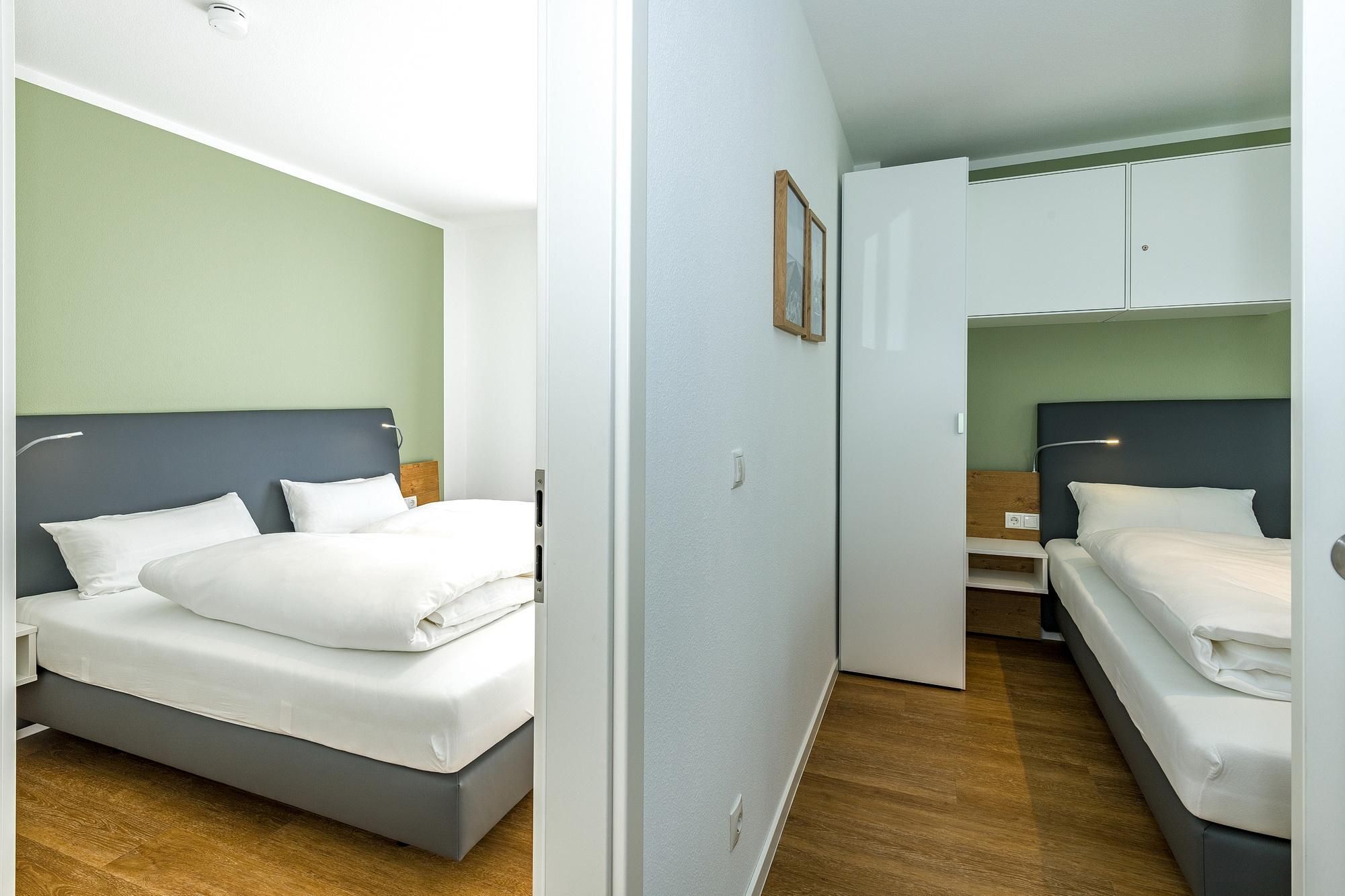 Das geschmackvoll eingerichtete Nichtraucher-Apartment verfügt über kostenfreies WLAN. Der Wohnbereich bietet eine voll ausgestattete offene Küchenzeile mit Geschirrspüler, Gefrierfach, Backofen, Kaffeemaschine, Toaster, Wasserkocher und Mikrowelle sowie einen großen Flatscreen-TV und ein Radio. Das Apartment verfügt über einen Esstisch für 5 Personen und einen behaglichen Sitzbereich. Zwei separate Schlafzimmer mit jeweils einem Doppelbett stehen euch zur Verfügung. Eines davon verfügt zudem über einen eigenen Flatscreen-TV. Ein Kinderbett kann gegen Entgelt aufgestellt werden. Im stilvollen Badezimmer befinden sich eine große begehbare Dusche sowie ein Waschtisch mit Föhn und Kosmetikspiegel. Nach einem erlebnisreichen Urlaubstag entspannt ihr auf dem überdachten und mit Gartenmöbeln für 4 Personen ausgestatteten Terrasse.
