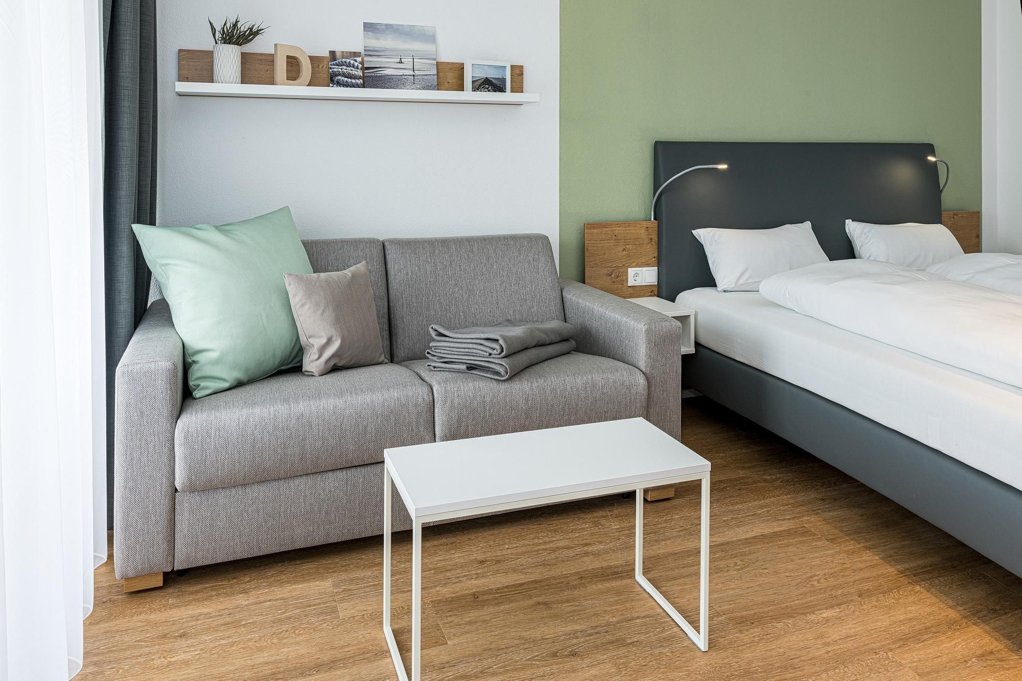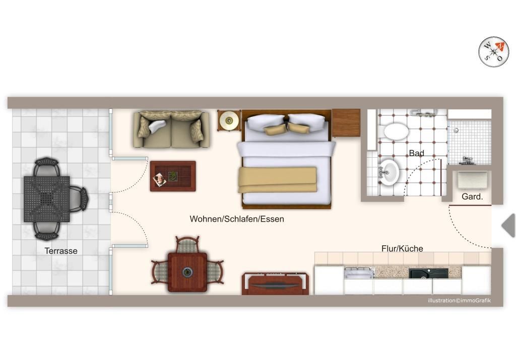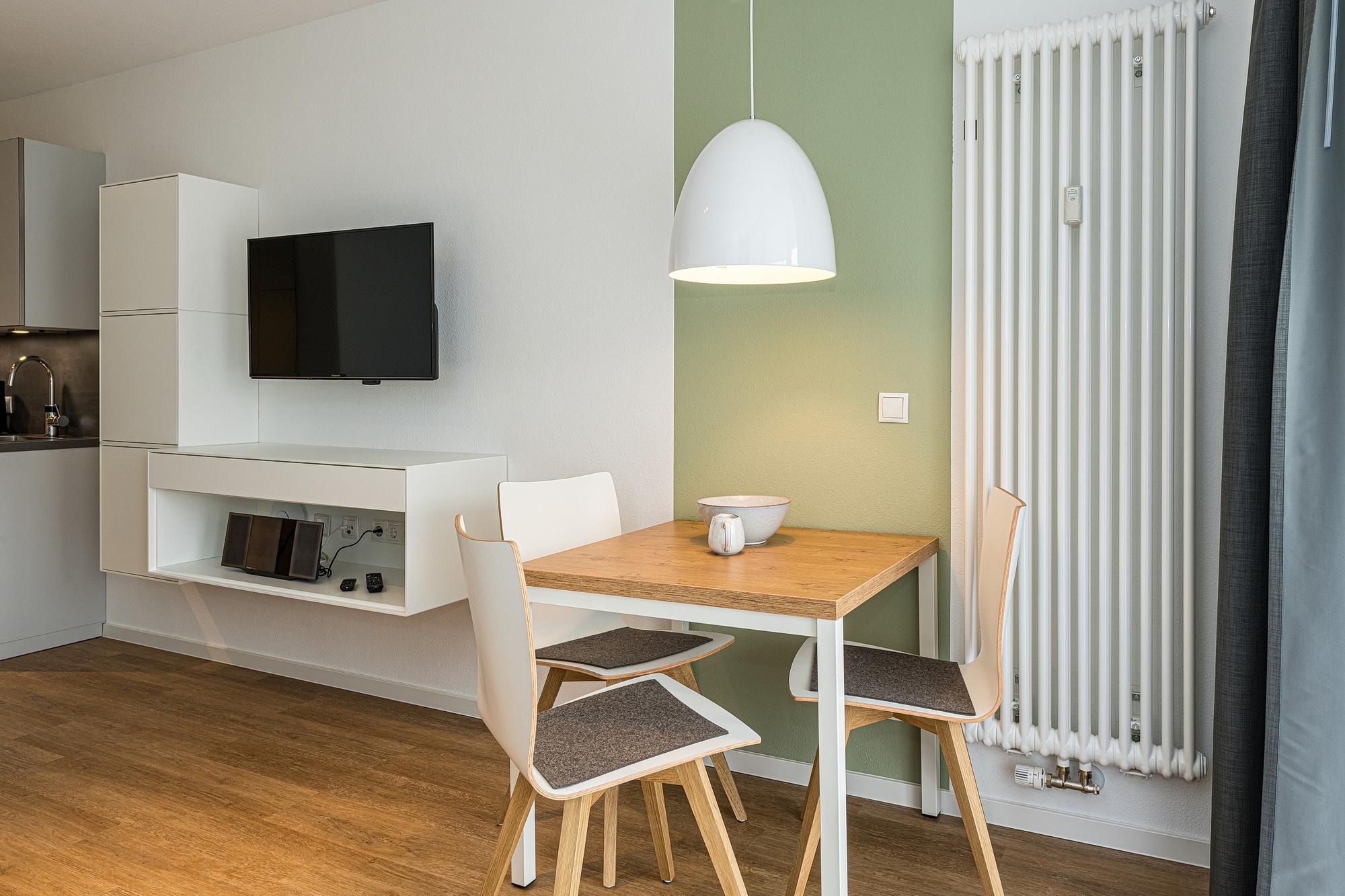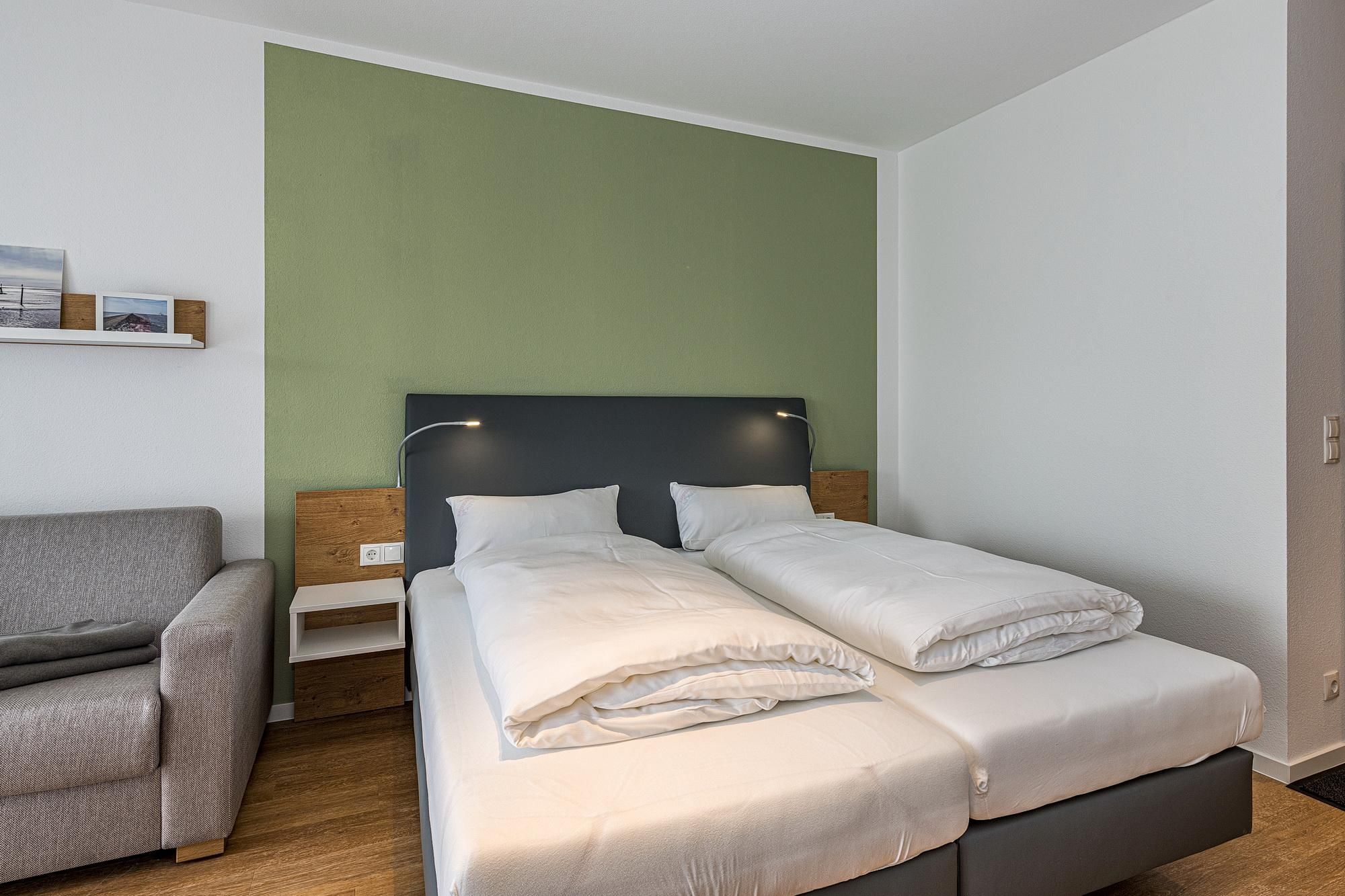 Das geschmackvoll eingerichtete Nichtraucher-Apartment verfügt über kostenfreies WLAN. Der Wohn-Schlafbereich bietet eine voll ausgestattete offene Küchenzeile mit Geschirrspüler, Gefrierfach, Backofen, Kaffeemaschine, Toaster, Wasserkocher und Mikrowelle sowie ein Doppelbett, einen großen Flatscreen-TV und ein Radio. Das Apartment verfügt über einen Esstisch für 3 Personen und einen behaglichen kleinen Sitzbereich. Ein Kinderbett kann gegen Entgelt aufgestellt werden. Im stilvollen Badezimmer befinden sich eine große begehbare Dusche sowie ein Waschtisch mit Föhn und Kosmetikspiegel. Nach einem erlebnisreichen Urlaubstag entspannt ihr auf der überdachten und mit Gartenmöbeln für 3 Personen ausgestatteten Terrasse.