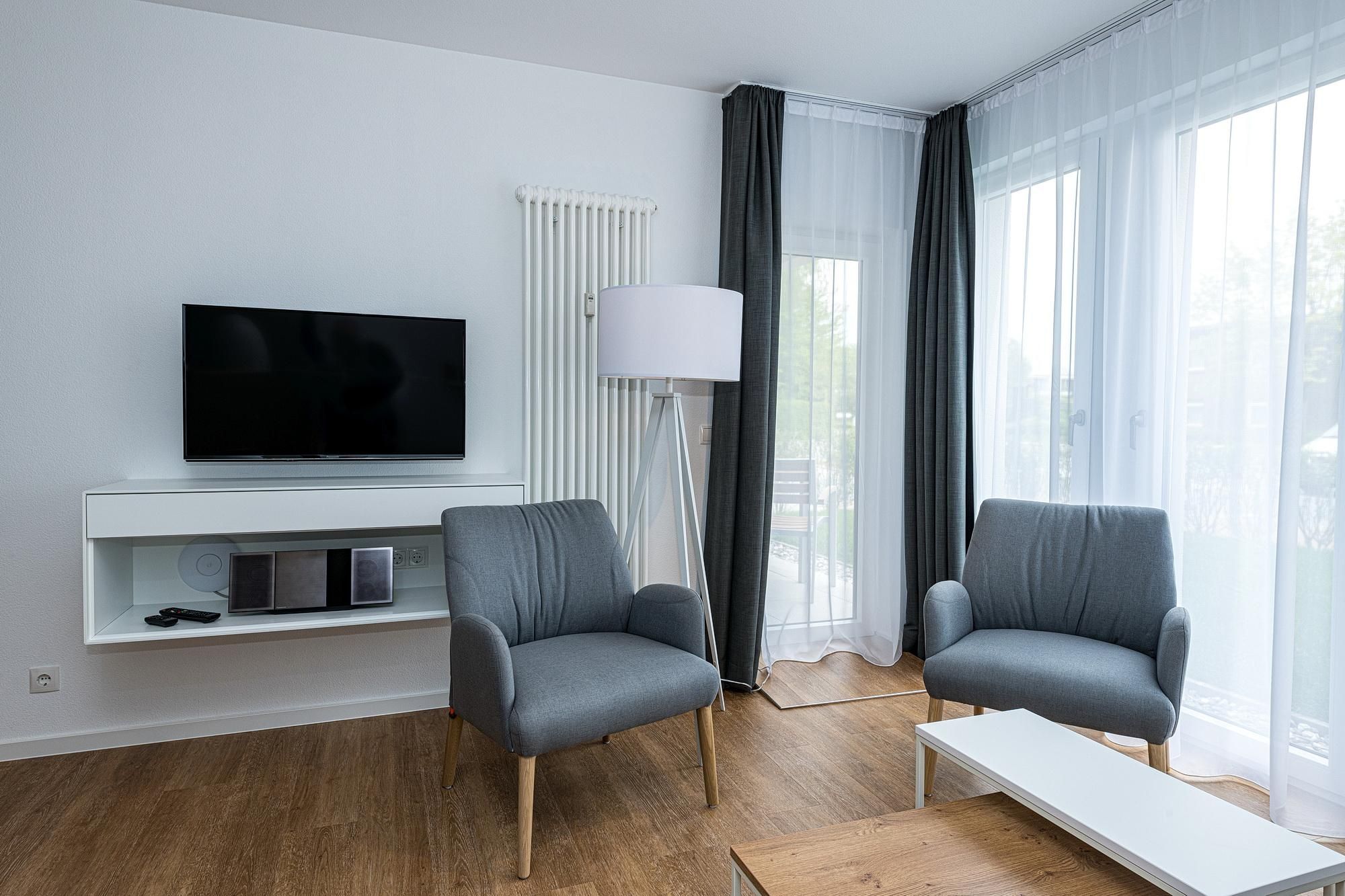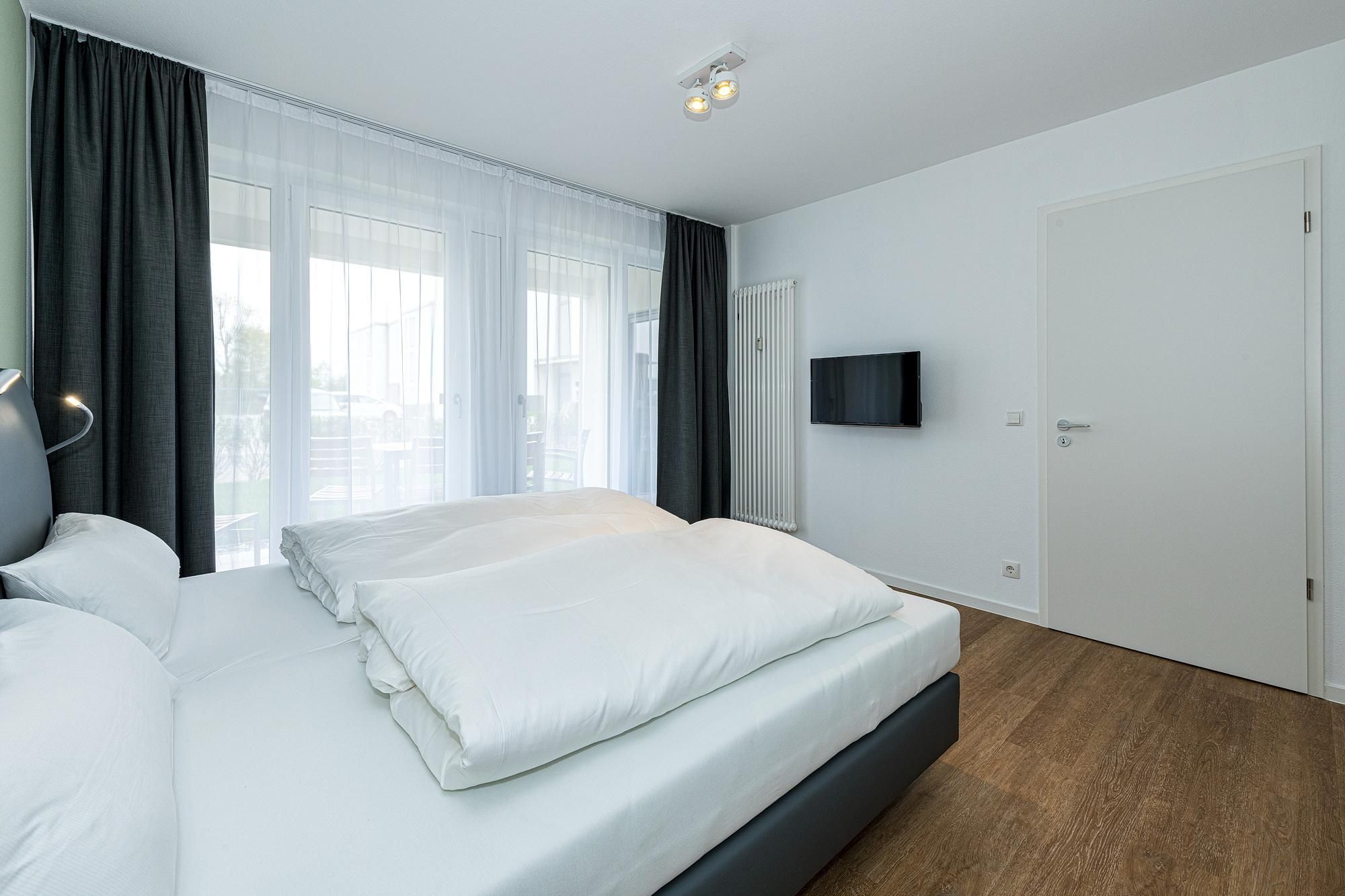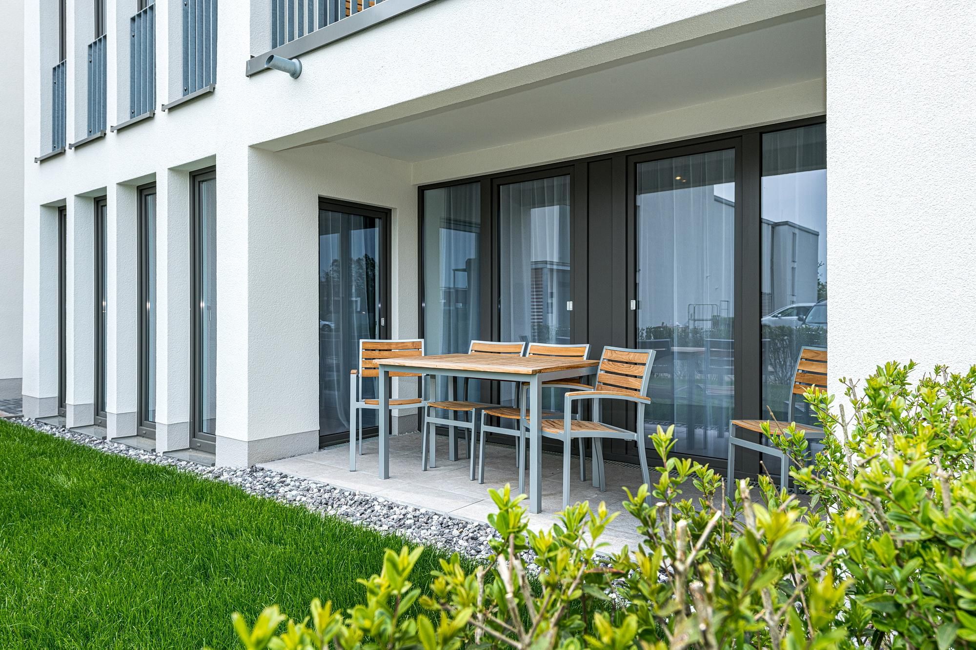 Das geschmackvoll eingerichtete Nichtraucher-Apartment verfügt über kostenfreies WLAN. Der Wohnbereich mit einer Schlafcouch bietet eine voll ausgestattete offene Küchenzeile mit Geschirrspüler, Gefrierfach, Kaffeemaschine, Toaster, Wasserkocher, Backofen und Mikrowelle sowie einen großen Flatscreen-TV und ein Radio. Das Apartment verfügt über einen Esstisch für 5 Personen und einen behaglichen Sitzbereich. Zwei separate Schlafzimmer stehen euch zur Verfügung. Eines davon verfügt über ein Doppelbett und einen eigenen Flatscreen-TV, ein weiteres über zwei Einzelbetten. Ein Kinderbett kann gegen Entgelt aufgestellt werden. Im stilvollen Badezimmer befinden sich eine große begehbare Dusche sowie ein Waschtisch mit Föhn und Kosmetikspiegel. Nach einem erlebnisreichen Urlaubstag entspannt ihr auf der überdachten und mit Gartenmöbeln für 5 Personen ausgestatteten Terrasse.