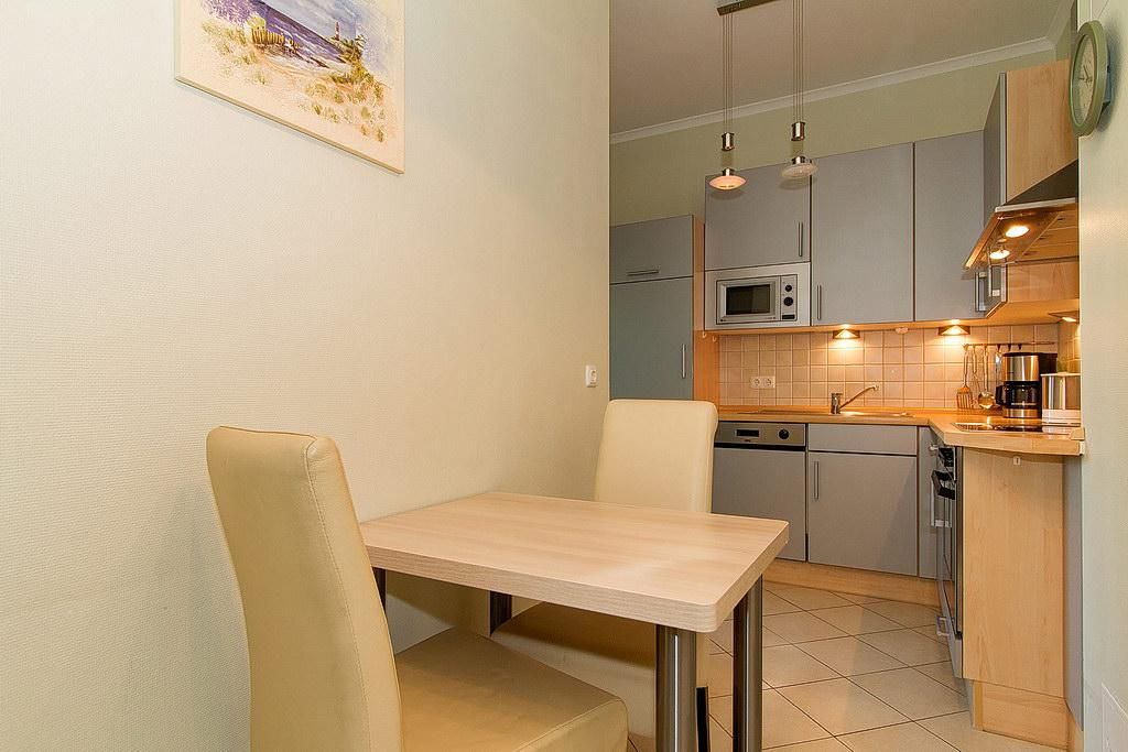 Komplettiert wird die Nichtraucher-Ferienwohnung durch eine voll ausgestattete separate Küche mit Wasserkocher, Kaffeemaschine, Toaster, Backofen, Geschirrspüler und Mikrowelle, durch Föhn, Bügeleisen mit Bügelbrett, Mini-Safe und eine TV-HiFi-Anlage und DVD-Player.