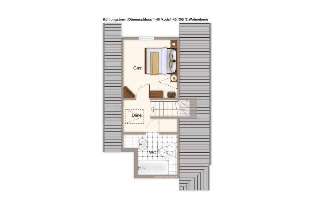 Das Dachgeschoss-Apartment befindet sich auf der Nordseite der Anlage, im Haus 1, Aufgang A und im 3. Obergeschoss.