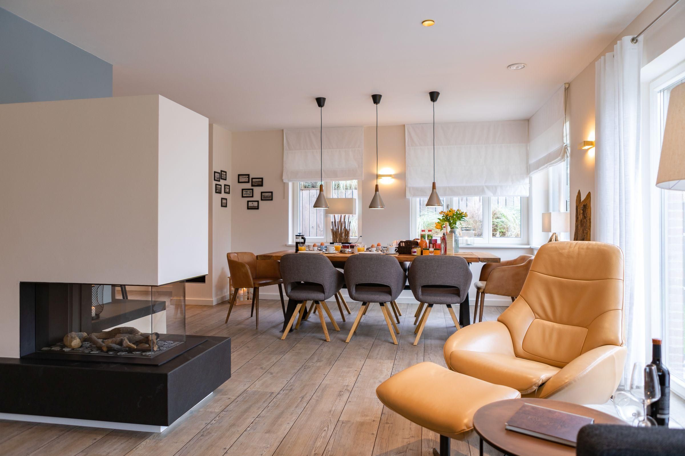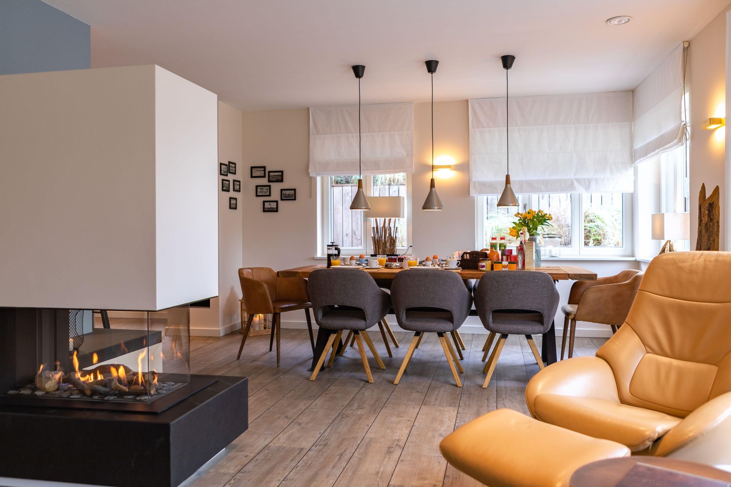 Ein zu drei Seiten offener Gaskamin verbindet den Wohnbereich im EG mit dem Esszimmer und der Küche.