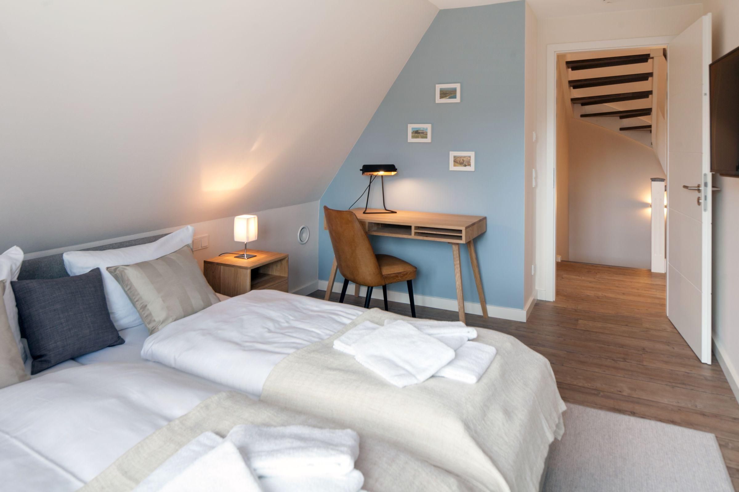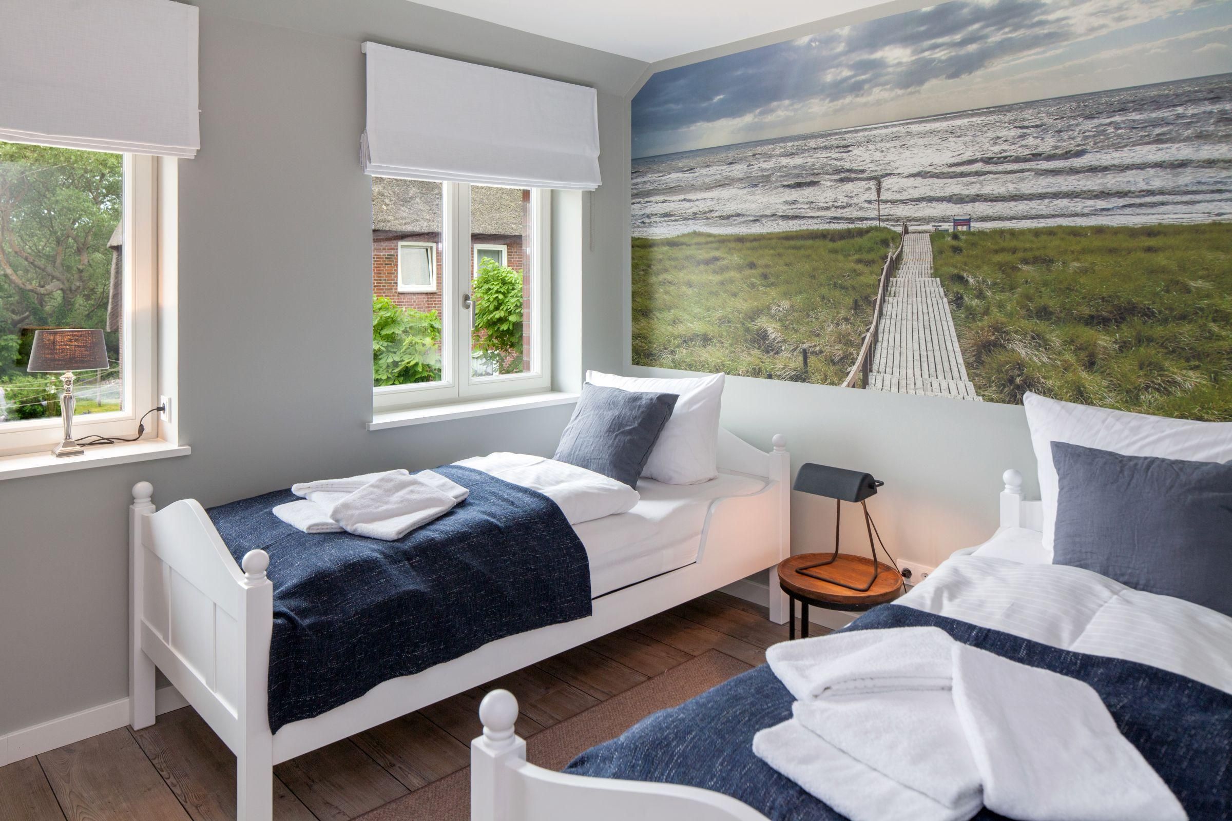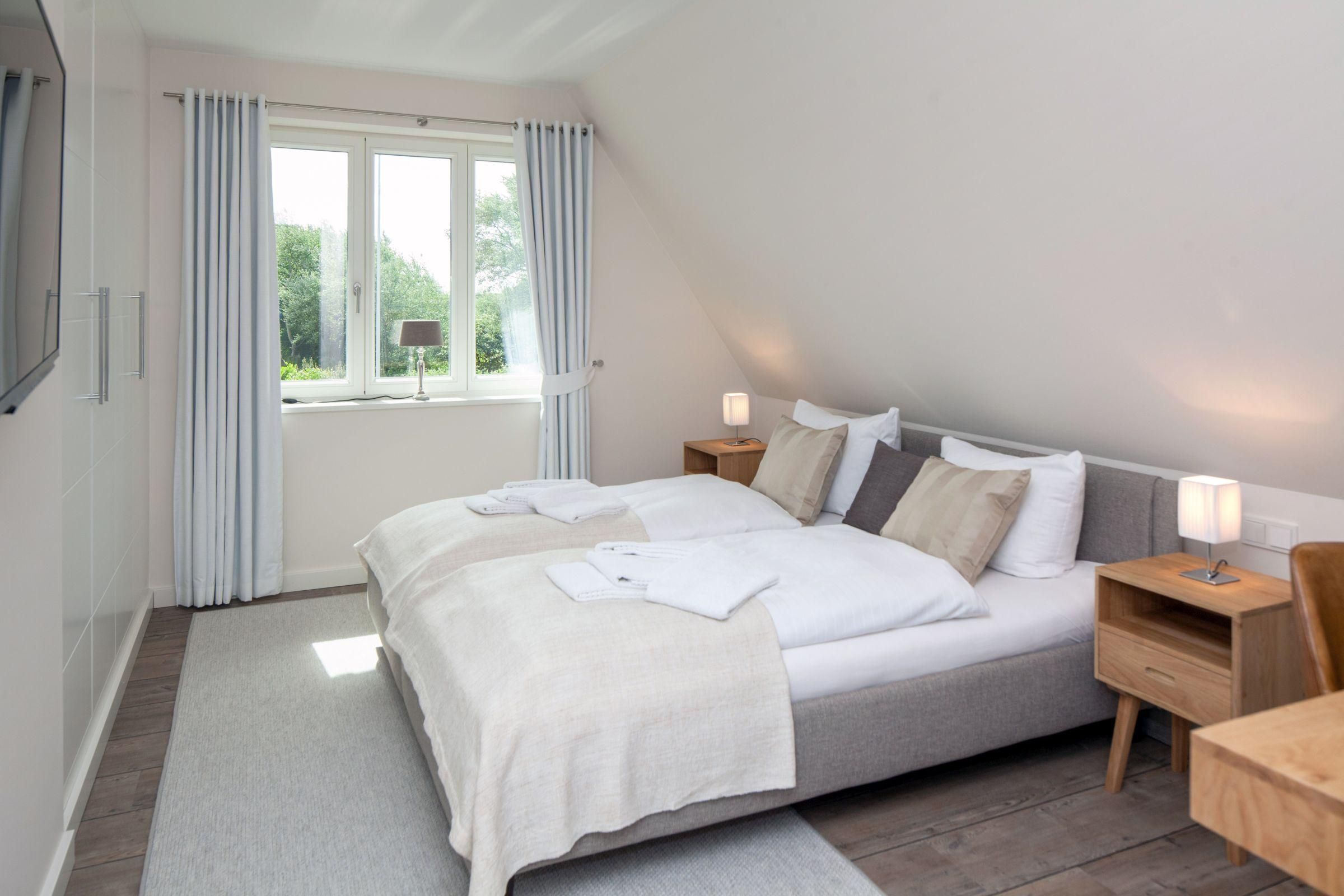 Die Schlafräume liegen in der ersten bzw. zweiten Etage (zwei mit Doppelbett, zwei mit zwei Einzelbetten).