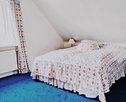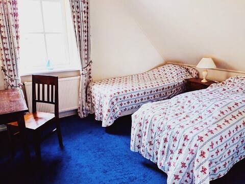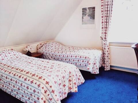 3 Schlafräume im OG: 1 Schlafzimmer mit 1 Doppelbett, 2 Schlafzimmer mit je 2 Einzelbetten (Fußböden: Teppich)