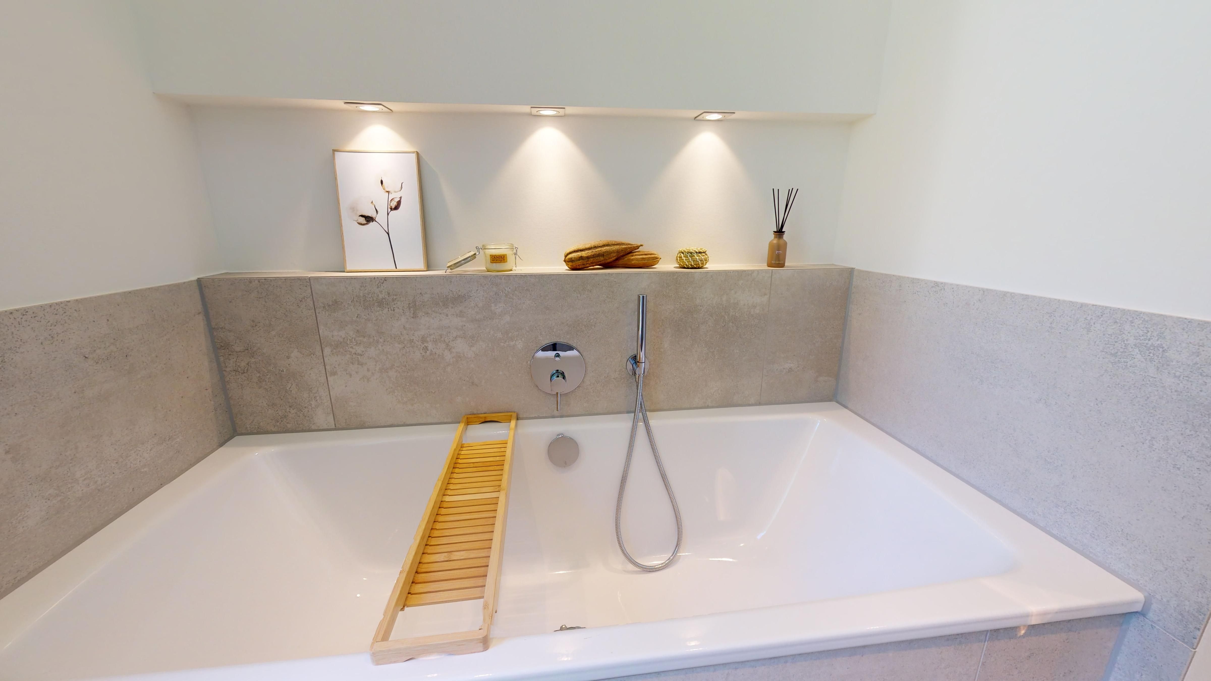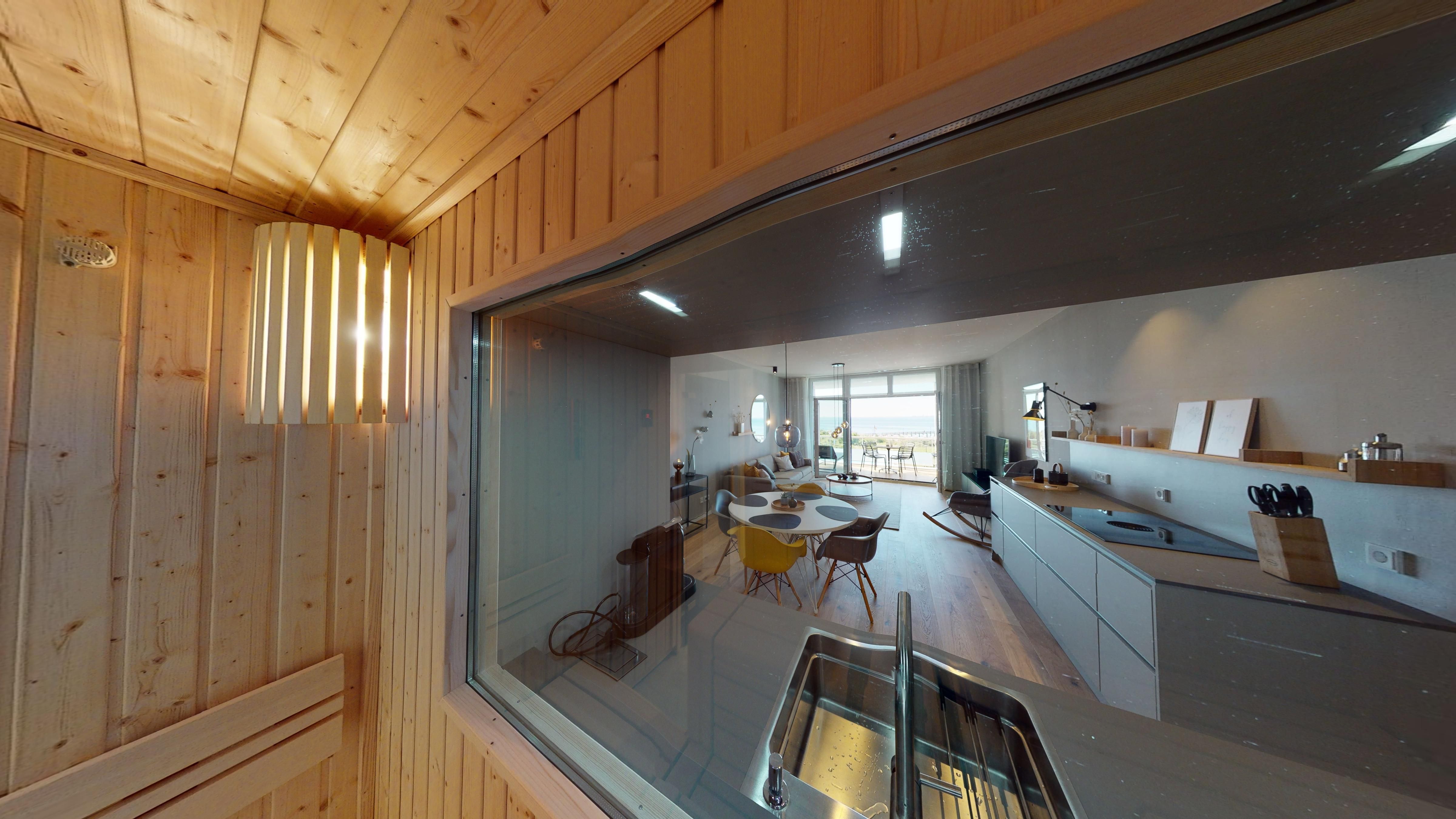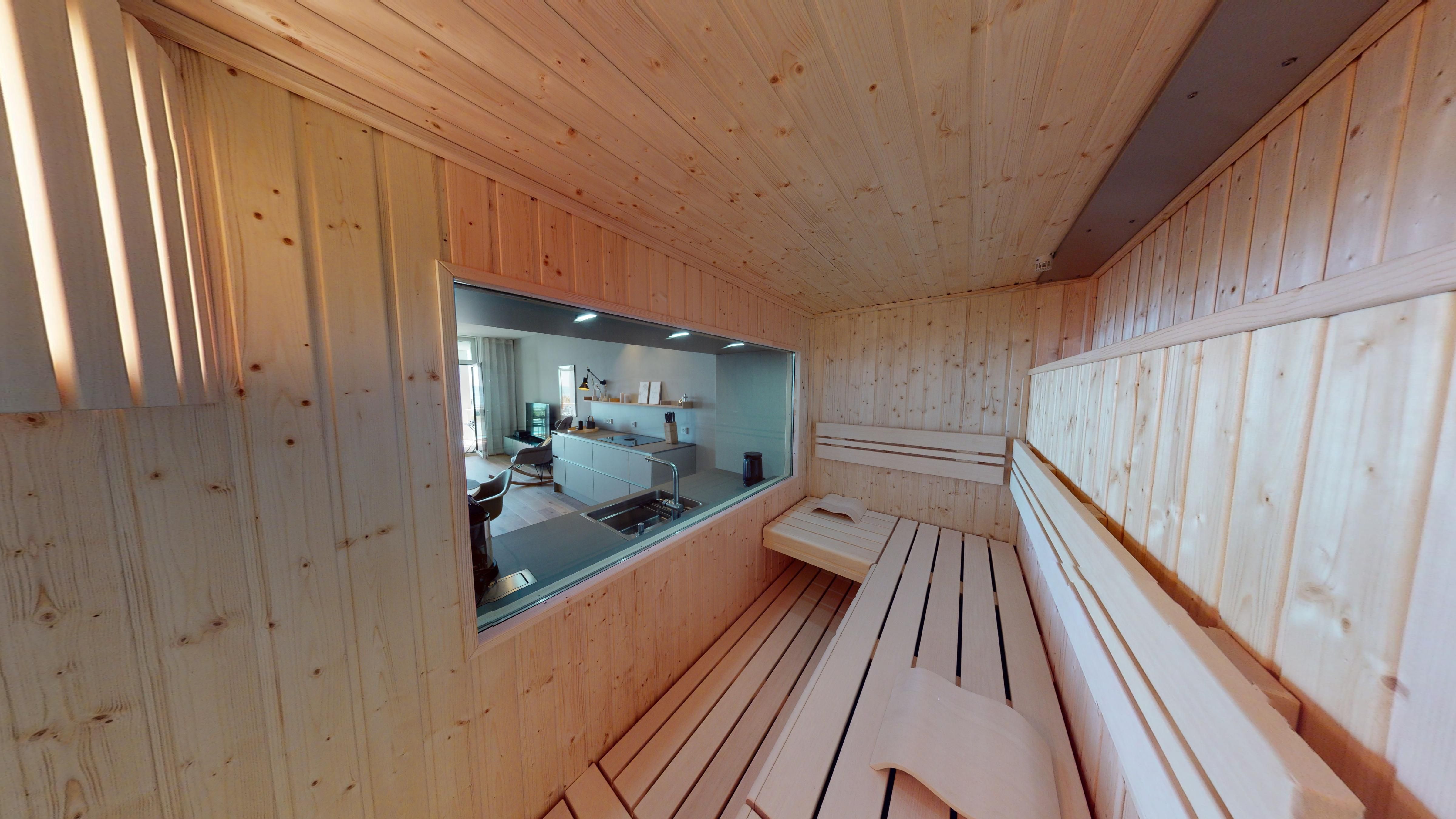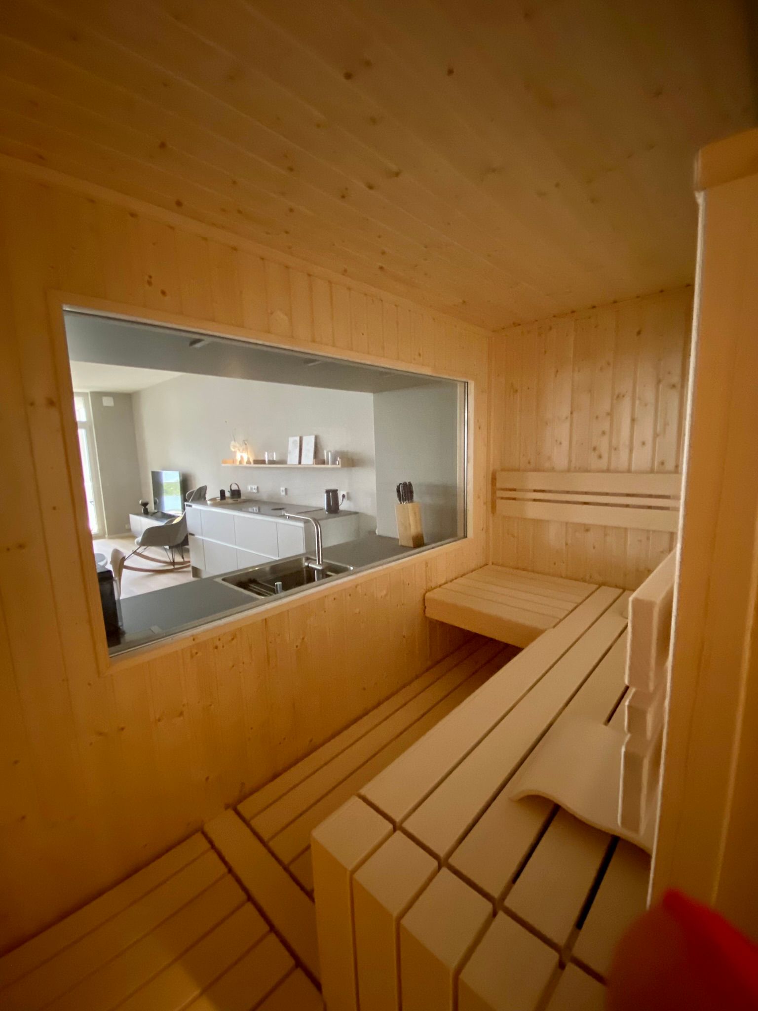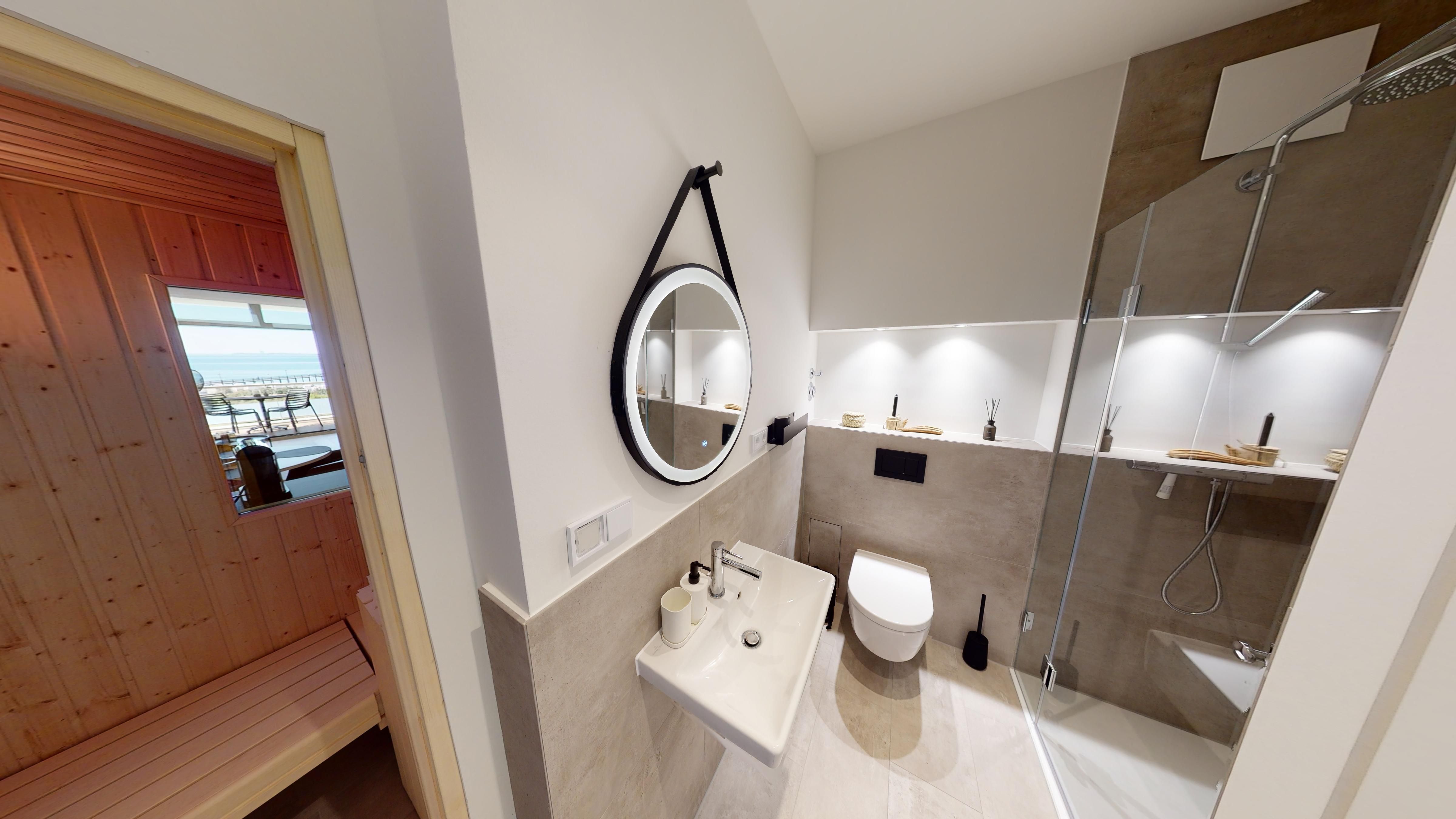 Besonders komfortabel sind die beiden Badezimmer, eines mit Dusche und Badewanne sowie ein zweites Badezimmer mit Dusche und integrierter Sauna – inklusive Blick aufs Meer! Die überdachte Loggia mit herrlichem Meerblick in Südlage ist mit einem Tisch, Elektrogrill, vier Stühlen und zwei Sonnenliegen ausgestattet.
