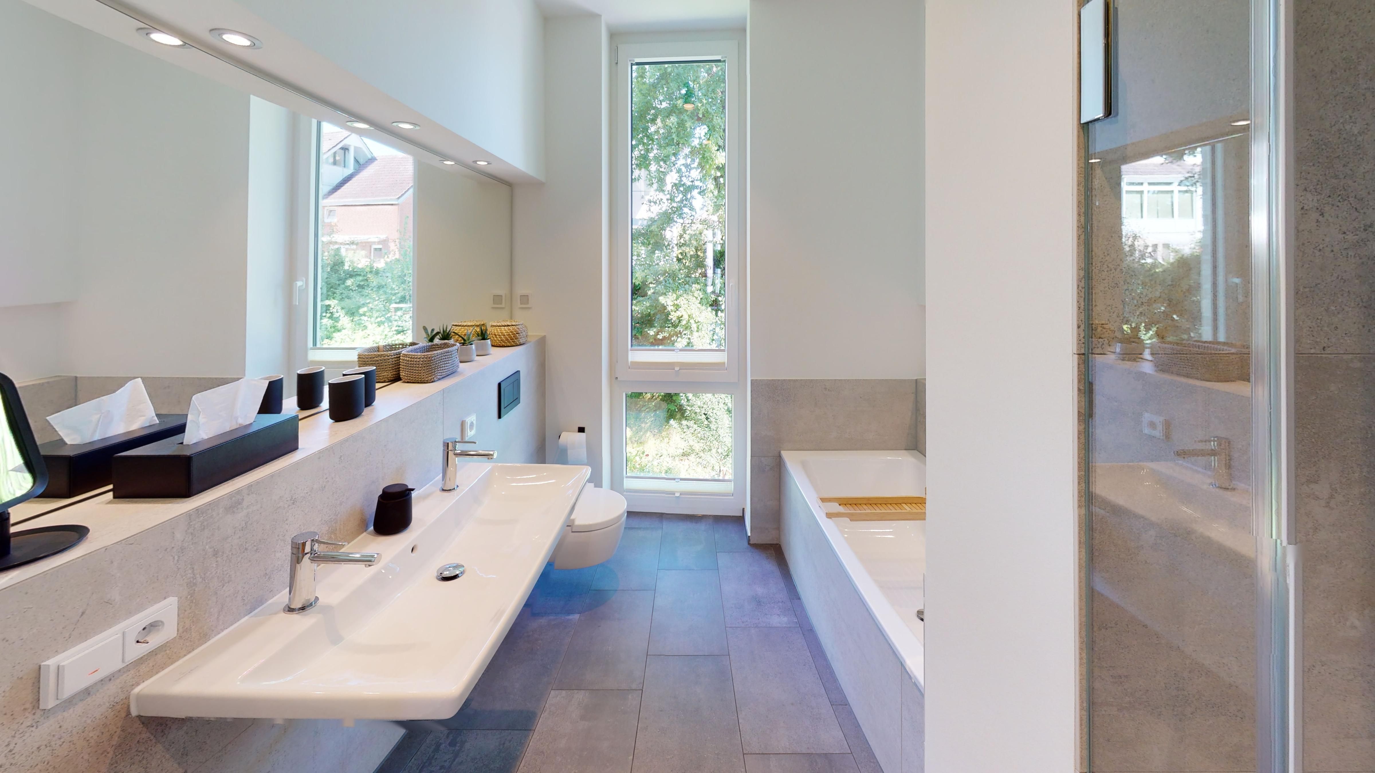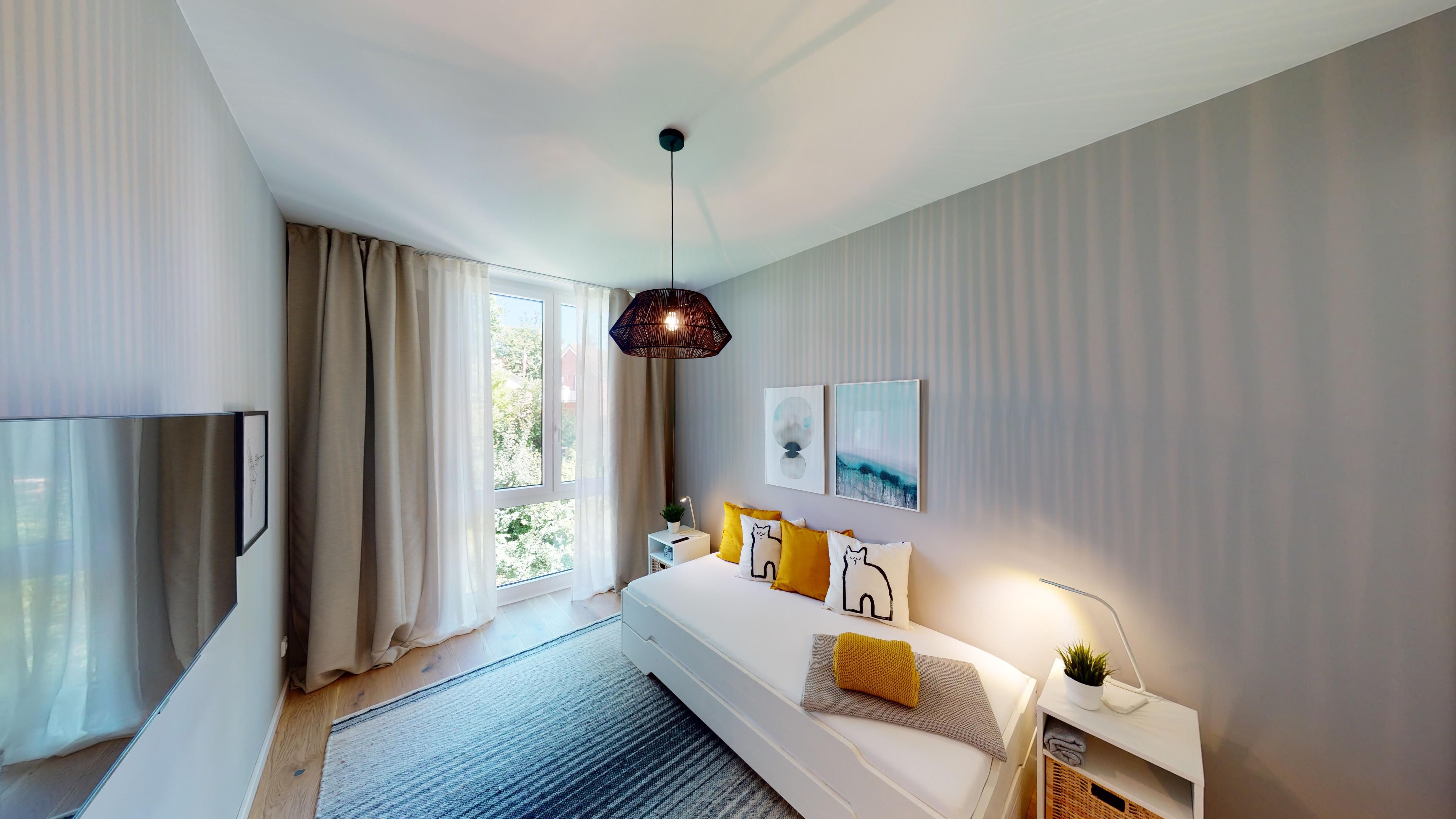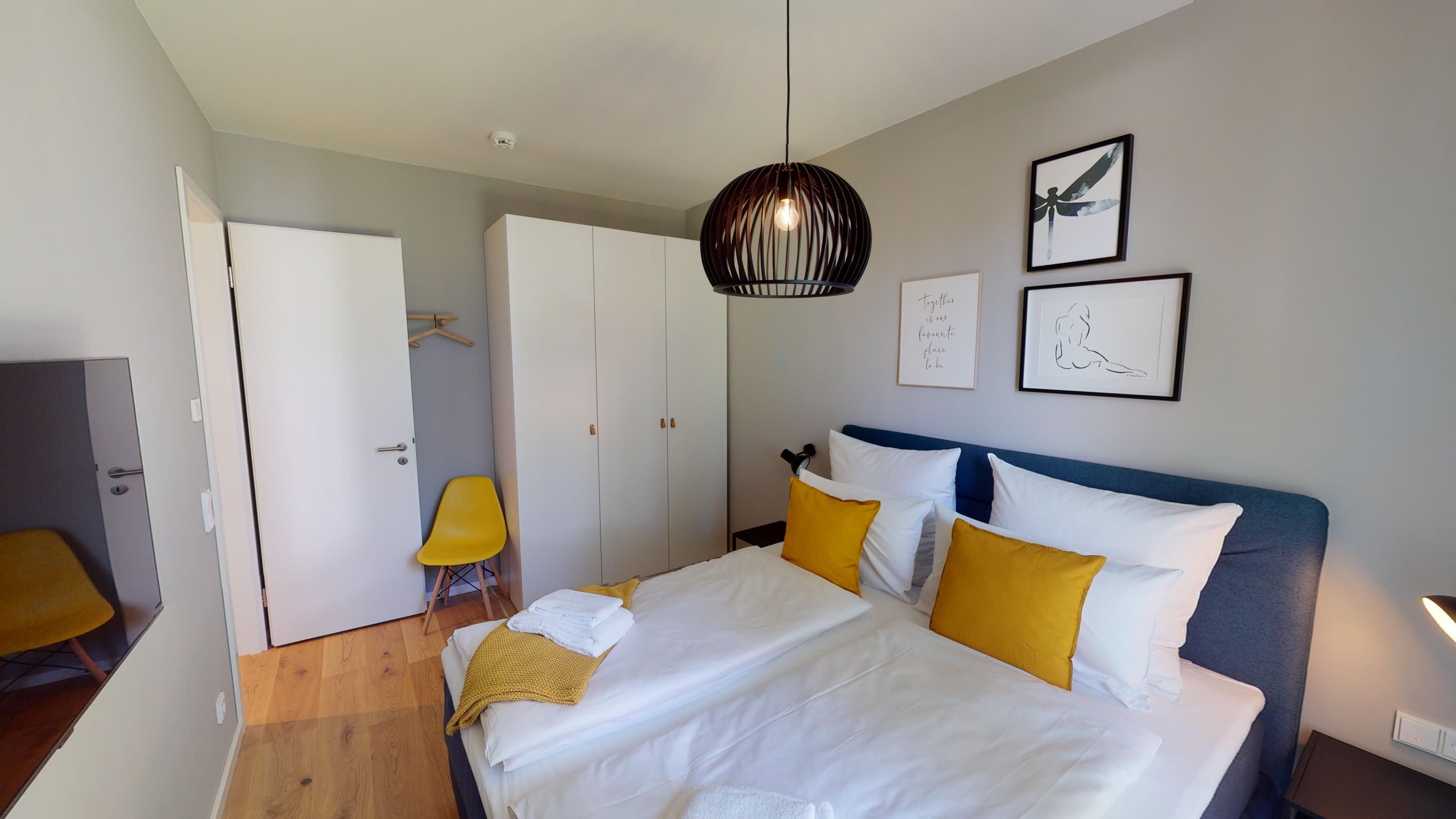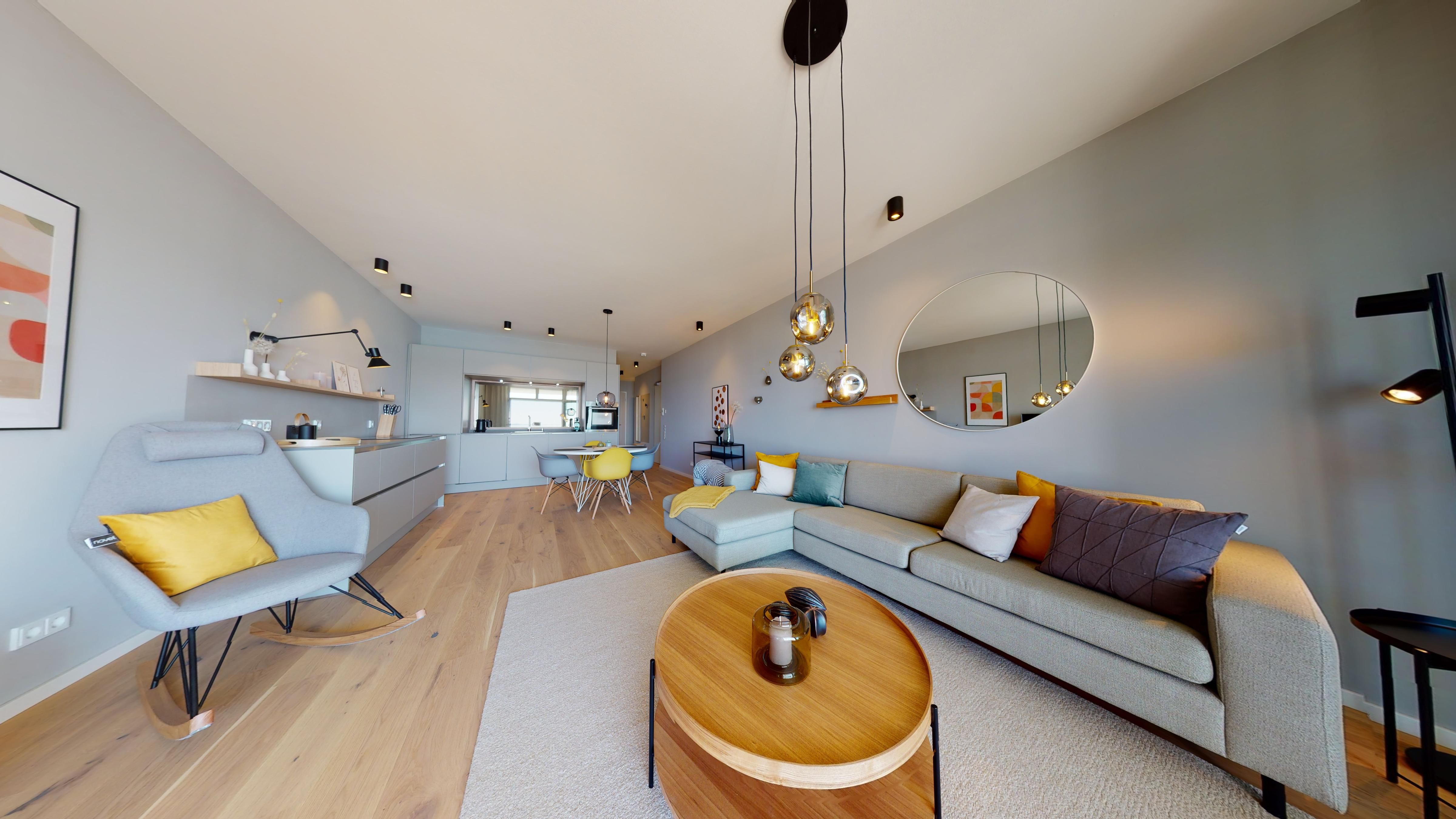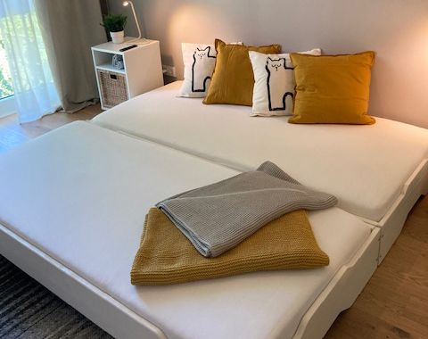 Der großzügige, offene Wohn- und Essbereich ist gemütlich eingerichtet und offen zur voll ausgestatteten Küche, die keine Wünsche offen lässt. Die beiden Schlafzimmer sind ruhig nach hinten gelegen. Im Master-Bedroom befindet sich ein hochwertiges Doppelbett, im zweiten Schlafzimmer stehen zwei Einzelbetten, die variabel gestellt werden können. Beide Schlafräume verfügen über einen Smart-TV, einen Kleiderschrank und Verdunkelungsvorhänge.