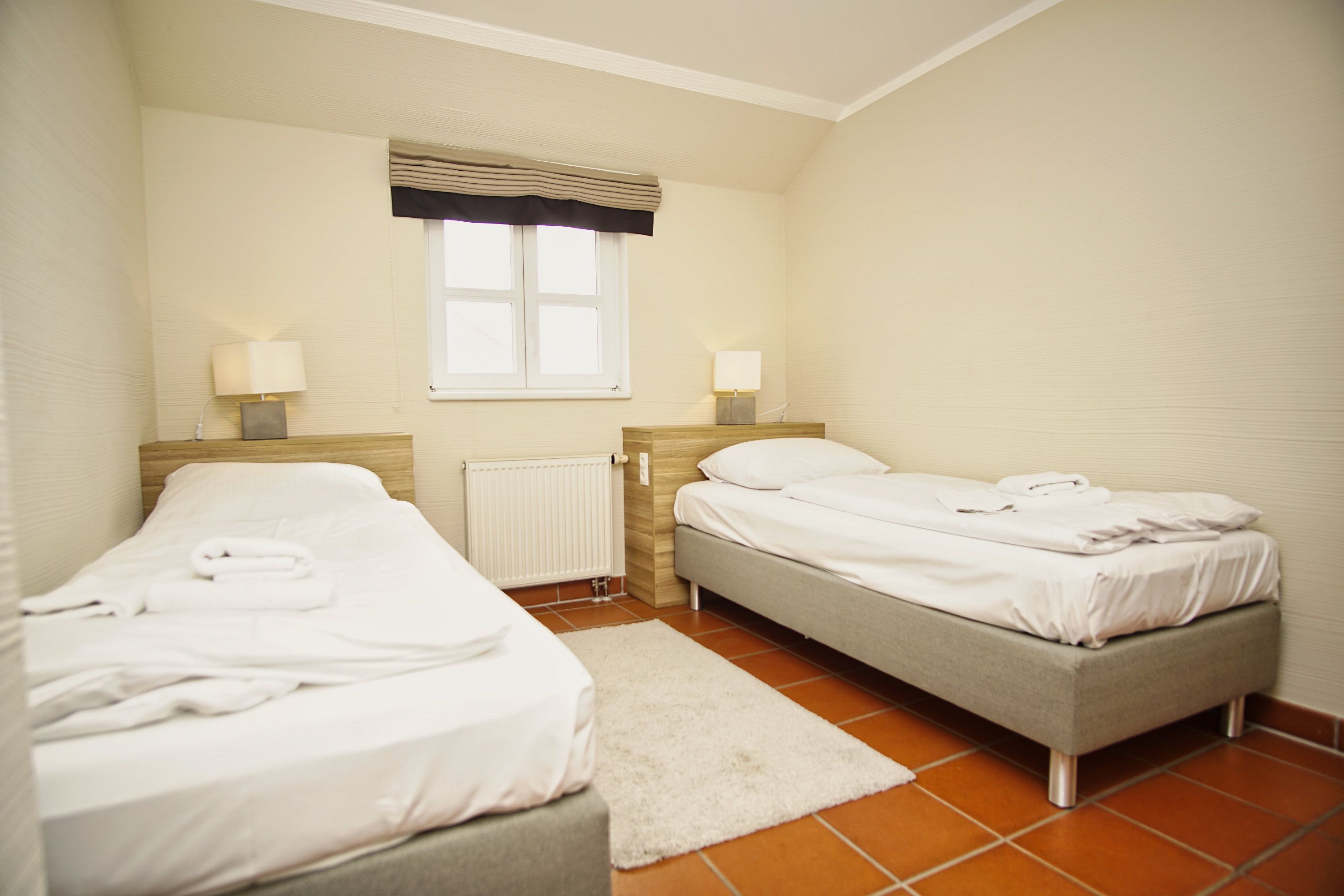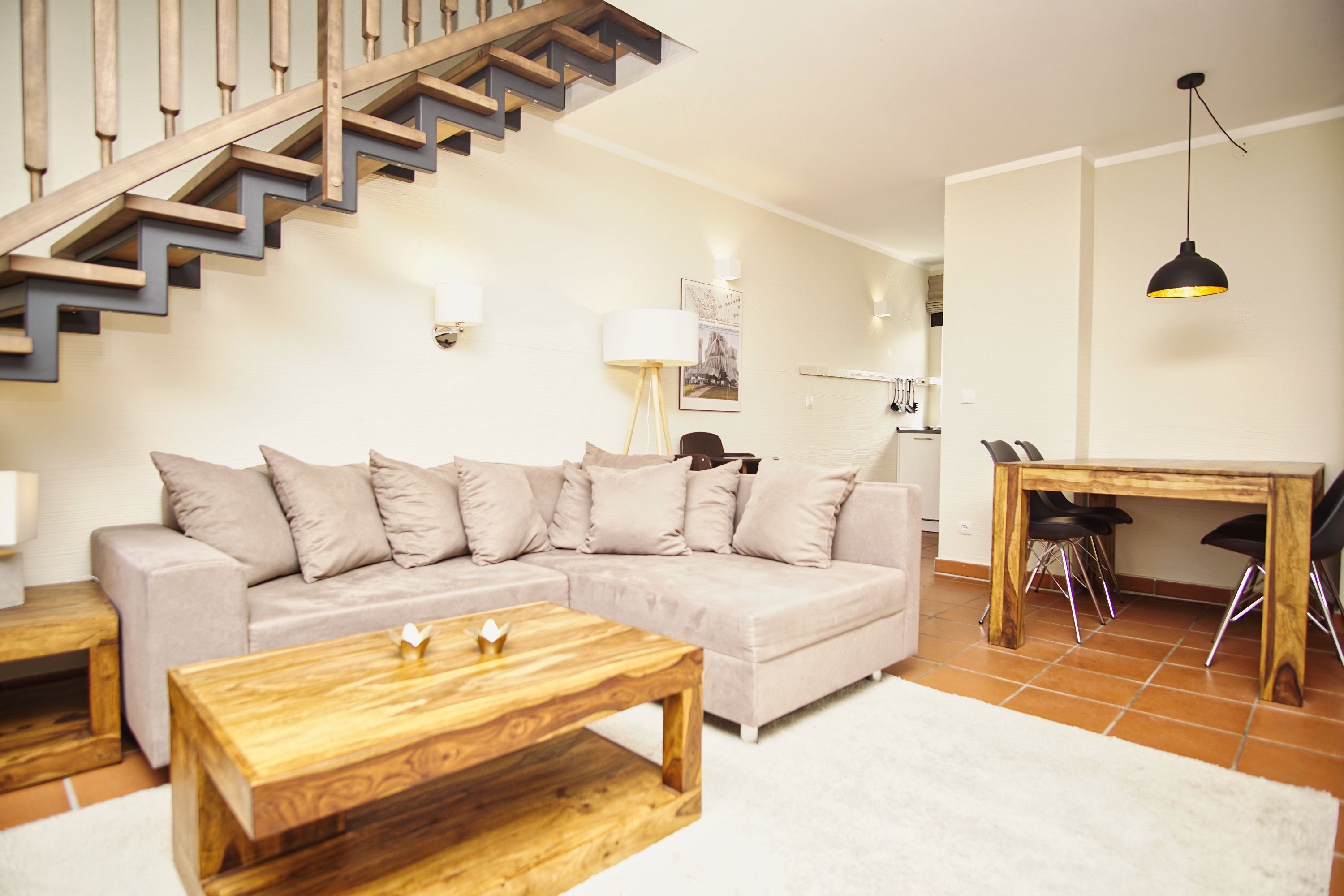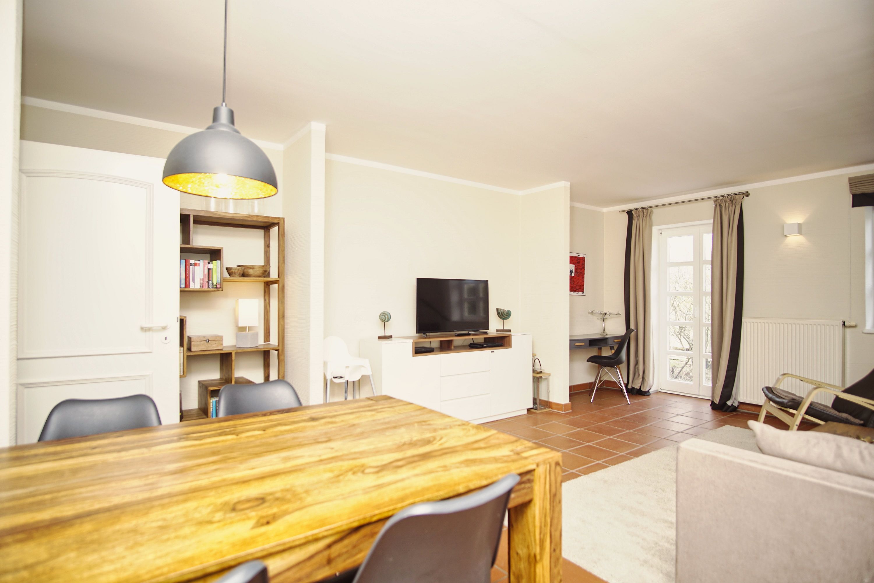 Die gemütliche Ferienwohnung erstreckt sich auf 2 Etagen. Auf ca. 75 m² haben bis zu 4 Personen und einem Kleinkind genügend Platz, um einen entspannten und erholsamen Urlaub auf Rügen verbringen zu können. Die moderne Ferienwohnung ist freundlich eingerichtet und lässt keine Wünsche offen. Im Wohnbereich befinden sich die bequeme und großzügige Couch, ein Essbereich sowie der Zugang zur eigenen Terrasse. Die Küche ist vollwertig ausgestattet. Nicht nur Küchenutensilien sind dort bestens untergebracht, sondern auch ein Backofen, eine Geschirrspülmaschine und eine Mikrowelle zählen hier zur Ausstattung. In der oberen Etage befinden sich die beiden separaten Schlafzimmer. Das eine hat ein Doppelbett und ein Kinderbett. Das zweite Schlafzimmer verfügt über zwei Einzelbetten. Im geräumigen Badezimmer befindet sich neben dem Waschtisch und WC auch die Dusch-Badewanne. Zudem befindet sich im Erdgeschoss noch ein Gäste-WC.