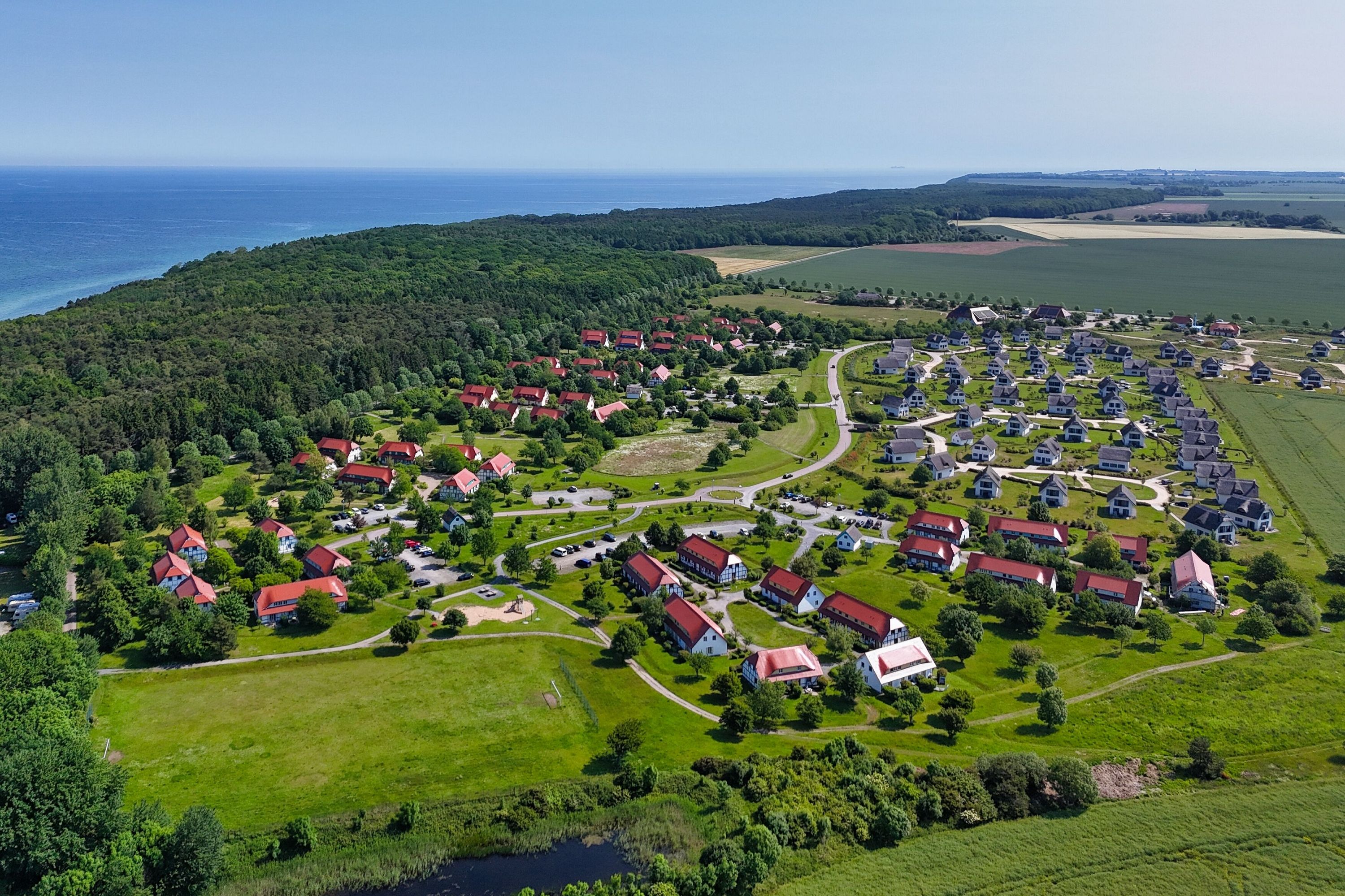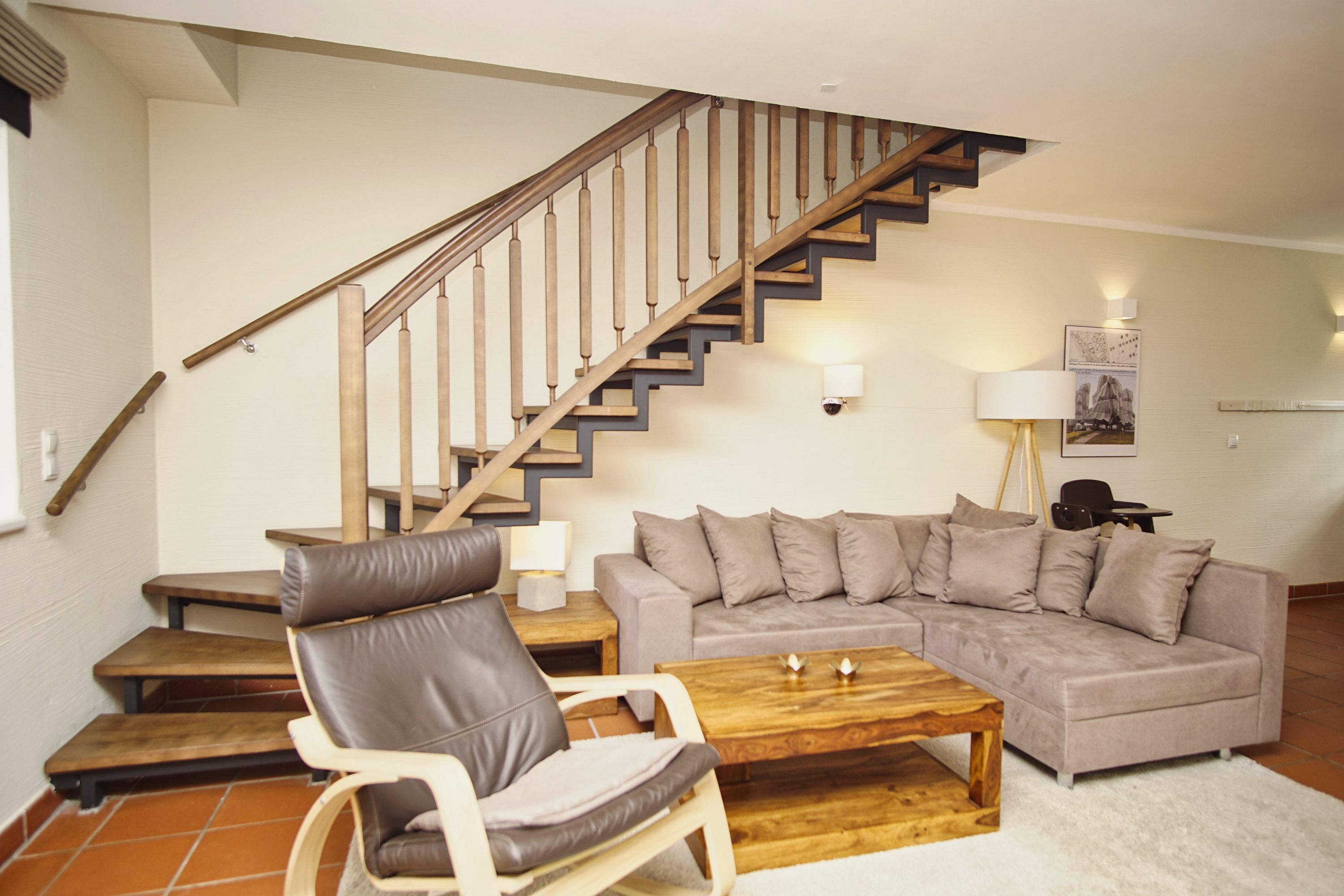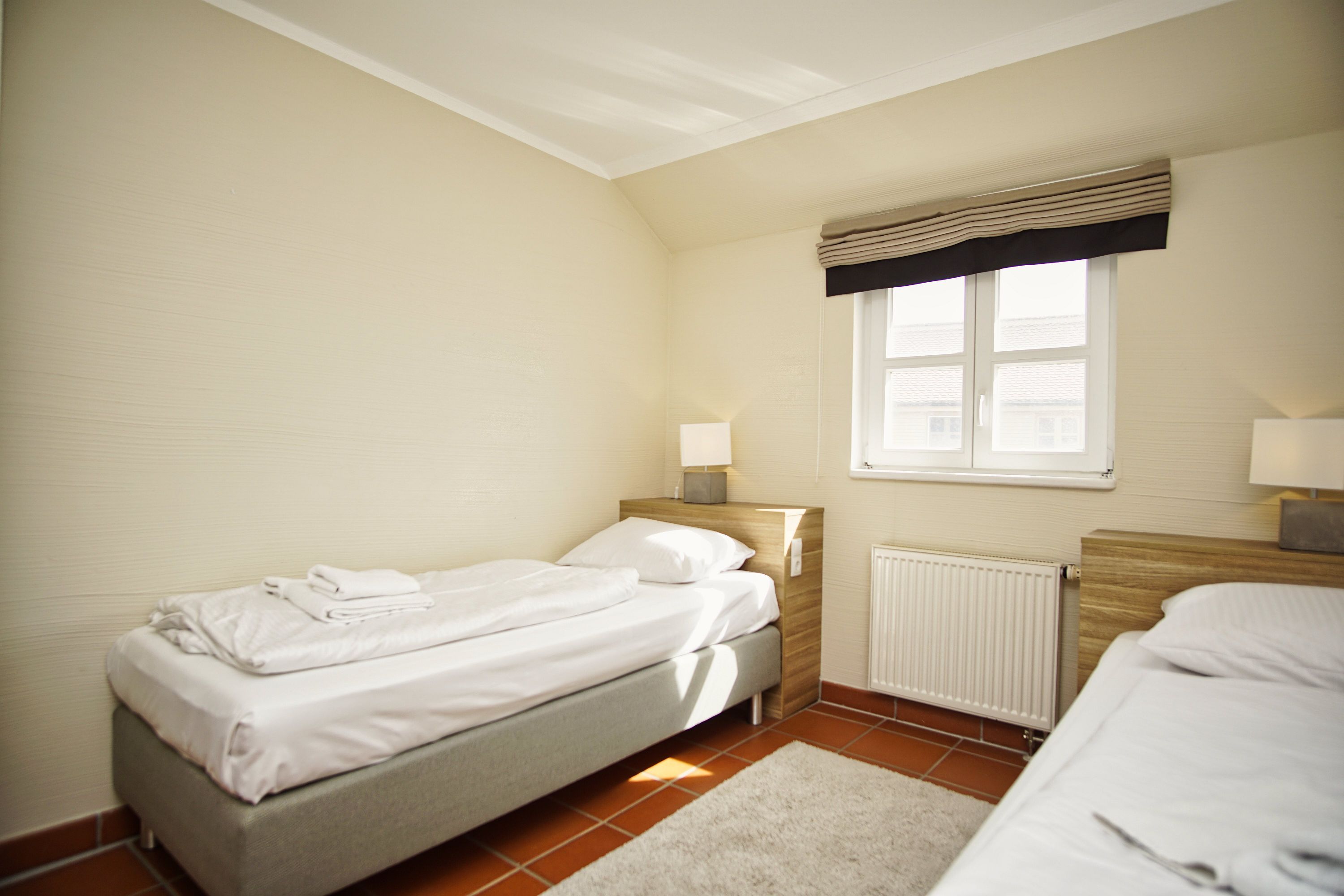 Die gemütliche Ferienwohnung erstreckt sich auf 2 Etagen. Auf ca. 75 m² haben bis zu 4 Personen und einem Kleinkind genügend Platz, um einen entspannten und erholsamen Urlaub auf Rügen verbringen zu können. Die moderne Ferienwohnung ist freundlich eingerichtet und lässt keine Wünsche offen. Im Wohnbereich befinden sich die bequeme und großzügige Couch, ein Essbereich sowie der Zugang zur eigenen Terrasse. Die Küche ist vollwertig ausgestattet. Nicht nur Küchenutensilien sind dort bestens untergebracht, sondern auch ein Backofen, eine Geschirrspülmaschine und eine Mikrowelle zählen hier zur Ausstattung. In der oberen Etage befinden sich die beiden separaten Schlafzimmer. Das eine hat ein Doppelbett und ein Kinderbett. Das zweite Schlafzimmer verfügt über zwei Einzelbetten. Im geräumigen Badezimmer befindet sich neben dem Waschtisch und WC auch die Dusch-Badewanne. Zudem befindet sich im Erdgeschoss noch ein Gäste-WC.