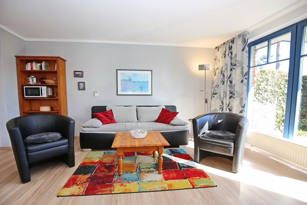 Die möblierte Terrasse ist zugänglich vom Wohnbereich und ermöglicht dir durch ihre sonnige Ausrichtung erholsame Stunden im Freien zu erleben. Das Wohnzimmer bietet ein Schlafsofa ( ) und eine Essecke für 4 Personen. Für Kurzweil sorgen ein Flachbild-TV und ein Radio mit CD-Funktion.