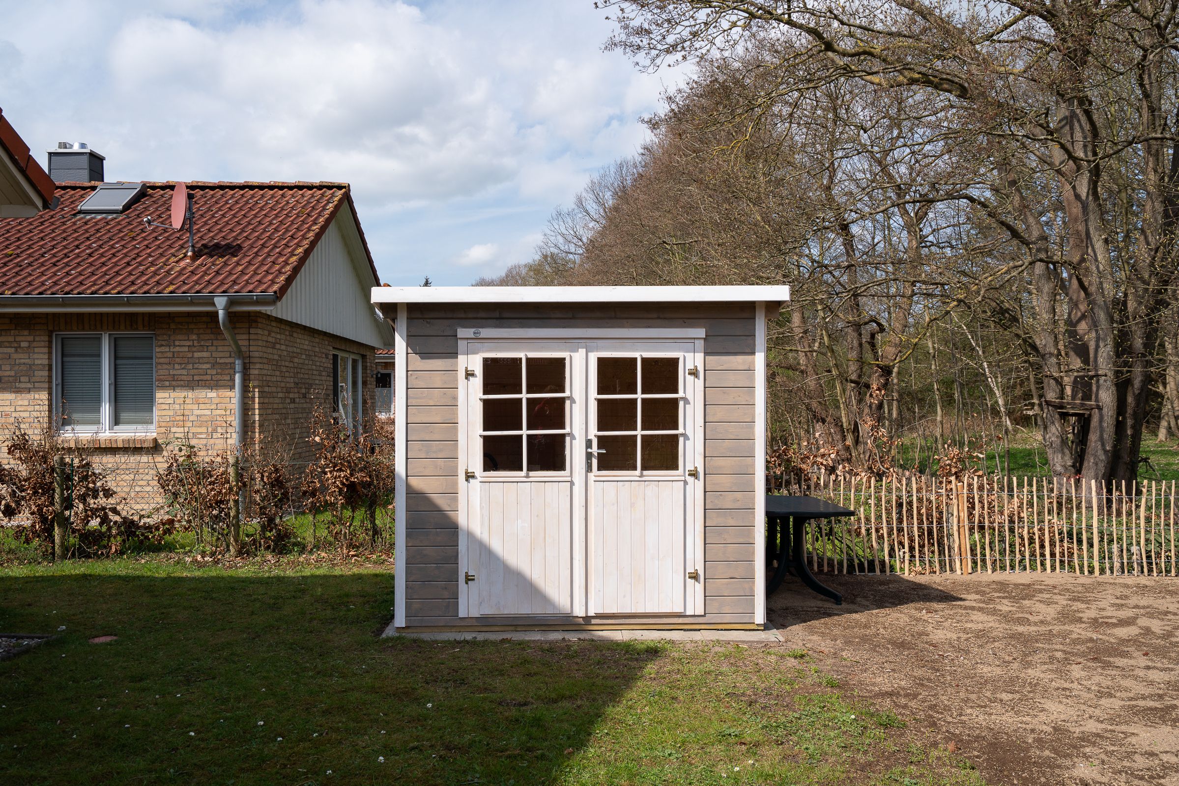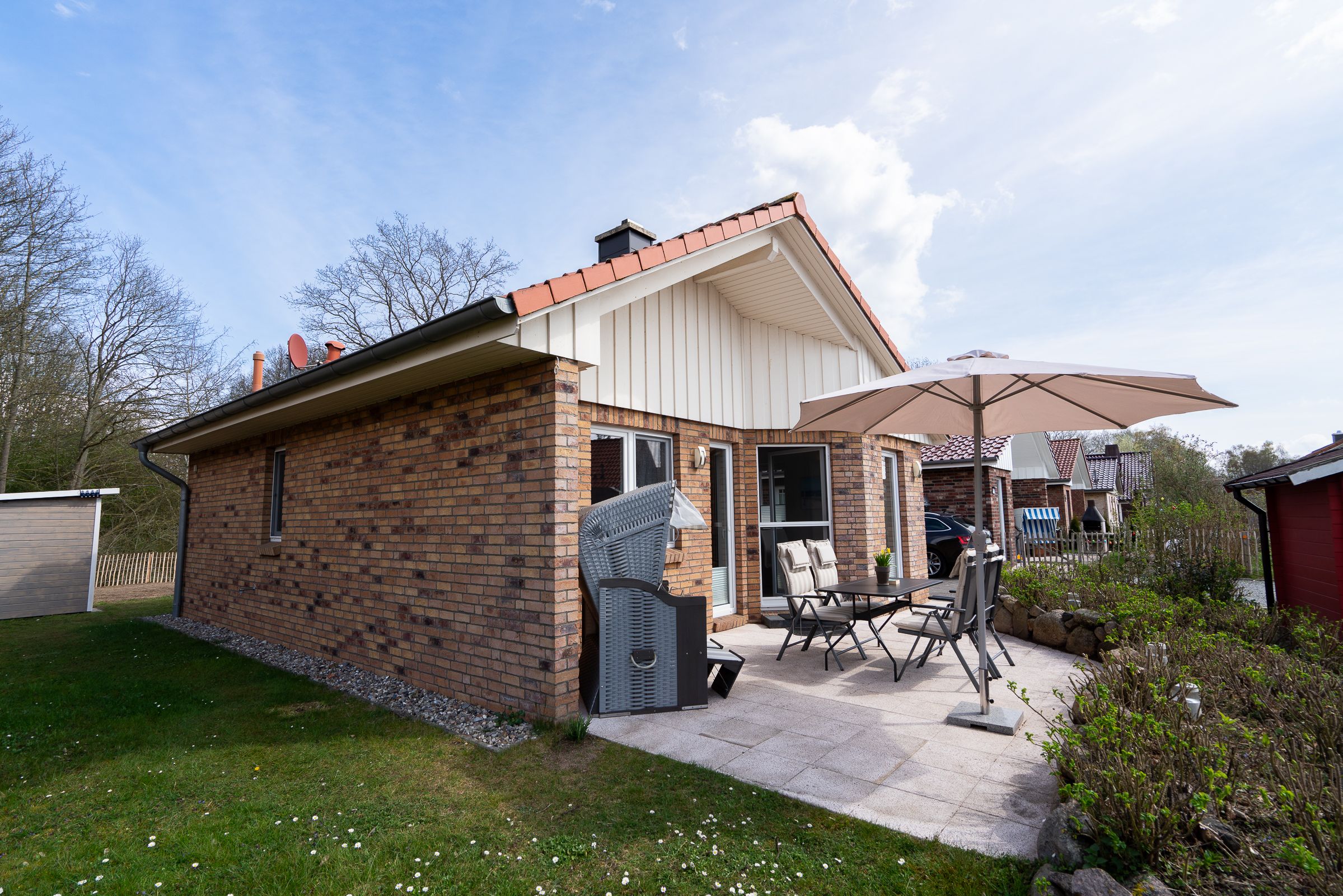 Auf der Sonnenterrasse erwarten Sie zum Relaxen Gartenmöbel, ein Grill und ein Strandkorb. Im Gartenhaus ist Platz für mitgebrachte Fahrräder.
