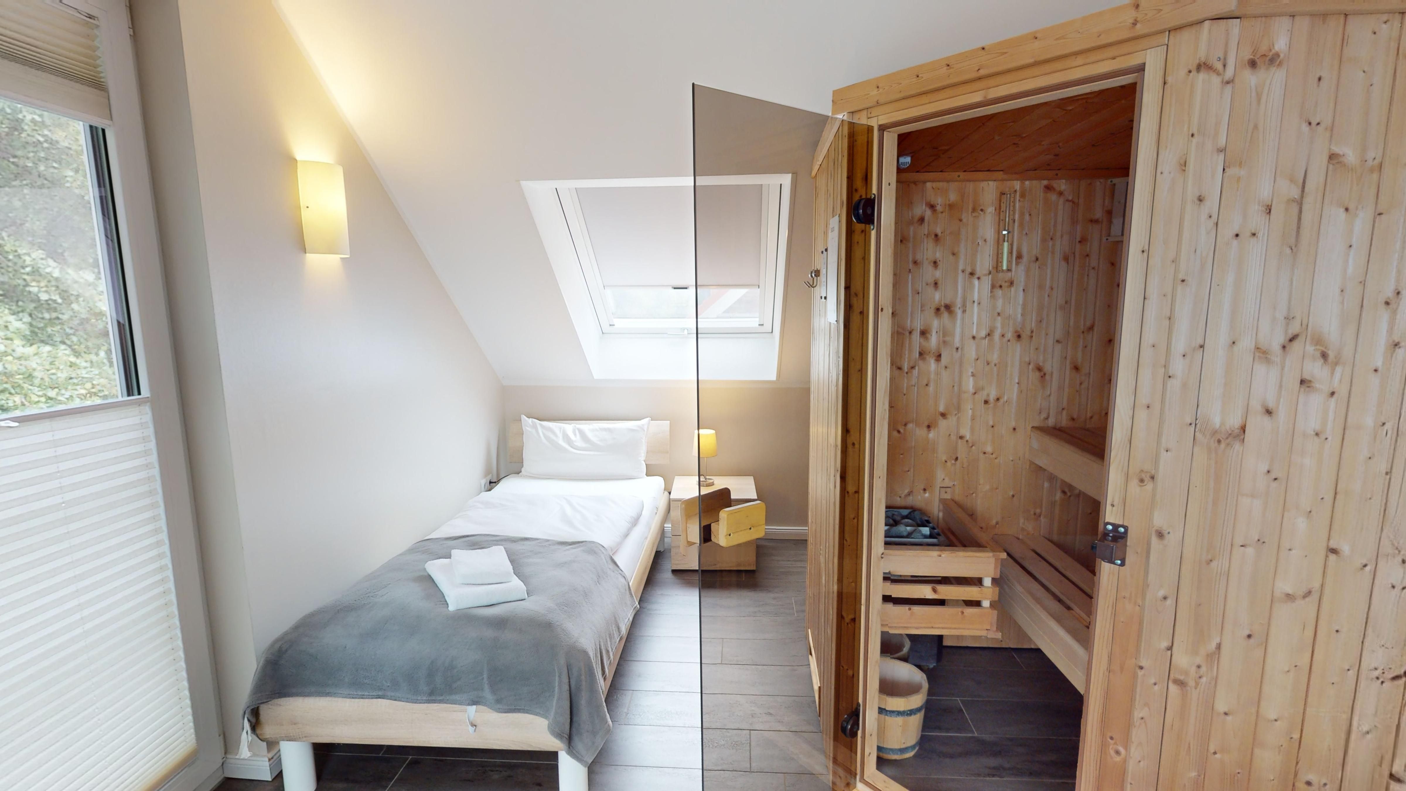 Das Haus bietet einen geschmackvoll eingerichteten Wohn-/Essbereich mit Kaminofen sowie eine angrenzende moderne Küche. Zwei Schlafzimmer mit je einem Doppelbett im Erdgeschoss sowie ein Schlafzimmer mit Doppelbett, ein offener Schlafplatz mit zwei Einzelbetten, ein Duschbad mit WC sowie eine separate Sauna im Obergeschoss runden das Feriendomizil ab