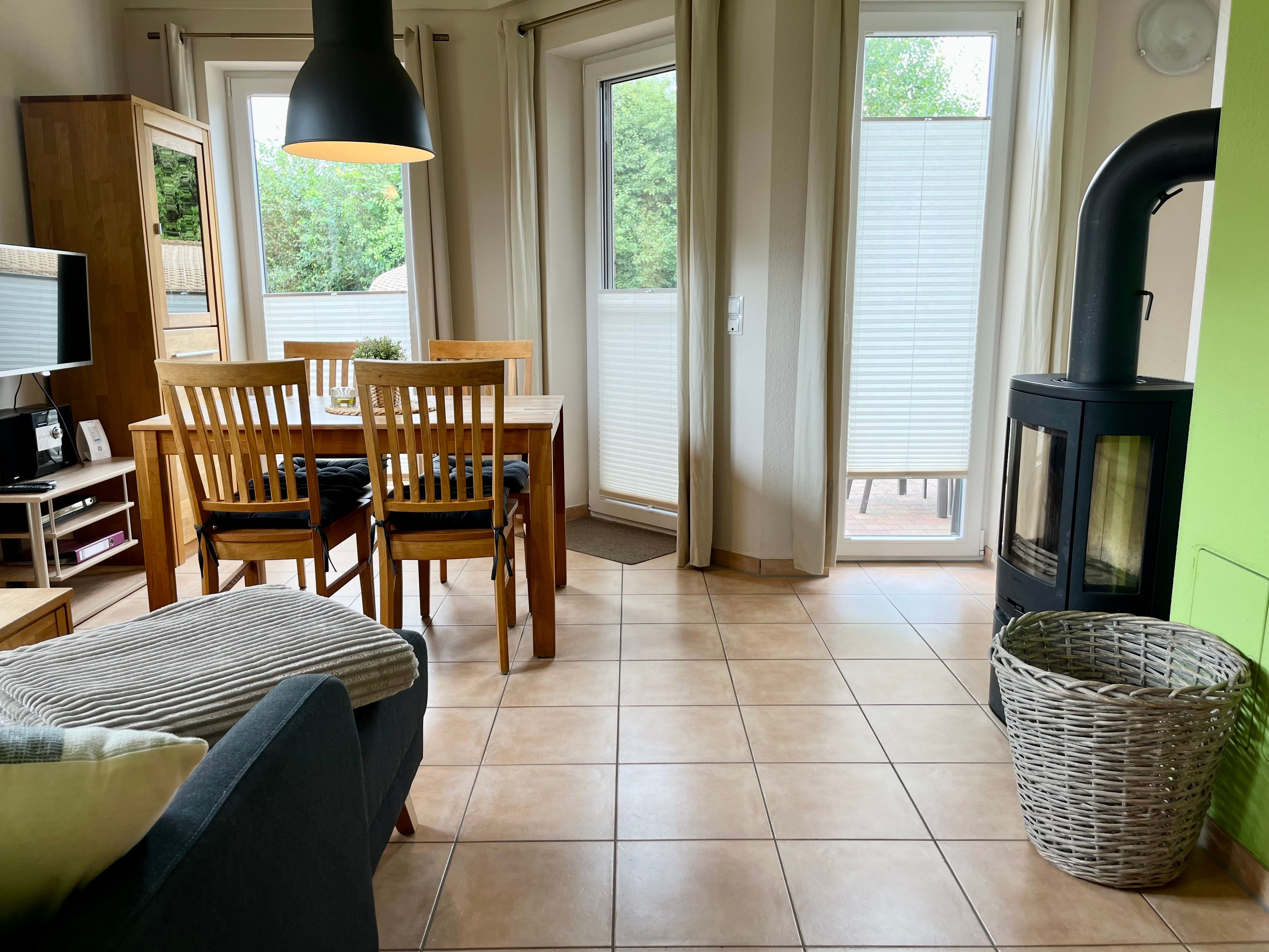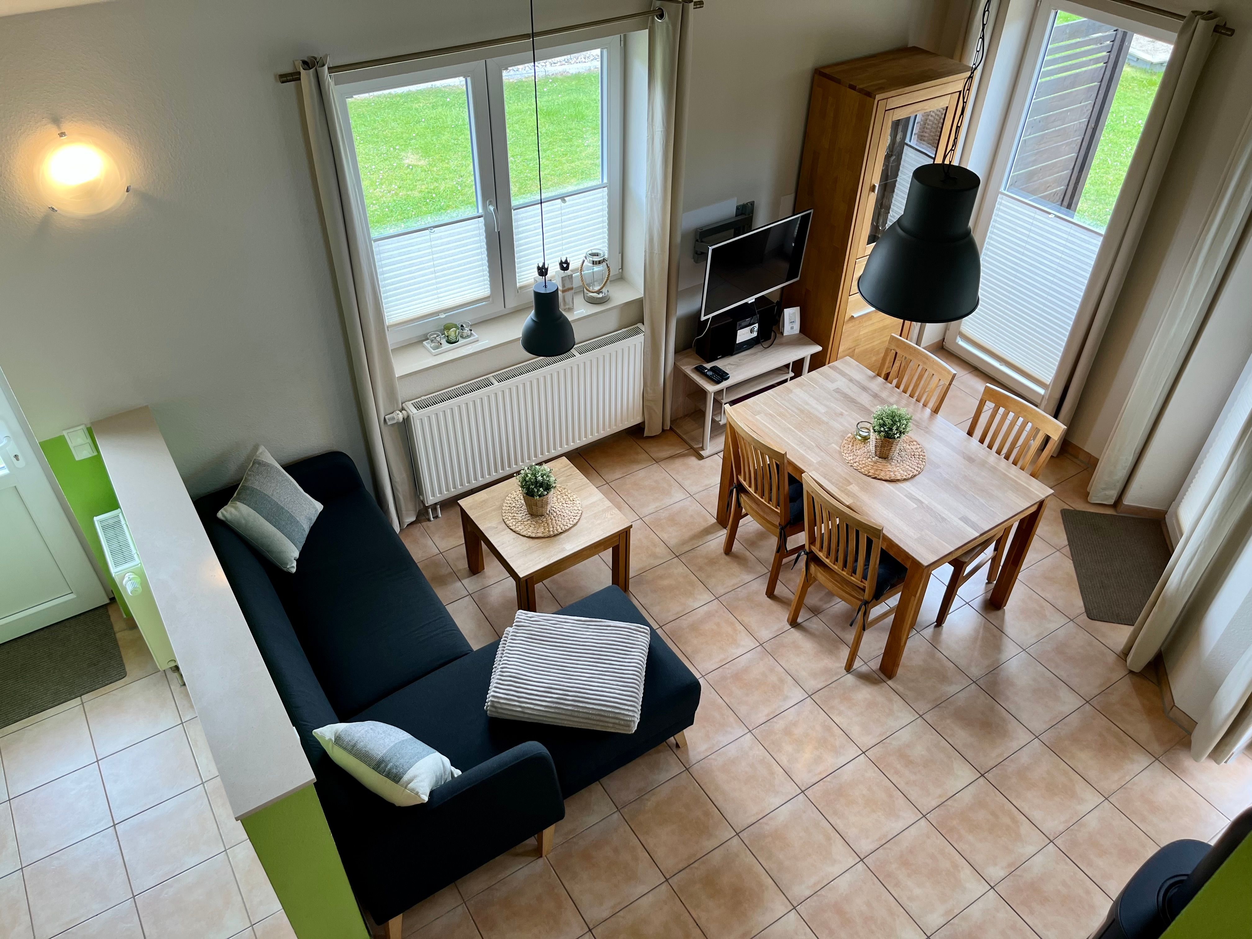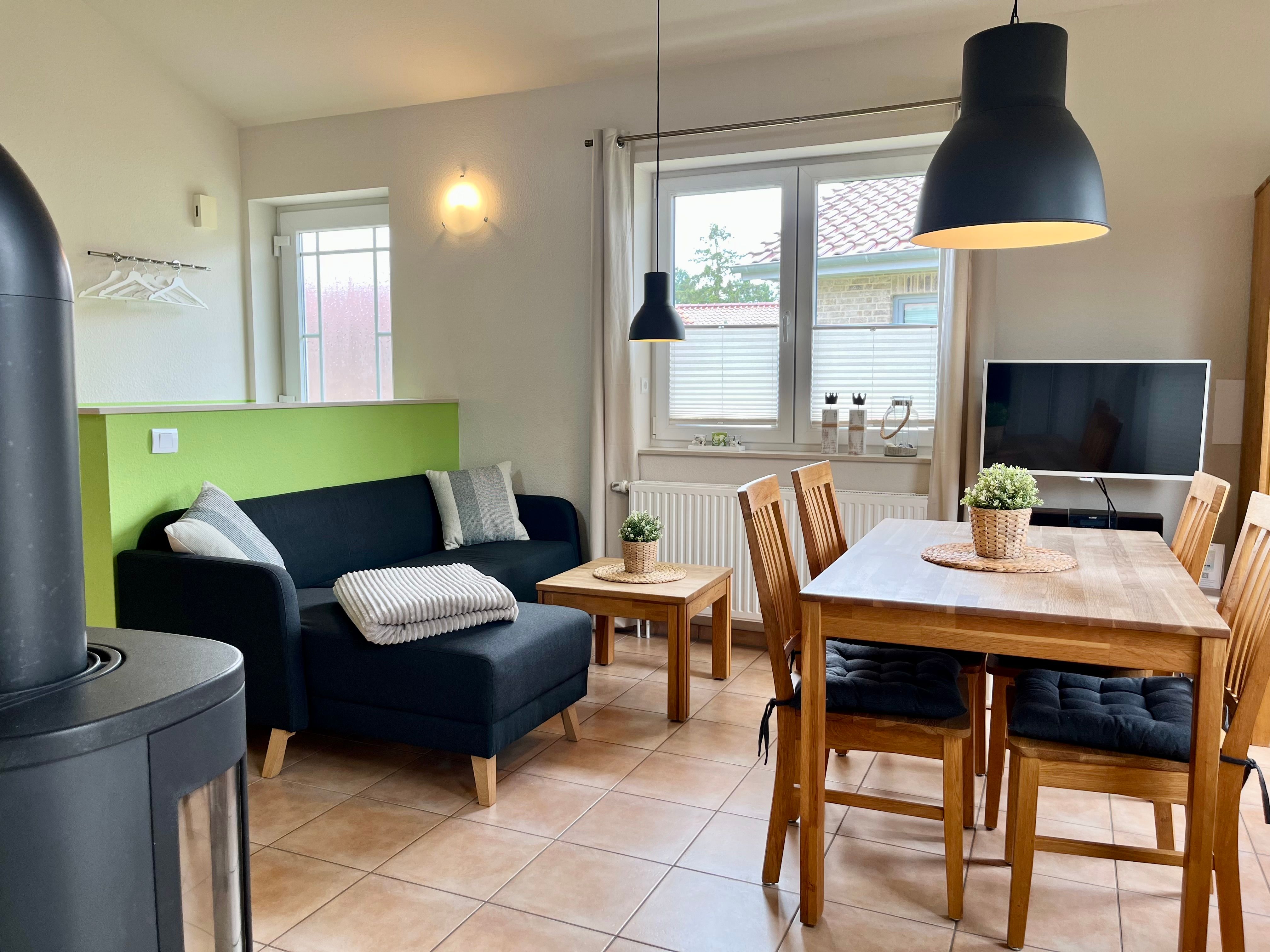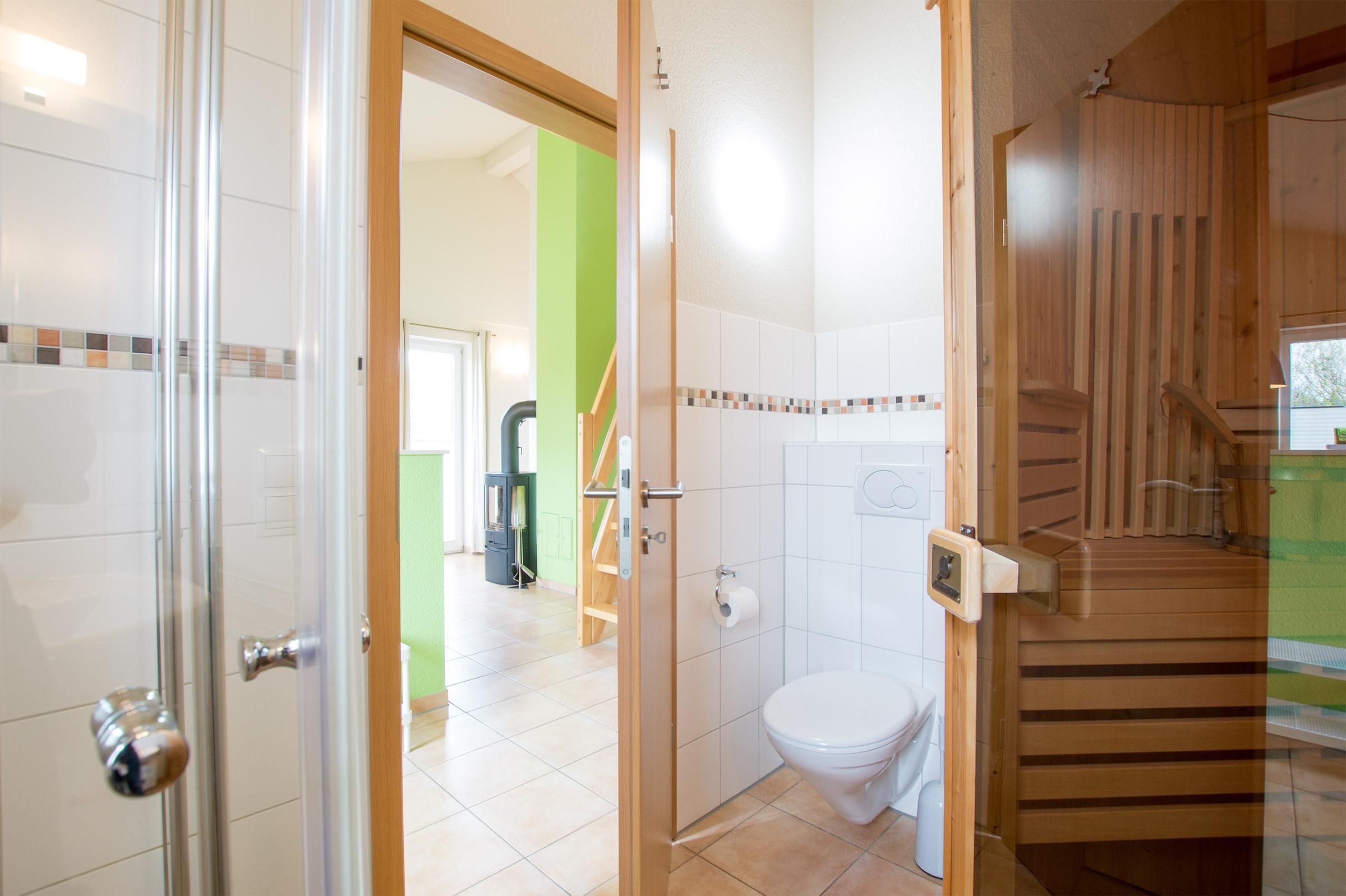 Ein heller, schöner Wohn-/Essbereich mit Kaminofen, zwei Schlafzimmer - eins mit Doppelbett und eins mit zwei gemütlichen Einzelbetten -, das helle Duschbad mit eigener Sauna, sowie die moderne, reichlich ausgestattete Küche laden zum Urlauben ein. Außerdem gibt es einen Zugang zur Schlafgalerie, ein Hit für Kinder!