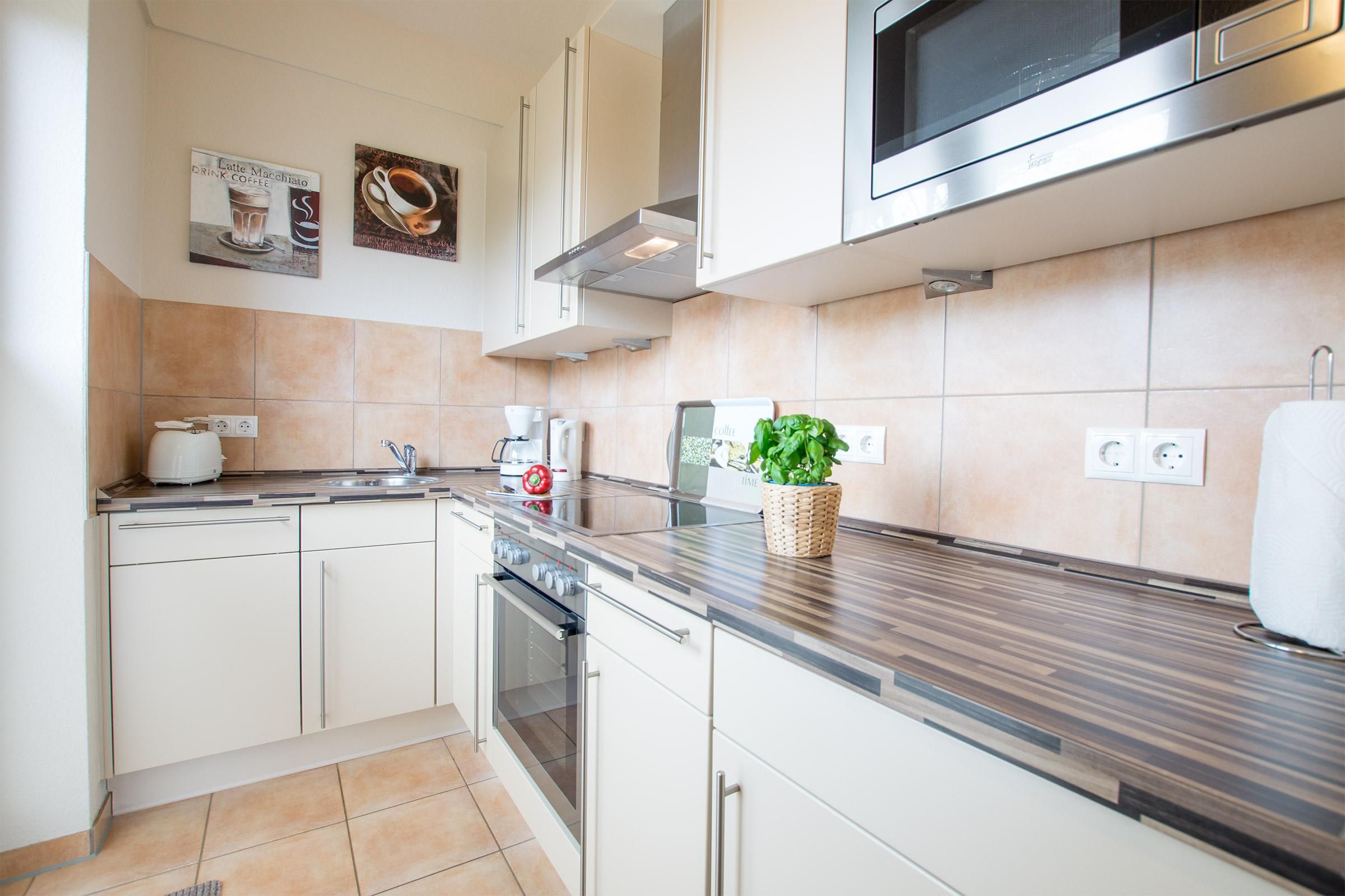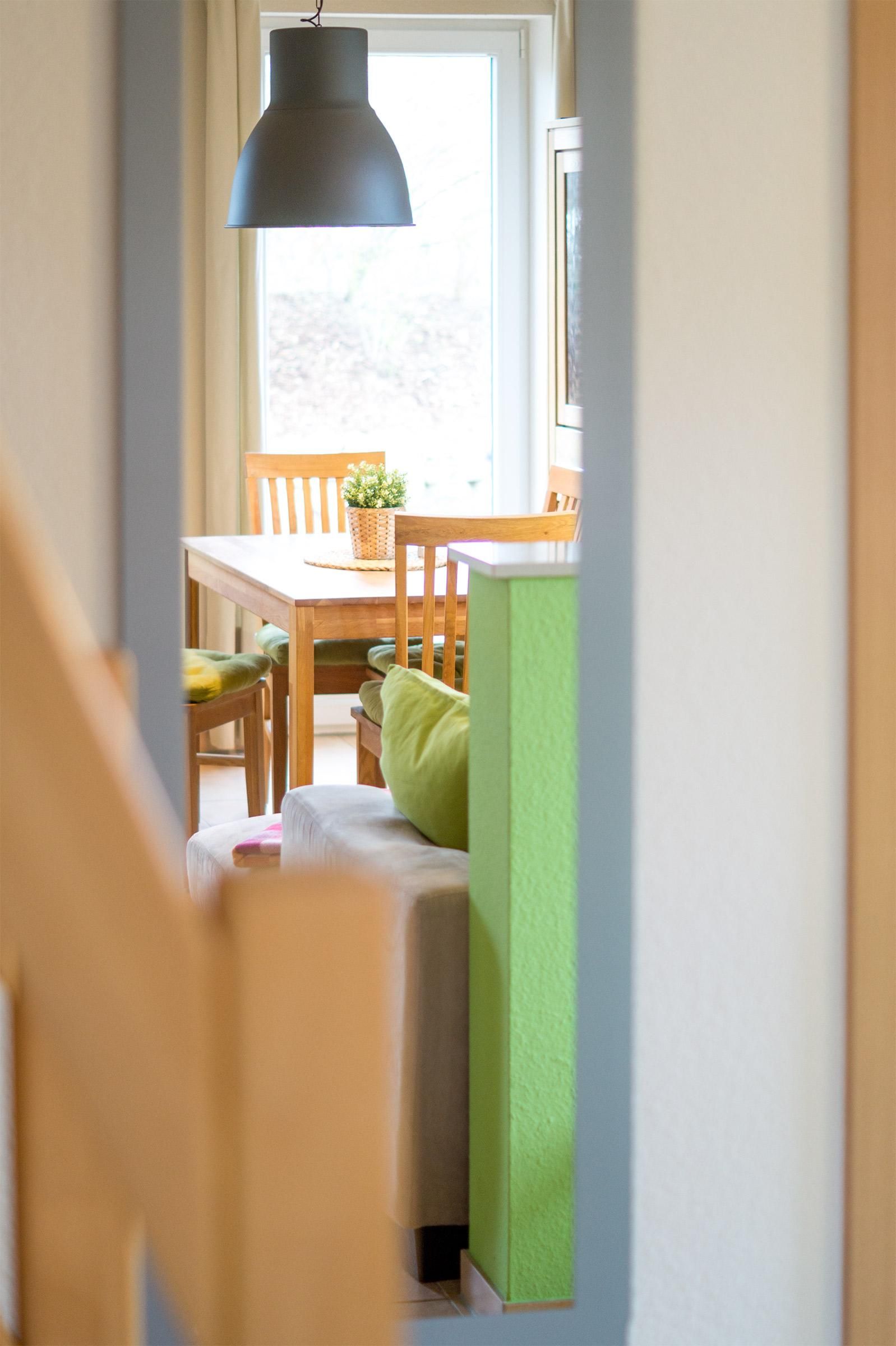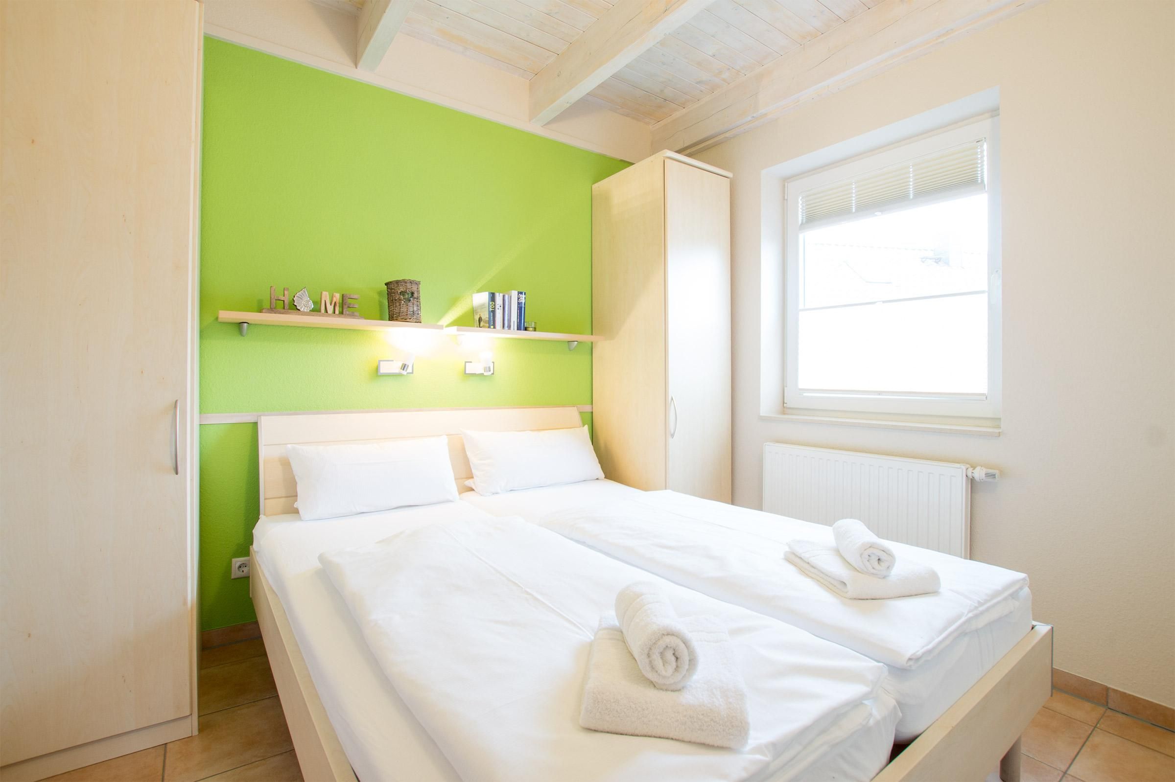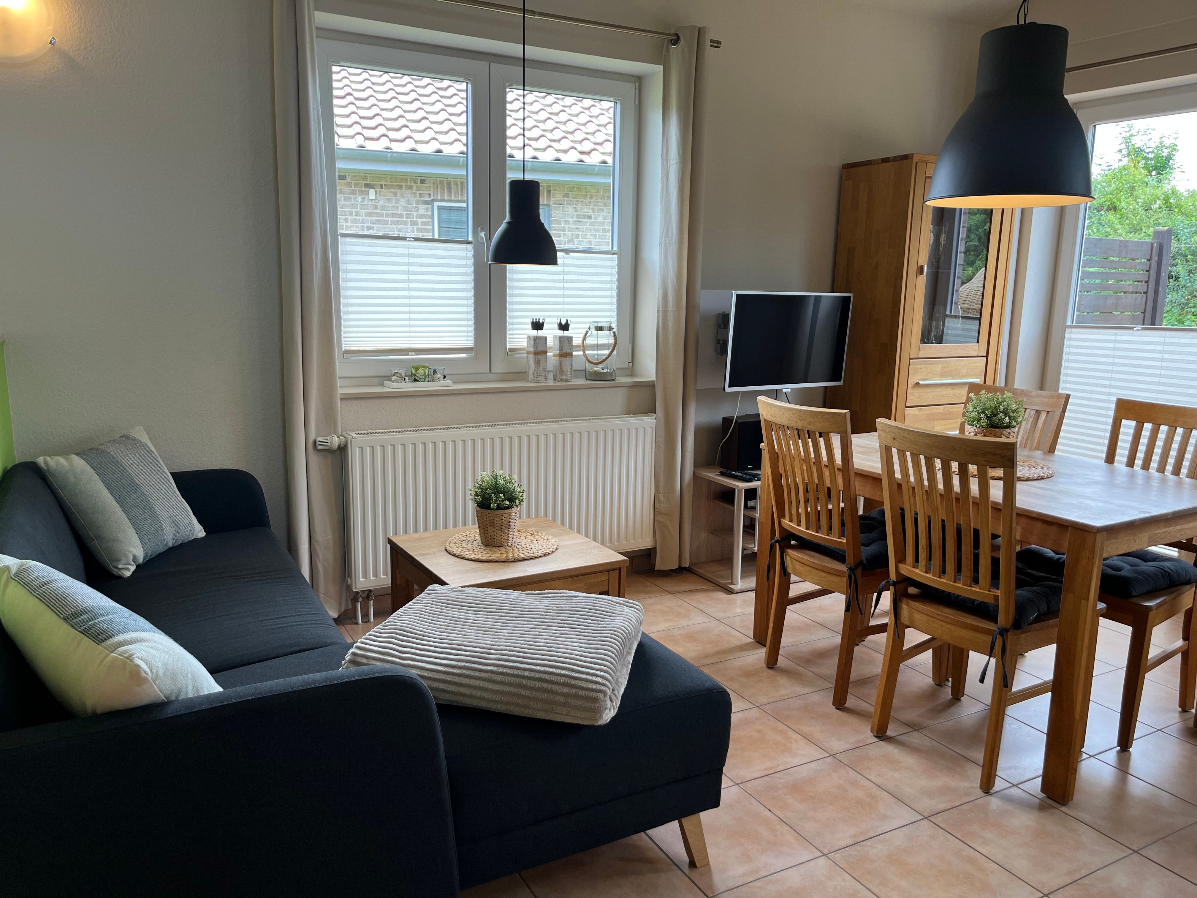 Ein heller, schöner Wohn-/Essbereich mit Kaminofen, zwei Schlafzimmer - eins mit Doppelbett und eins mit zwei gemütlichen Einzelbetten -, das helle Duschbad mit eigener Sauna, sowie die moderne, reichlich ausgestattete Küche laden zum Urlauben ein. Außerdem gibt es einen Zugang zur Schlafgalerie, ein Hit für Kinder!