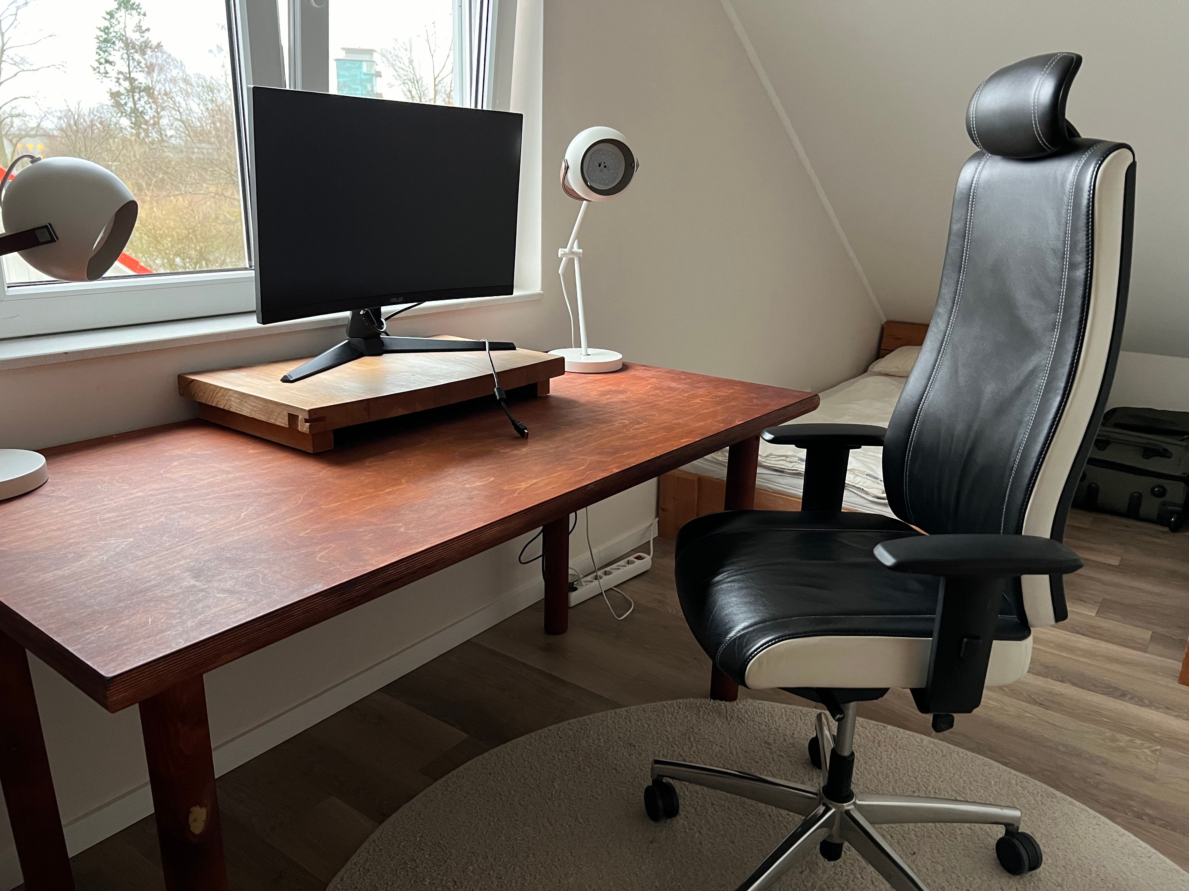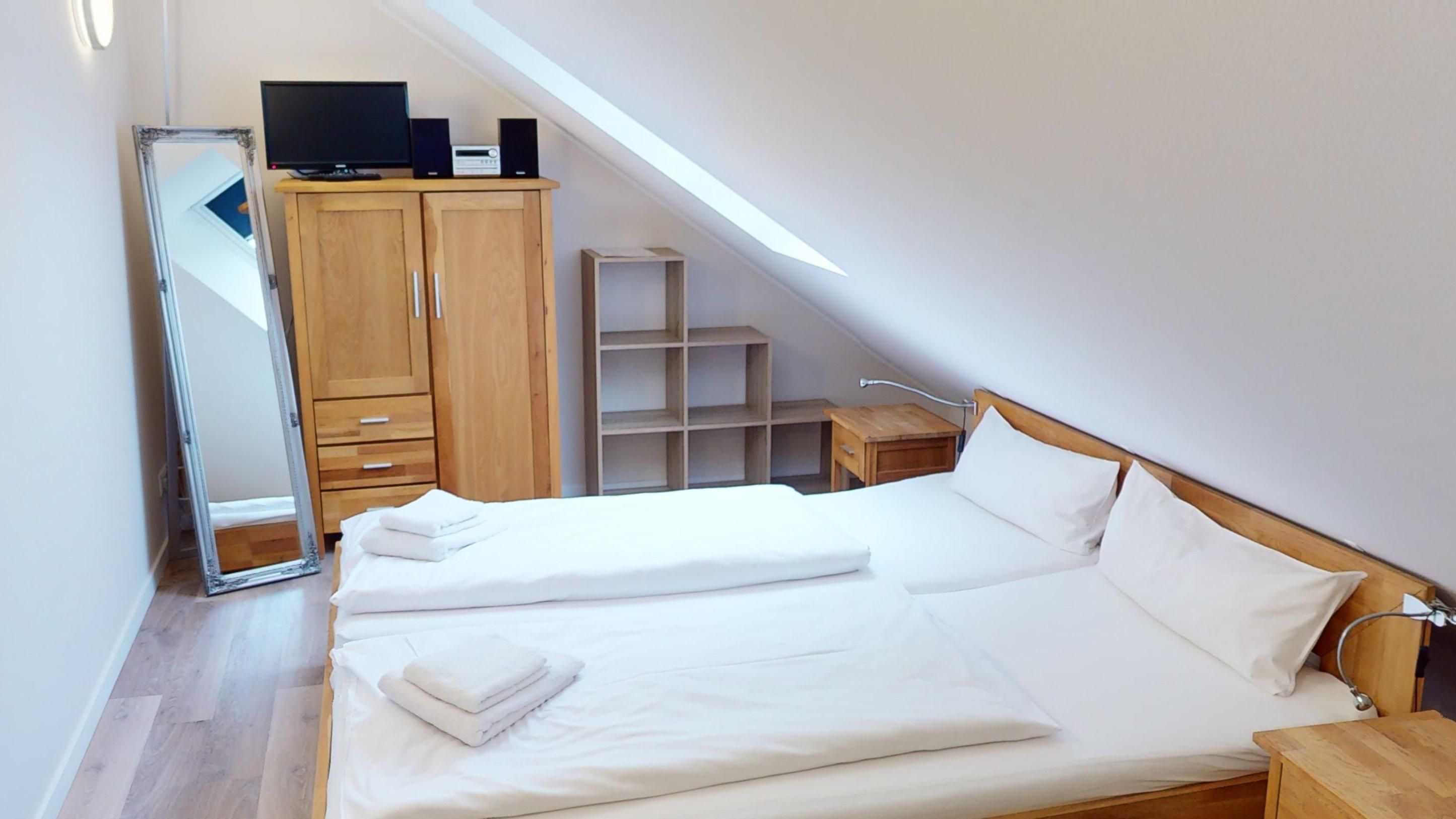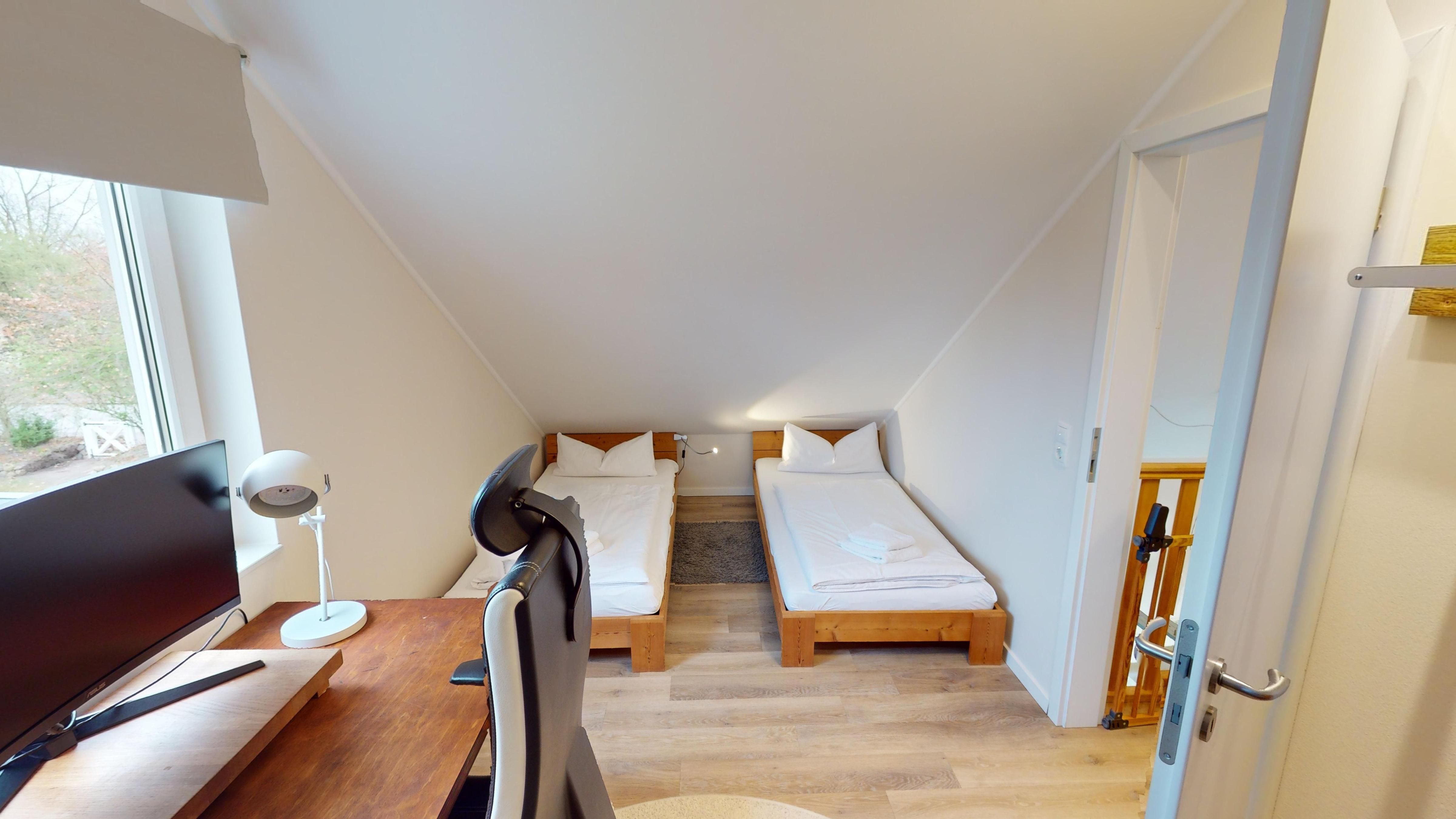 Im oberen Stockwerk befinden sich zwei weitere Schlafzimmer - eins mit einem Doppelbett, das andere mit zwei Einzelbetten sowie ein Futon, der sich für weitere Übernachtungsgäste eignet. In dem Raum mit den Einzelbetten ist auch ein Home-Office-Arbeitsplatz mit Schreibtisch, Bürostuhl und externem Bildschirm eingerichtet. Ein Breitband-Internetanschluss steht für TV-Streaming und/oder Video-Conferencing bereit. Internet-Geschwindigkeit (ohne Gewähr): Die Download-Geschwindigkeit variiert zwischen 210 und 290 Mbit/s, während die Upload-Geschwindigkeit zwischen 90 und 130 Mbit/s liegt. Die Treppe ist recht steil und hat schmale Stufen.