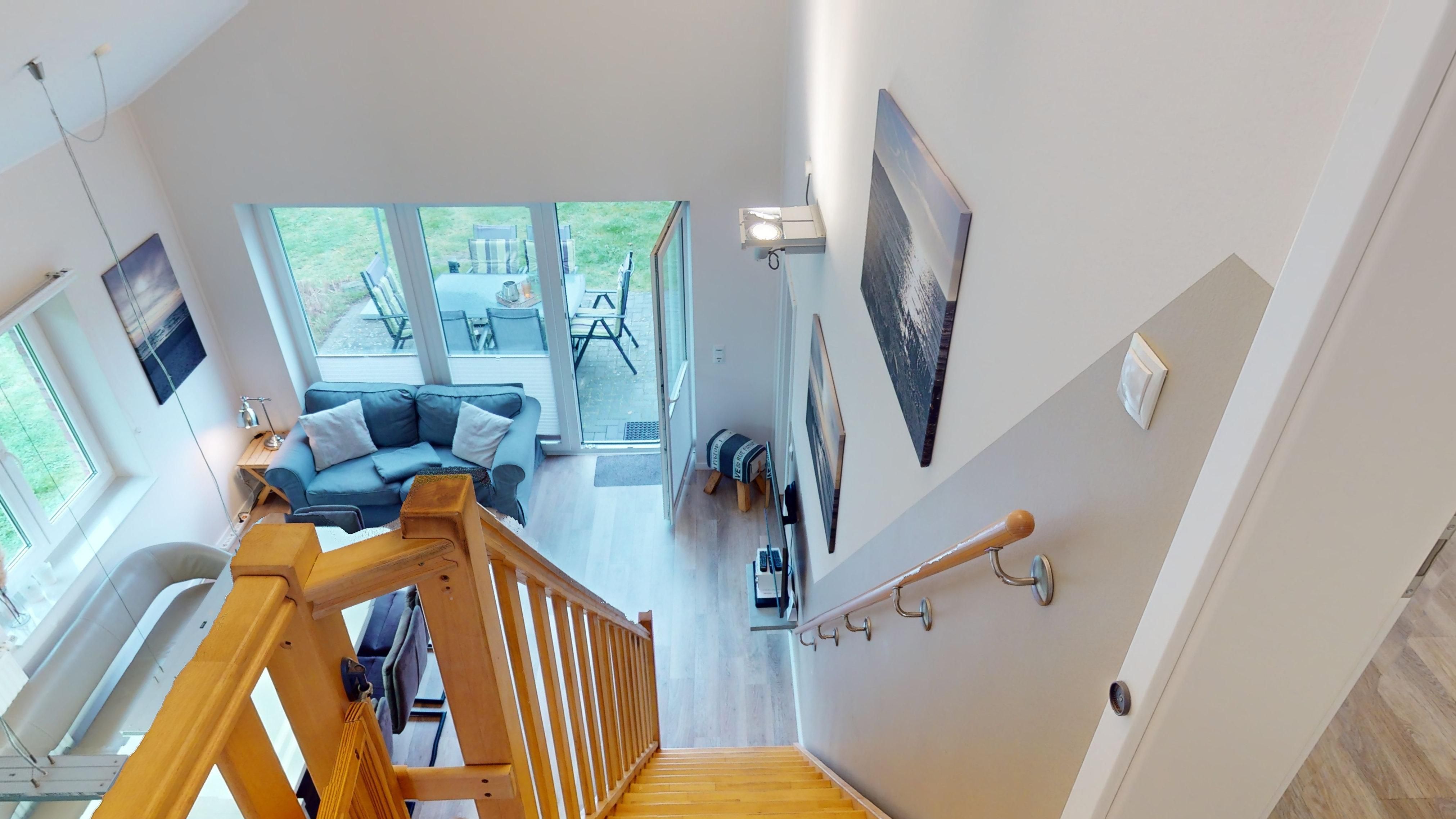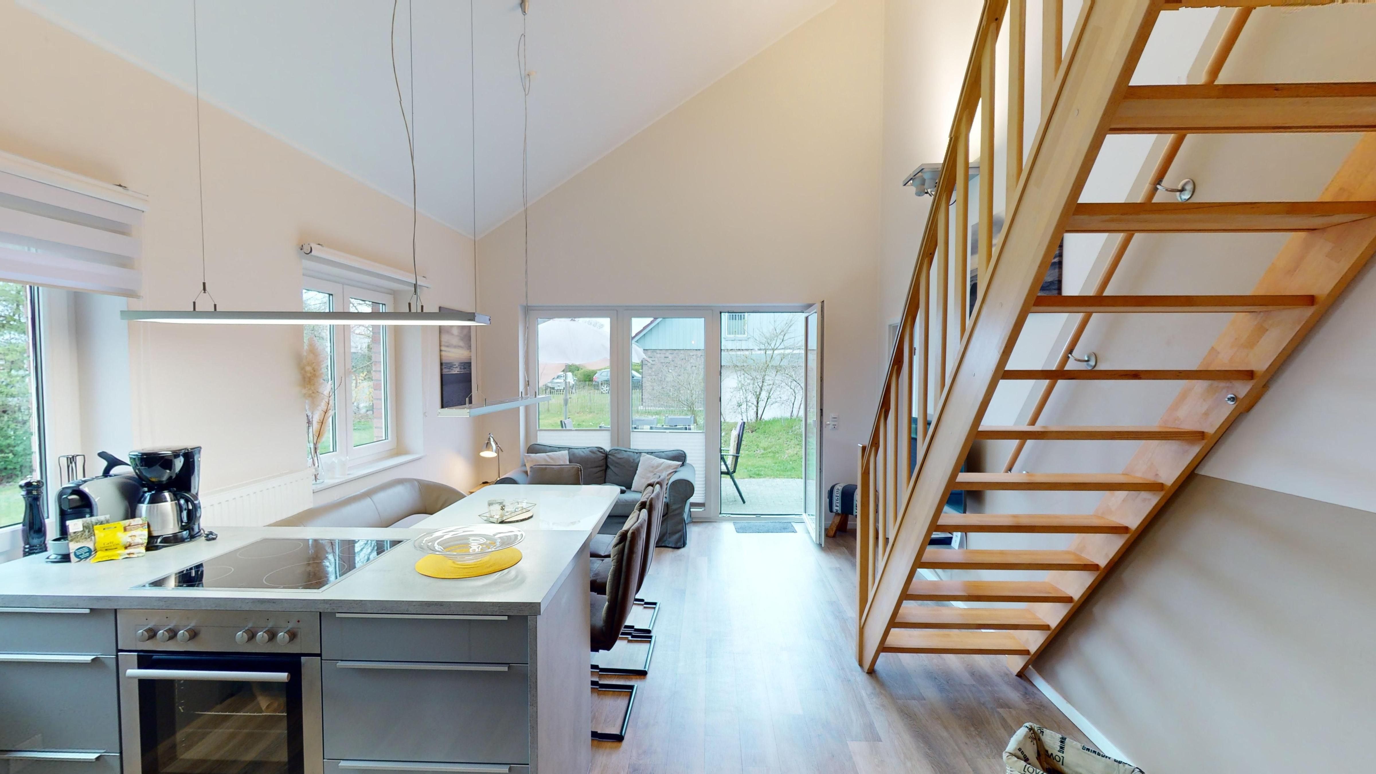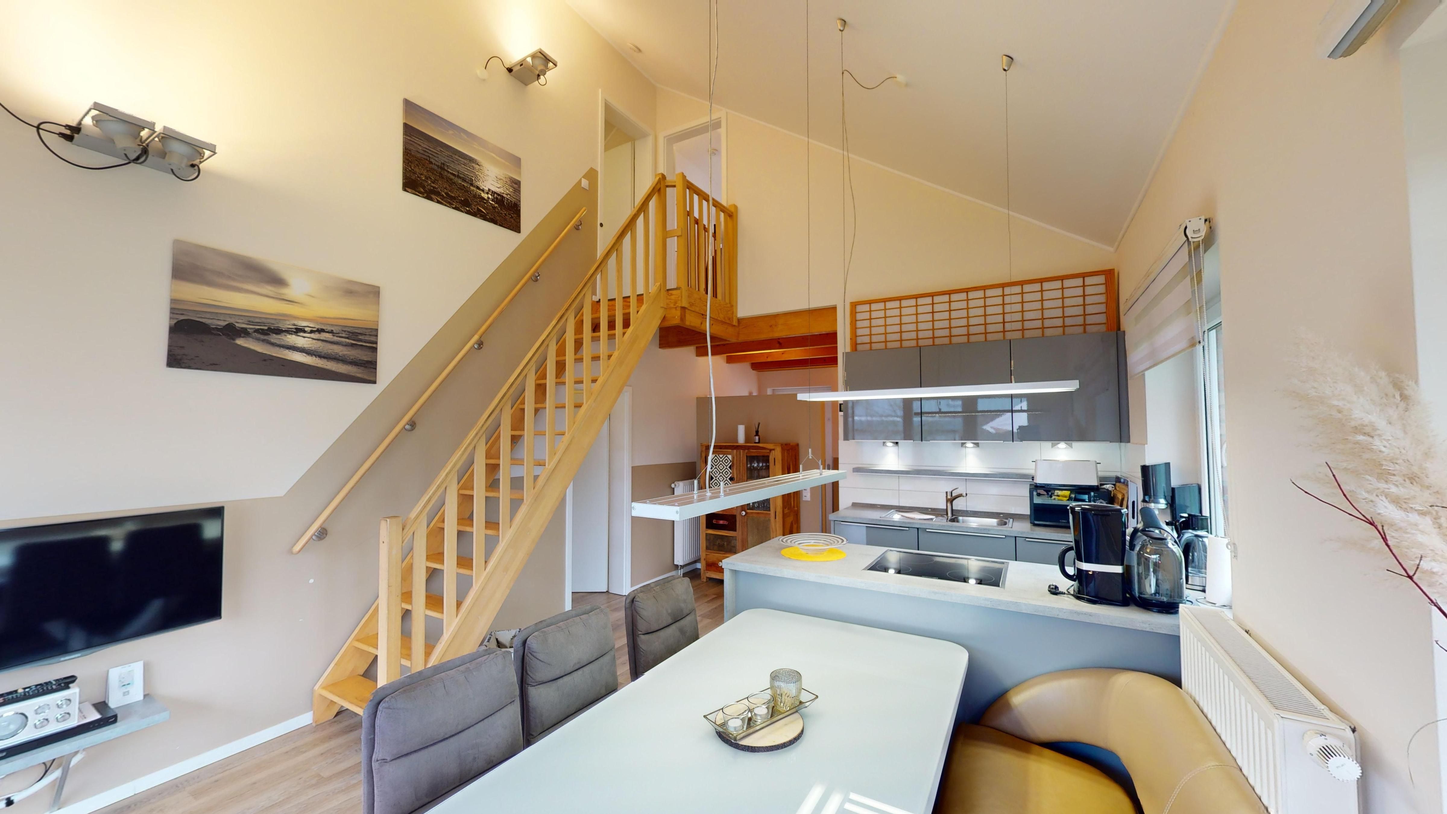 Im Erdgeschoss erwartet Sie ein lichtdurchfluteter Wohn- /Essbereich sowie eine offene, sehr gut ausgestattete Küche. Ein Schlafzimmer mit einem Doppelbett, ein weiterer Raum mit einer Schlafcouch für zwei Personen, ein großzügiges Duschbad sowie ein Gäste-WC vervollständigen das Erdgeschoss. Der Raum mit Schlafcouch kann auch als kleines Wohnzimmer genutzt werden (inkl. TV). Im Raum mit dem Gäste-WC befindet sich auch ein zweiter Kühlschrank inkl. Gefrierfach.