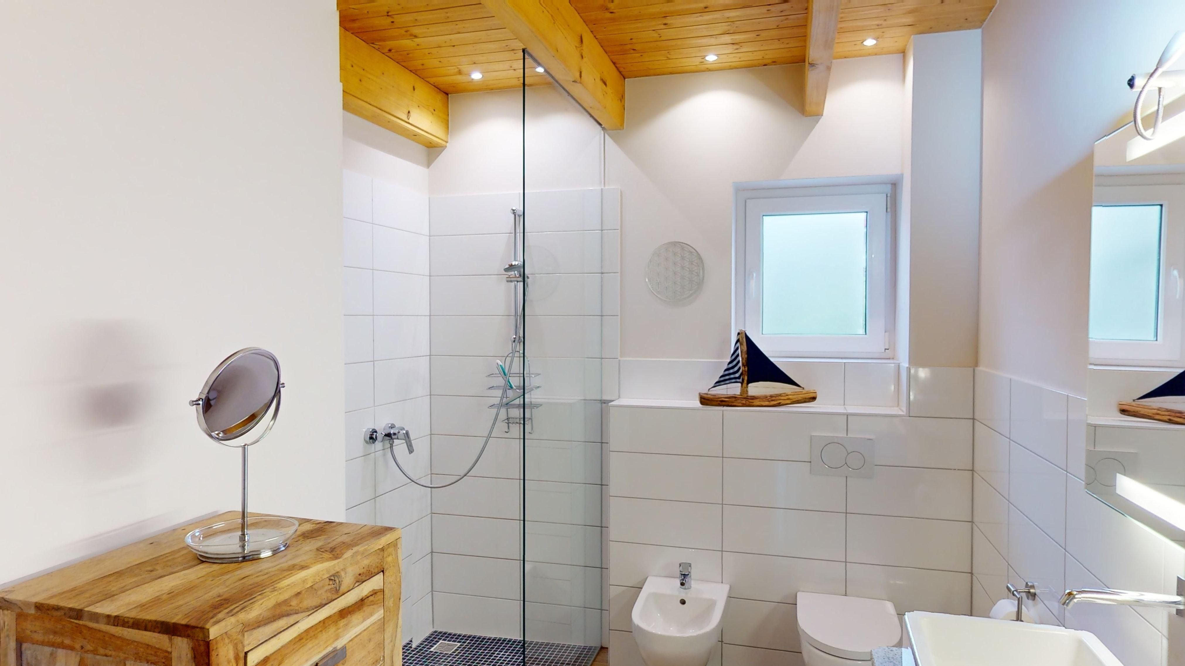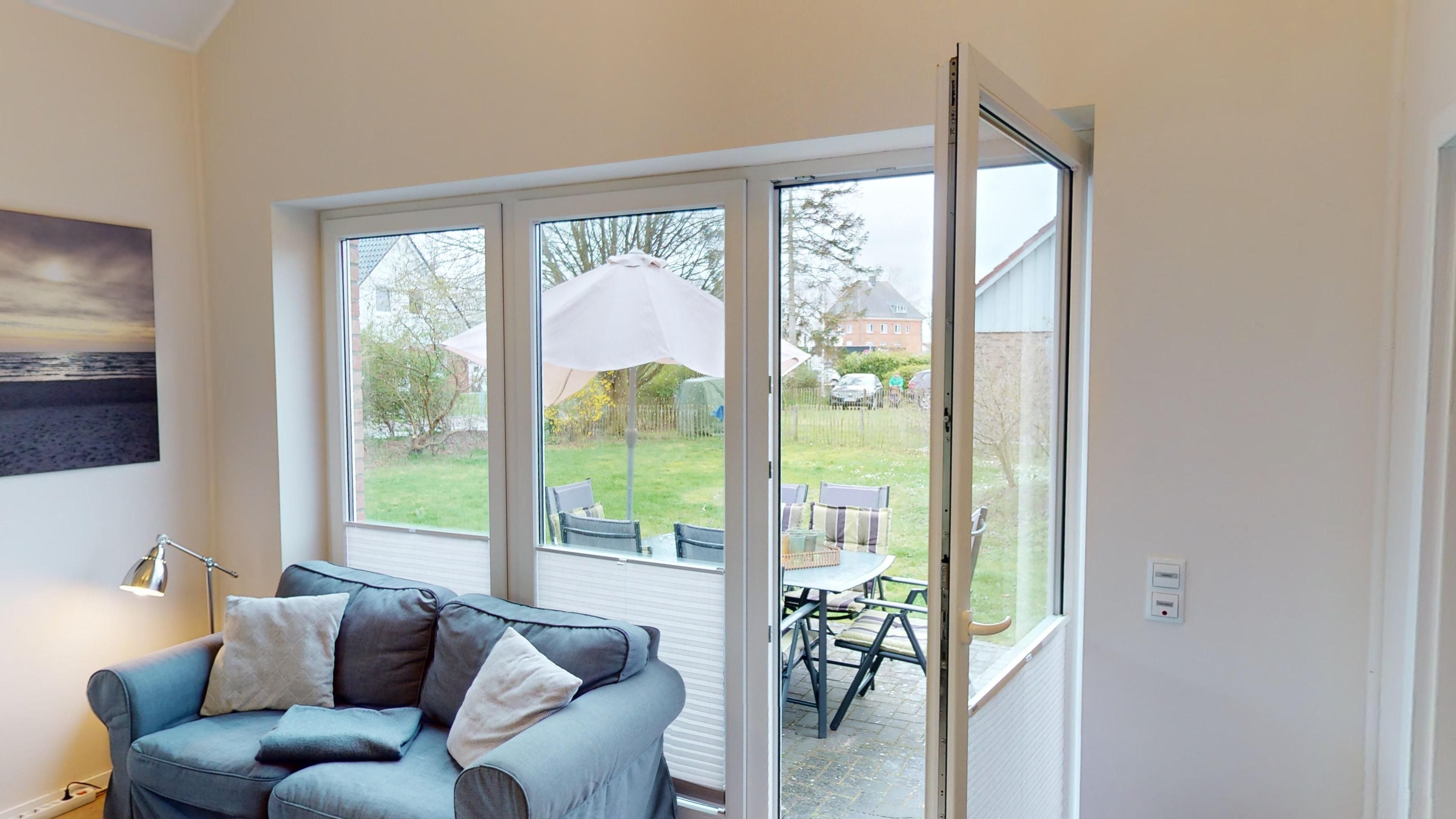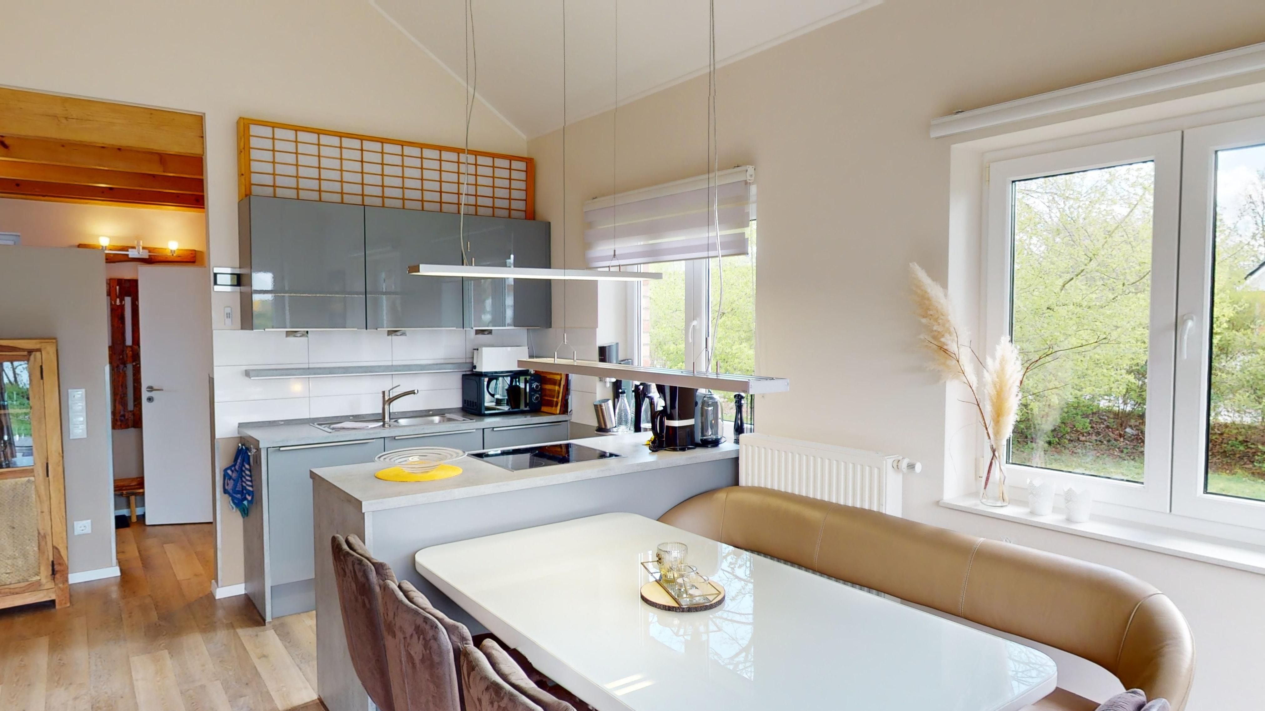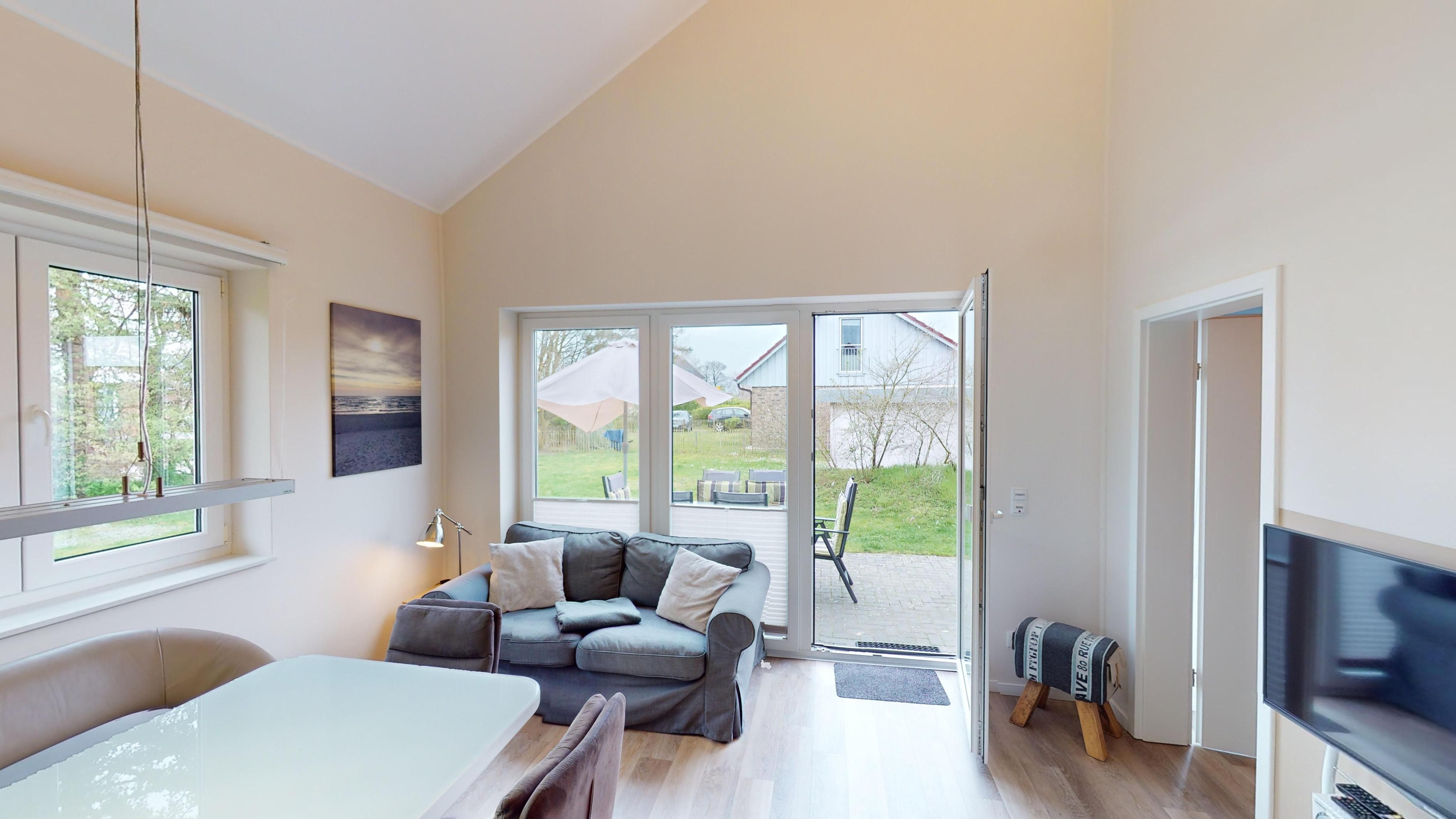Im Erdgeschoss erwartet Sie ein lichtdurchfluteter Wohn- /Essbereich sowie eine offene, sehr gut ausgestattete Küche. Ein Schlafzimmer mit einem Doppelbett, ein weiterer Raum mit einer Schlafcouch für zwei Personen, ein großzügiges Duschbad sowie ein Gäste-WC vervollständigen das Erdgeschoss. Der Raum mit Schlafcouch kann auch als kleines Wohnzimmer genutzt werden (inkl. TV). Im Raum mit dem Gäste-WC befindet sich auch ein zweiter Kühlschrank inkl. Gefrierfach.