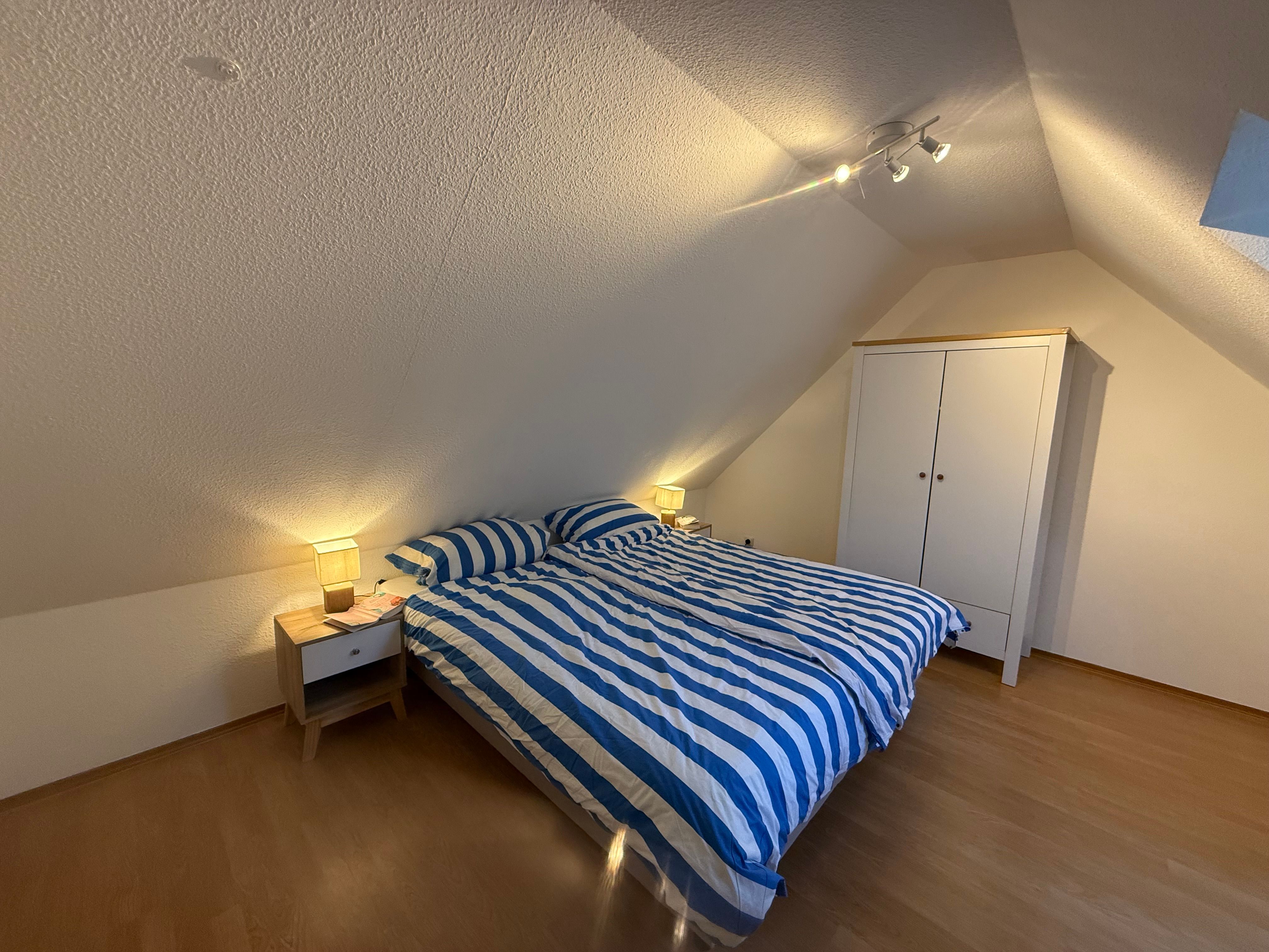 Im Obergeschoss befinden sich zwei separate Schlafzimmer, die sowohl Eltern als auch Kindern Privatsphäre und Rückzugsmöglichkeiten bieten. Ein modernes Bad mit Dusche ergänzt die Ausstattung und sorgt für zusätzlichen Komfort.
