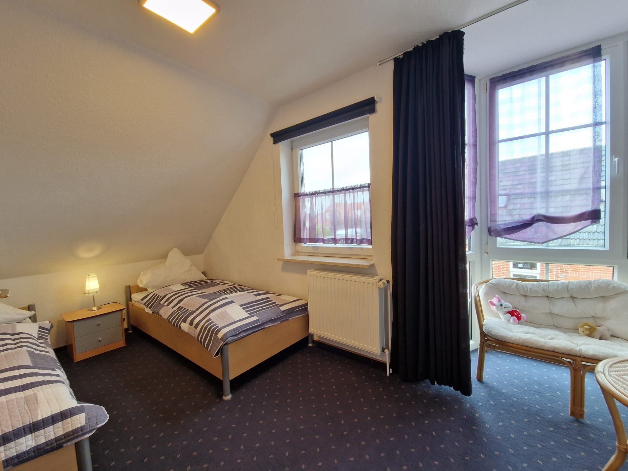 Im Obergeschoss befinden sich drei liebevoll eingerichtete Schlafzimmer, die Platz für bis zu sechs Personen bieten. Bequeme Betten, freundliche Farben und eine ruhige Atmosphäre sorgen für erholsamen Schlaf nach einem Tag an der frischen Nordseeluft.