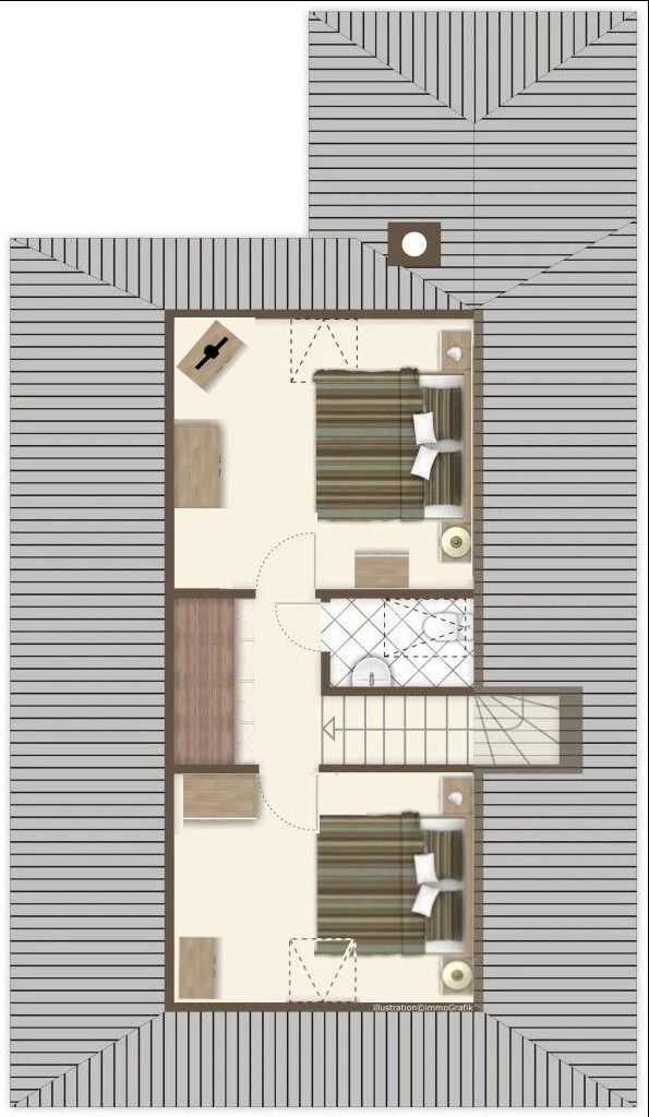 Einzelbetten samt Duschbad. Im Obergeschoss sind das Elternschlafzimmer mit