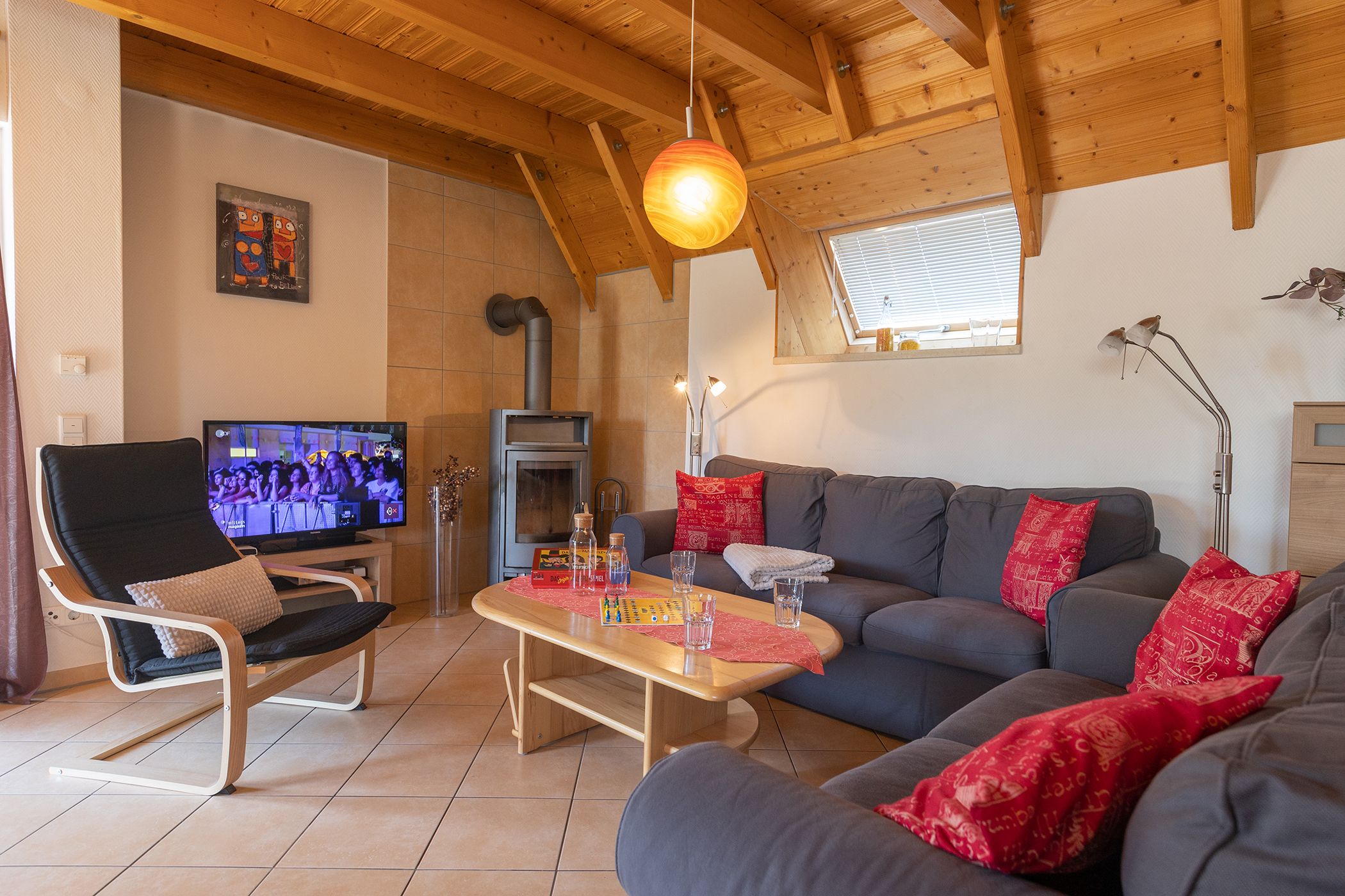 Erdgeschoss befinden sich ein Wohn-Esszimmer mit Couchgarnitur und Kaminofen
