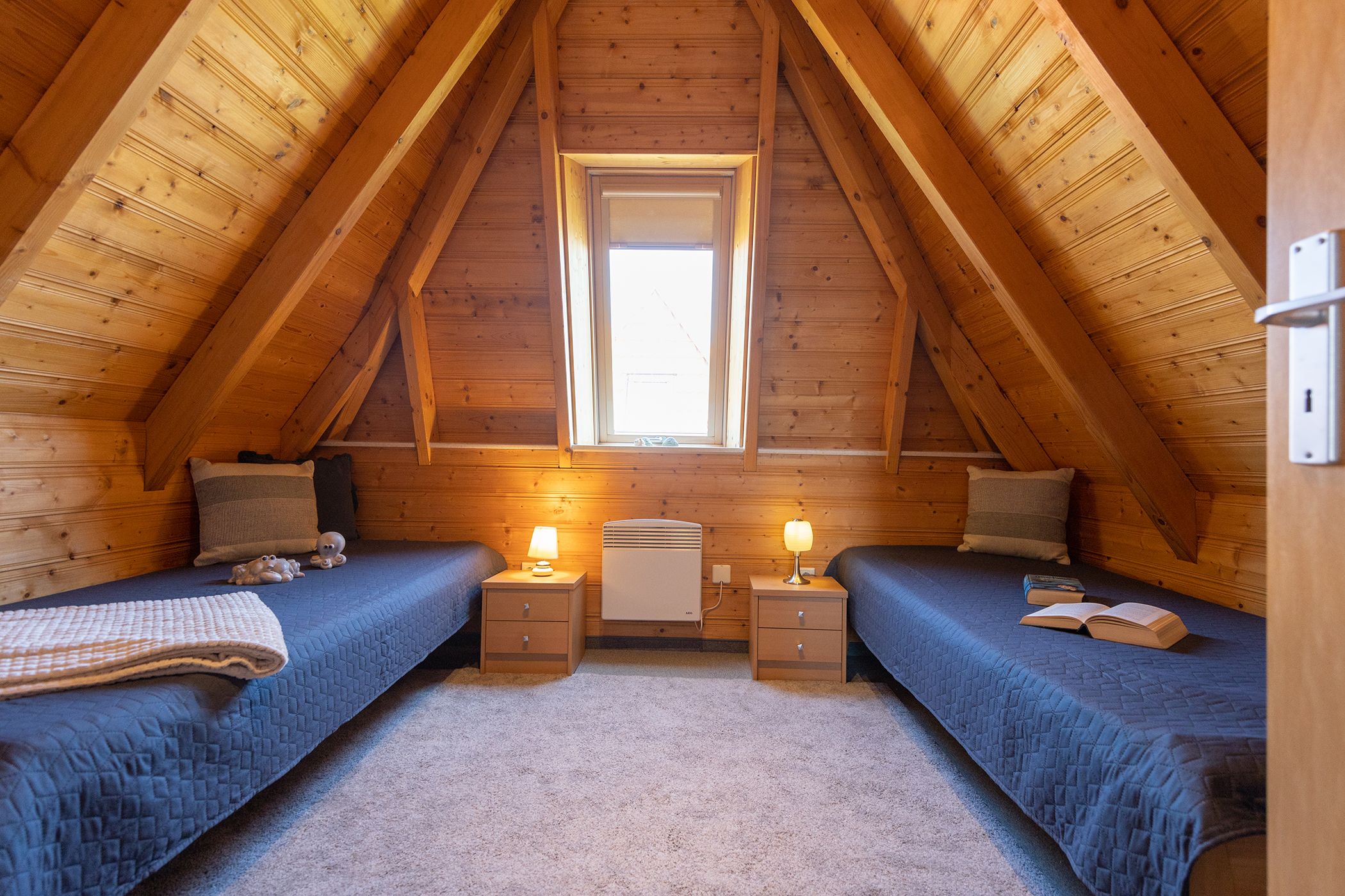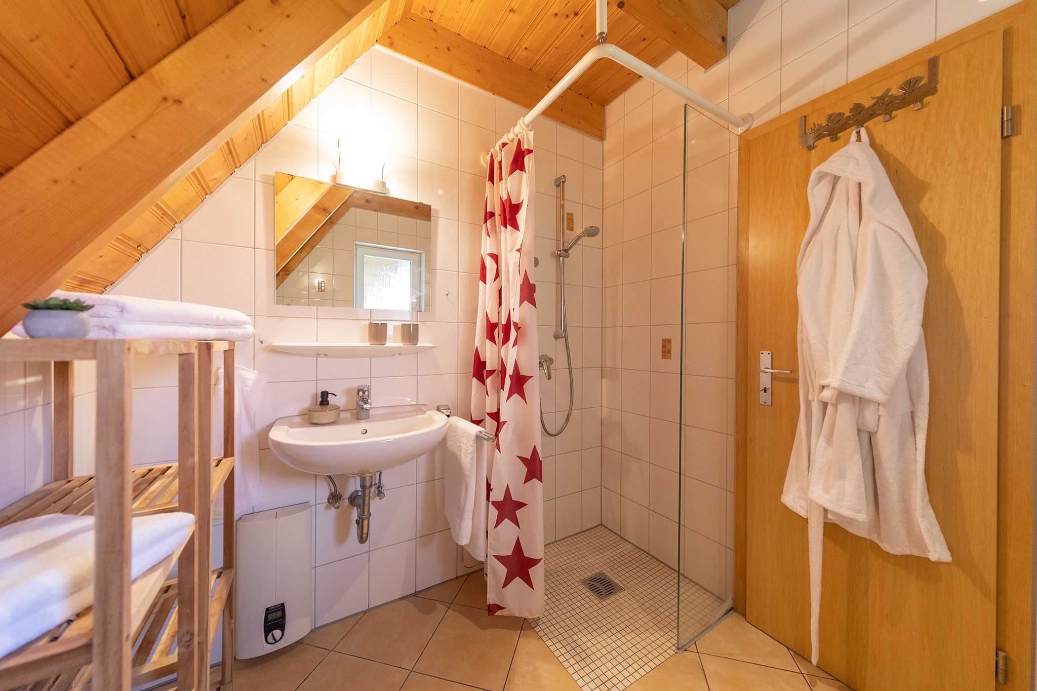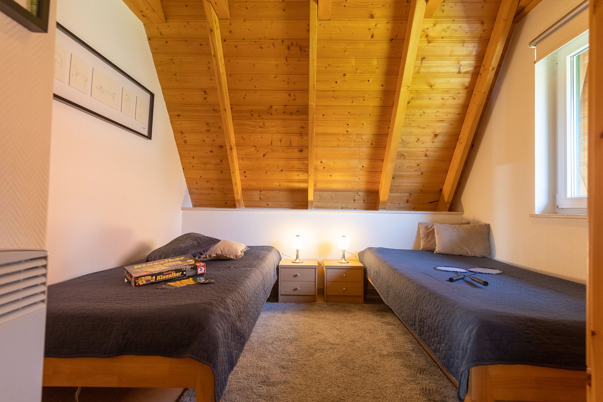 Einzelbetten samt Duschbad inklusive Waschmaschine. Im Obergeschoss sind das