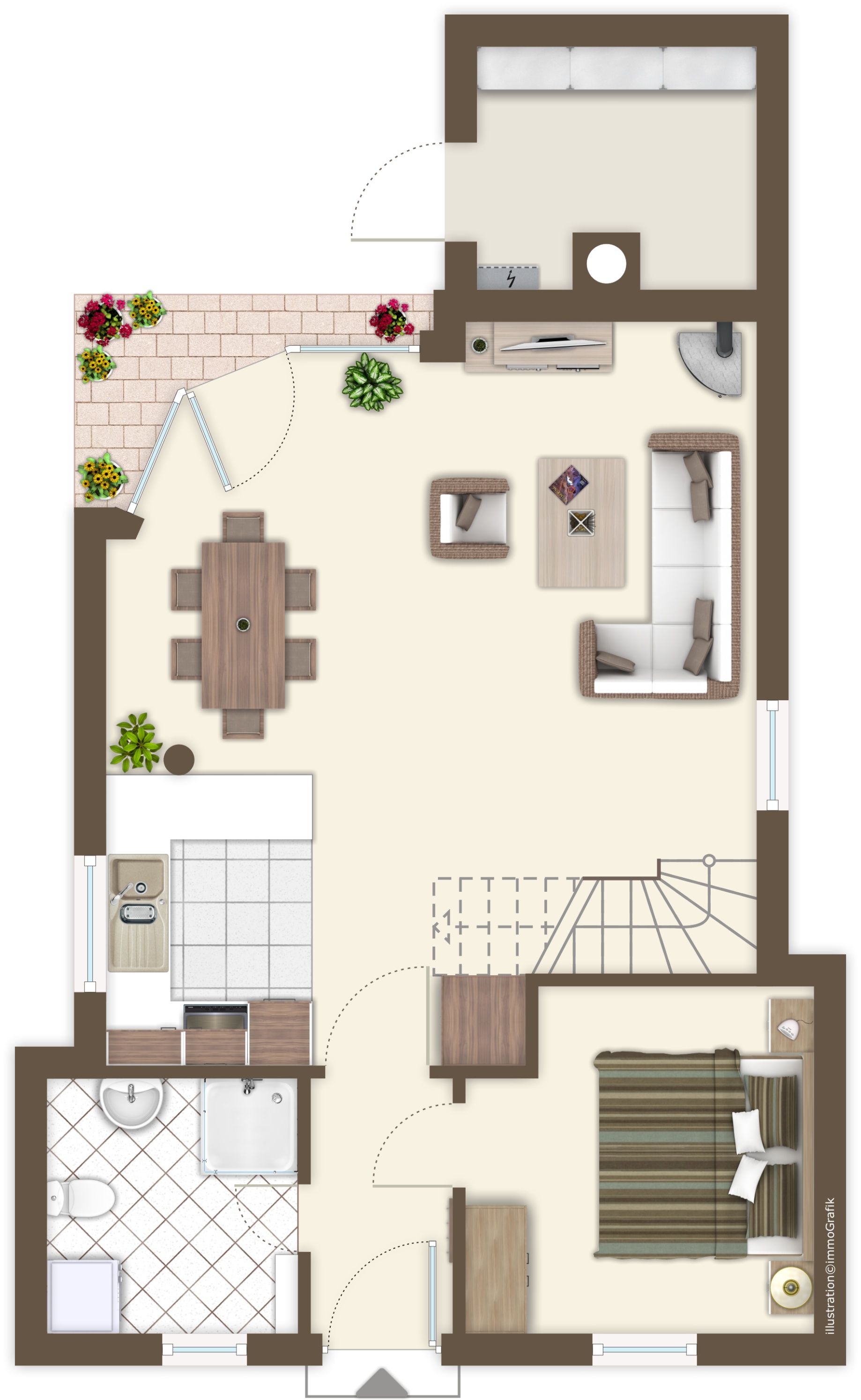 geschützte Terrasse mit Sitzplätzen für 6 Personen lädt zum Grillen und