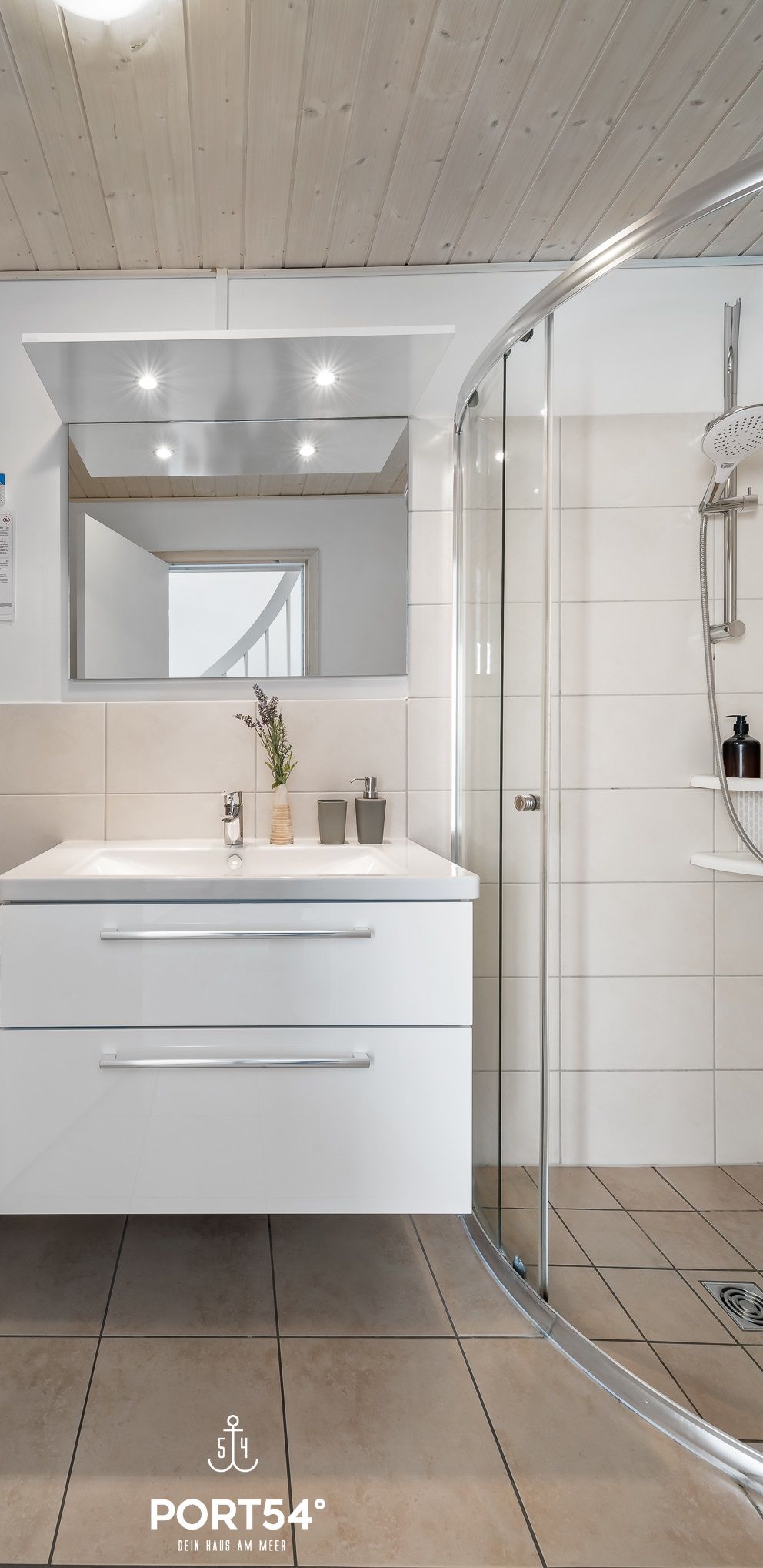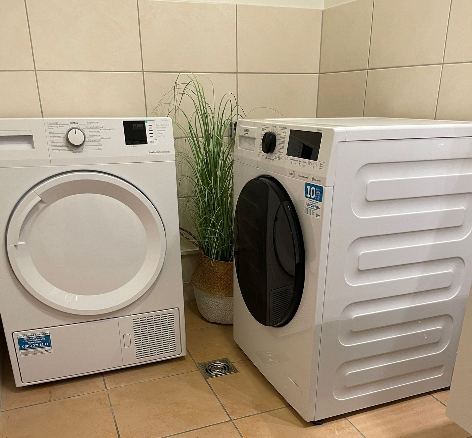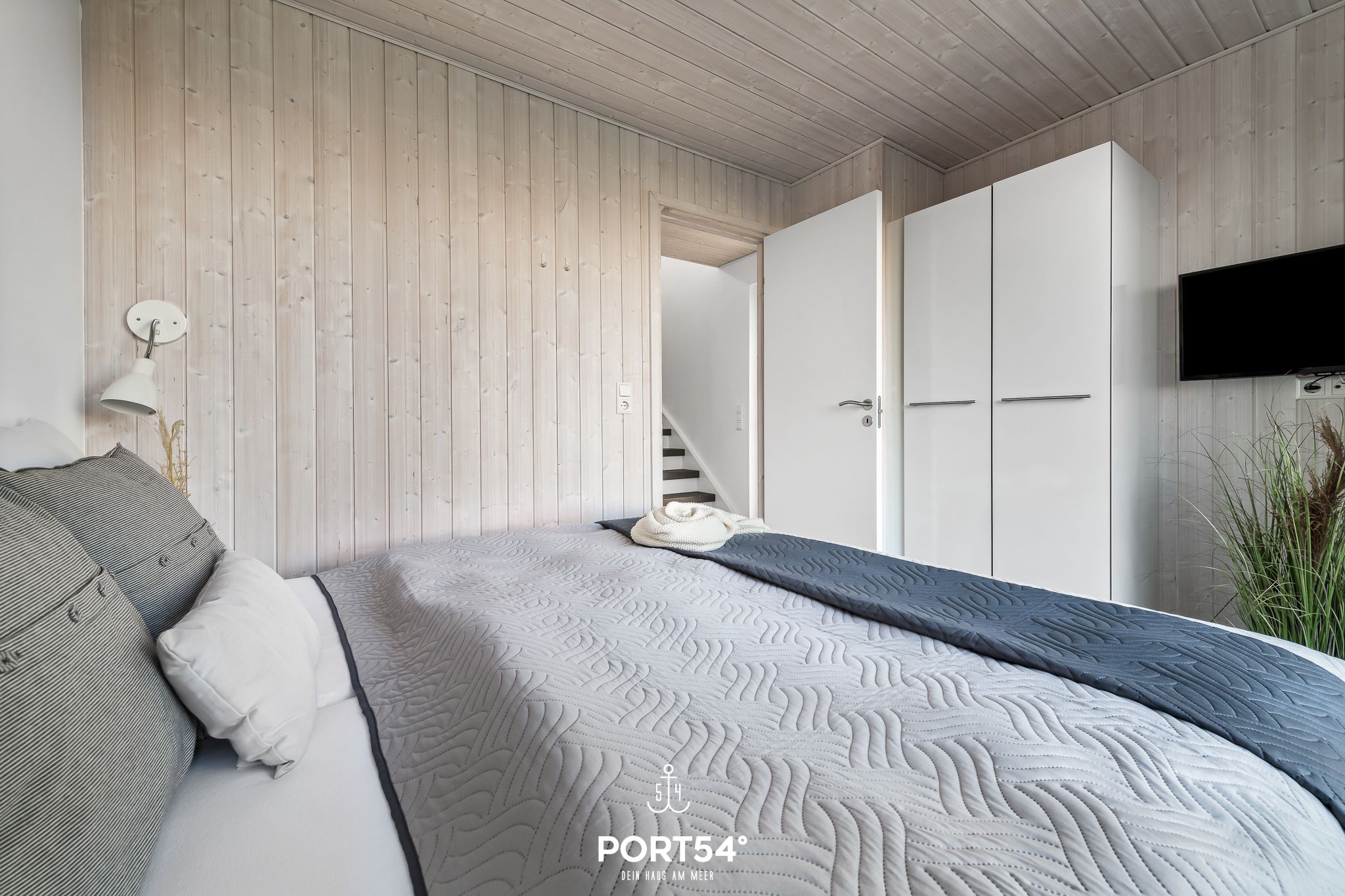 Das Haus bietet zwei separate Schlafzimmer und einen weiteren Schlafbereich (Schlafcouch im Wohnzimmer) mit insgesamt bis zu sechs Schlafmöglichkeiten. Im modern gestalteten Badezimmer befindet sich eine bodengleiche Dusche, Fußbodenheizung, WC, Waschbecken und Haartrockner. Waschmaschine und Trockner stehen zur Eigennutzung bereit – ideal für längere Aufenthalte oder Familien mit Kindern. Zur weiteren Ausstattung zählen Staubsauger, Wäscheständer und Garderobe.