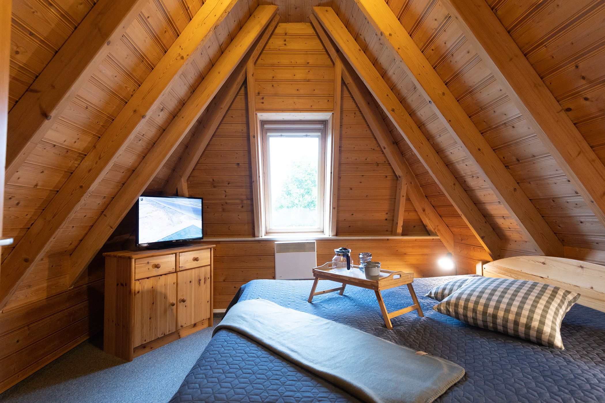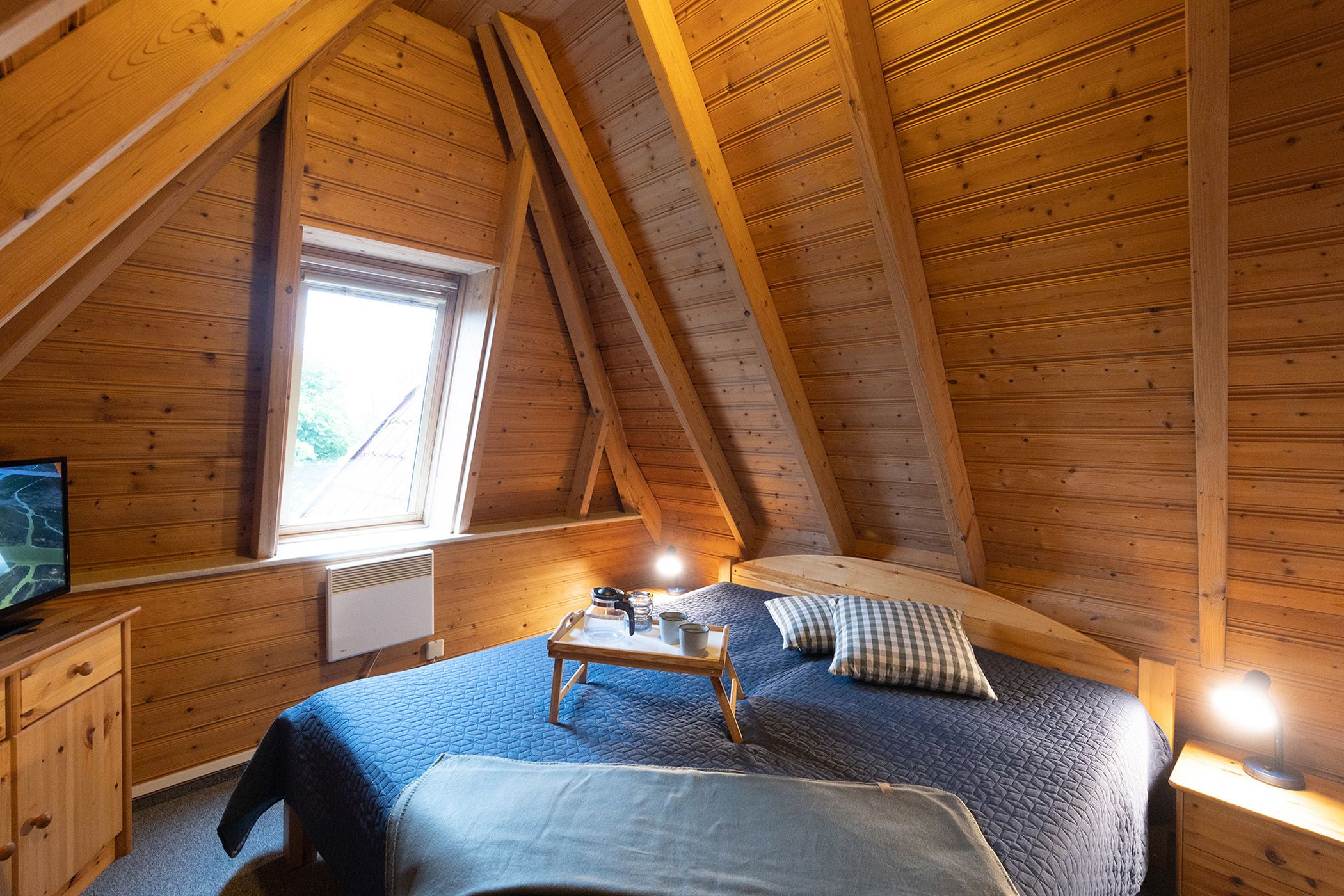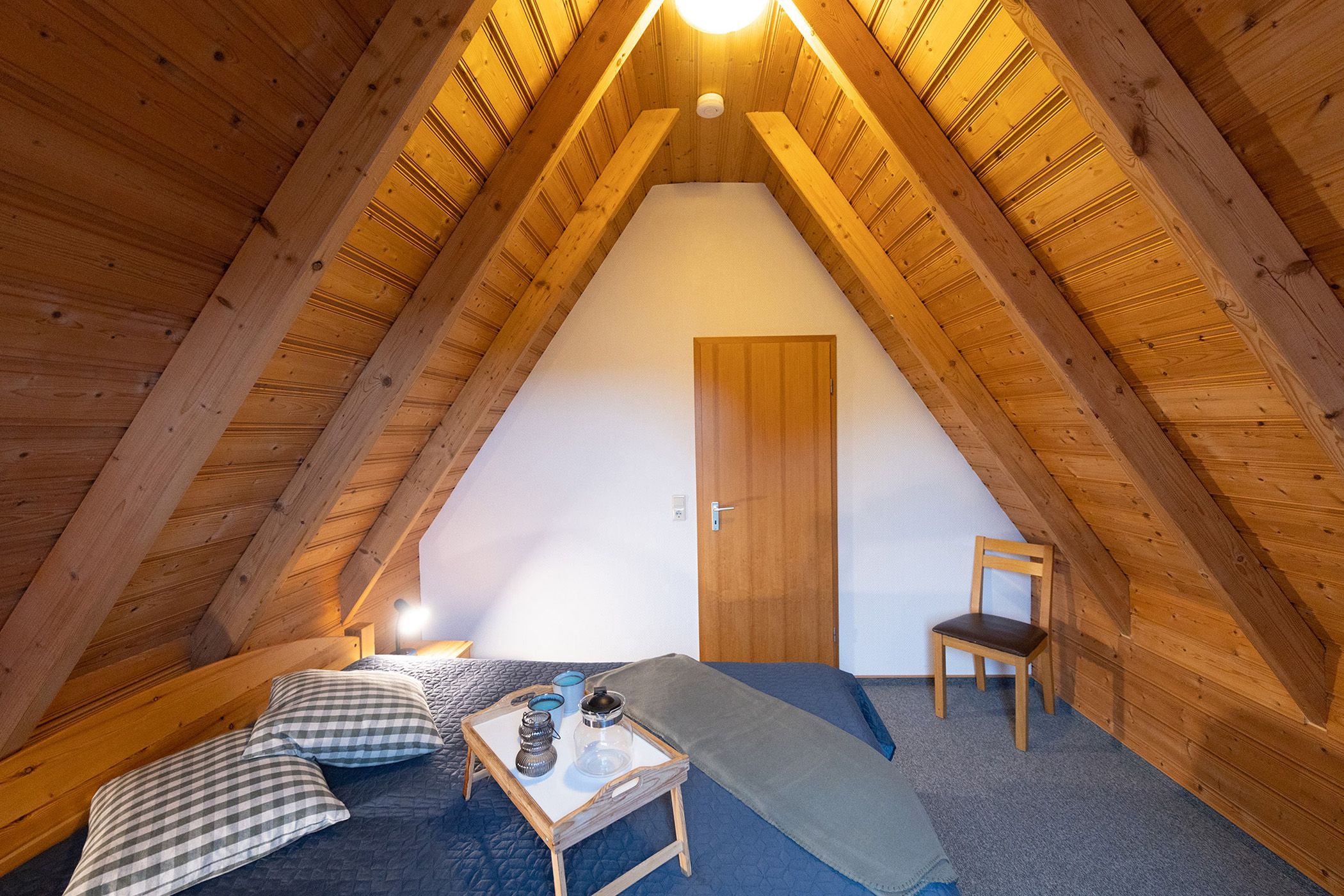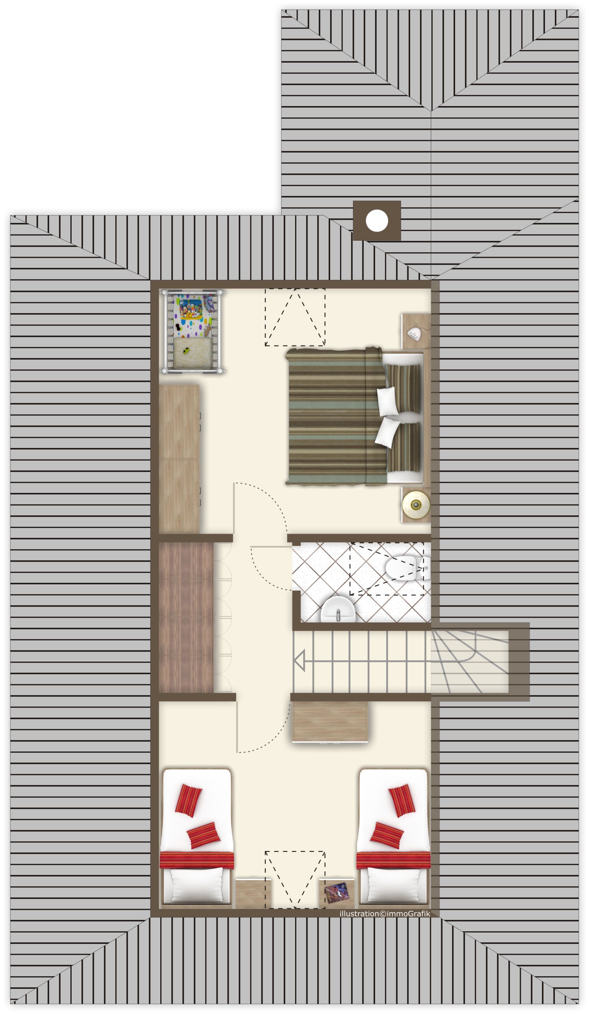 Duschbad. Im Obergeschoss liegen das Elternschlafzimmer mit Doppelbett und ein