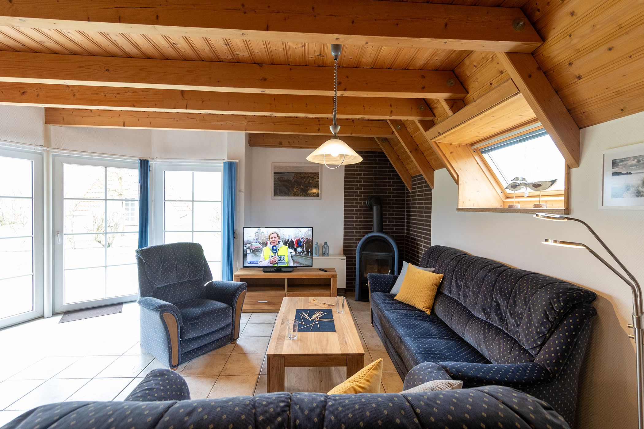 mit Kaminofen und bequemer Couchgarnitur, Esstisch und einer vollständig
