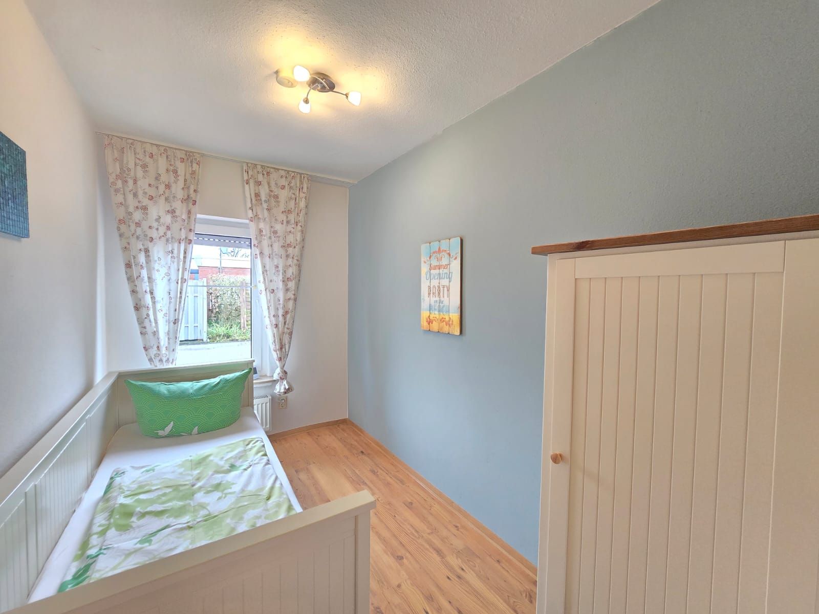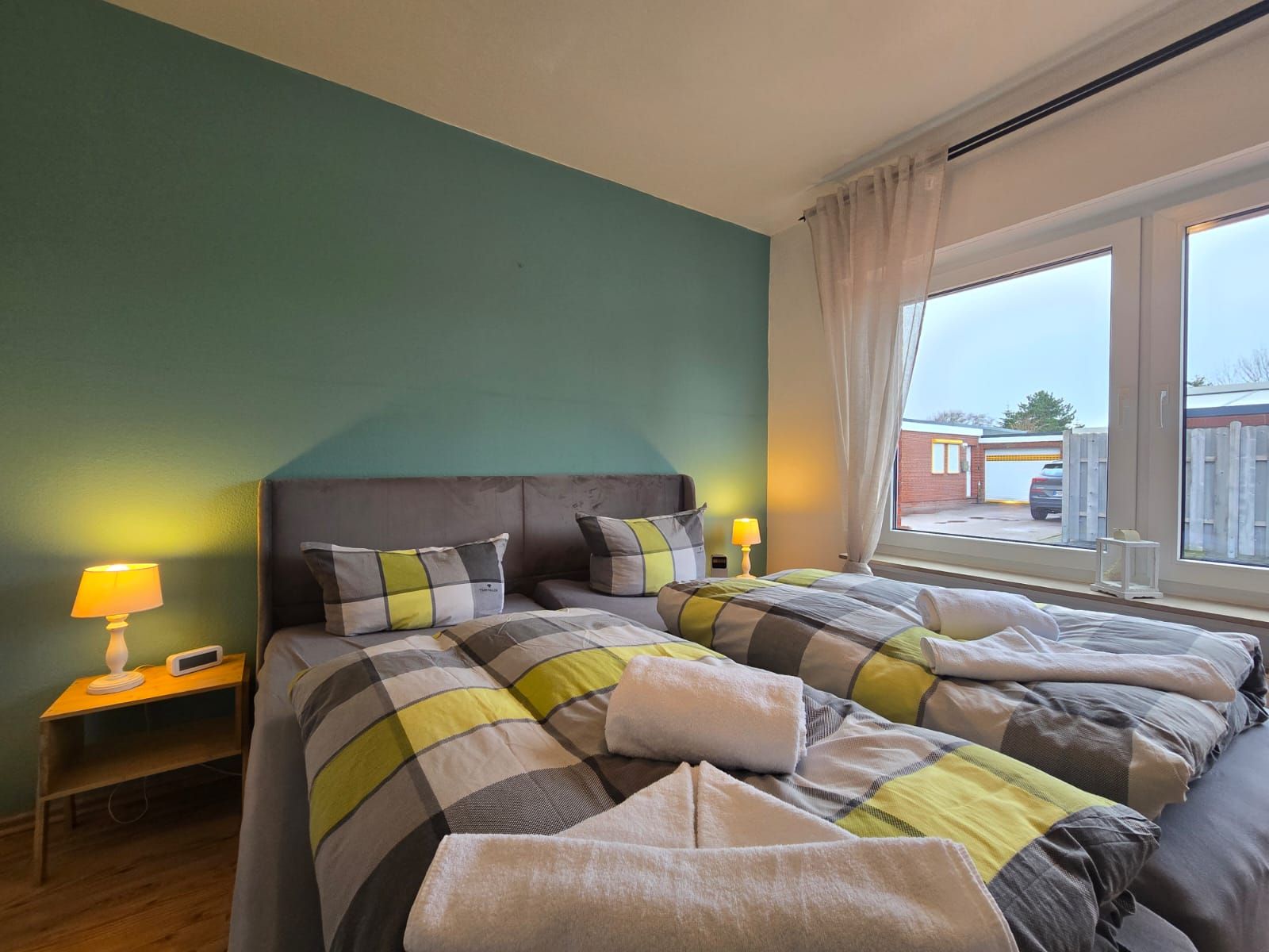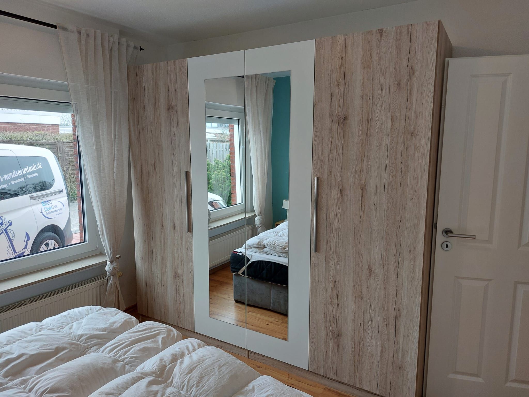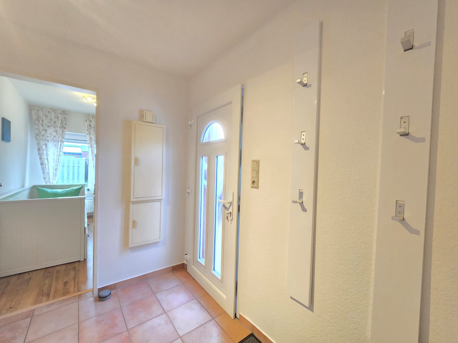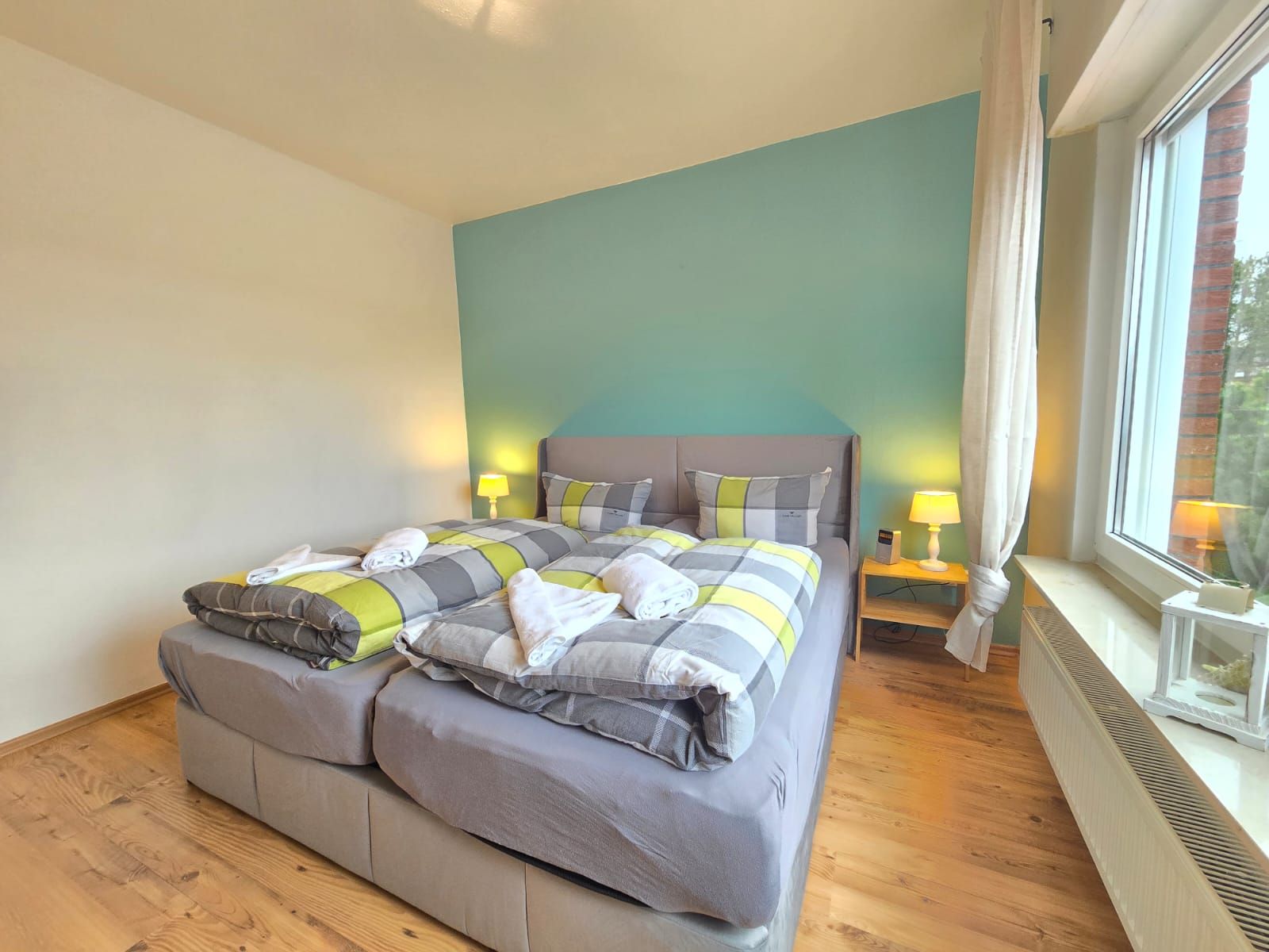 Ein Schlafzimmer verfügt über ein Doppelbett, ein weiteres Schlafzimmer ist mit einem Einzelbett ausgestattet. Bettwäsche und Handtücher können gegen Aufpreis hinzugebucht werden. Das Badezimmer verfügt über Dusche, WC und Fön. Die neue Küche ist mit Kühlschrank, Gefrierfach, Spülmaschine 4er Ceranfeld, Backofen und Mikrowelle ausgestattet. Alle Fenster sind mit Rollläden versehen.
