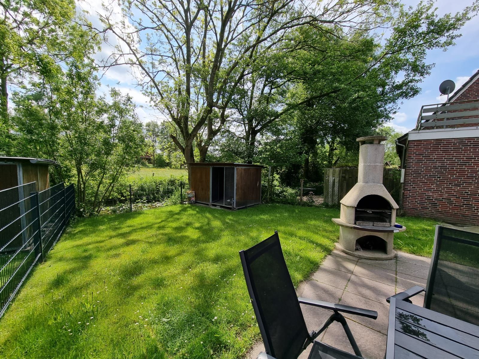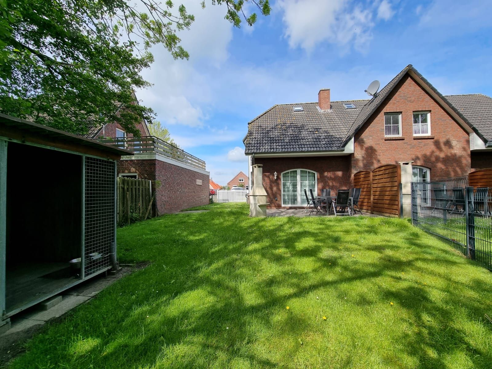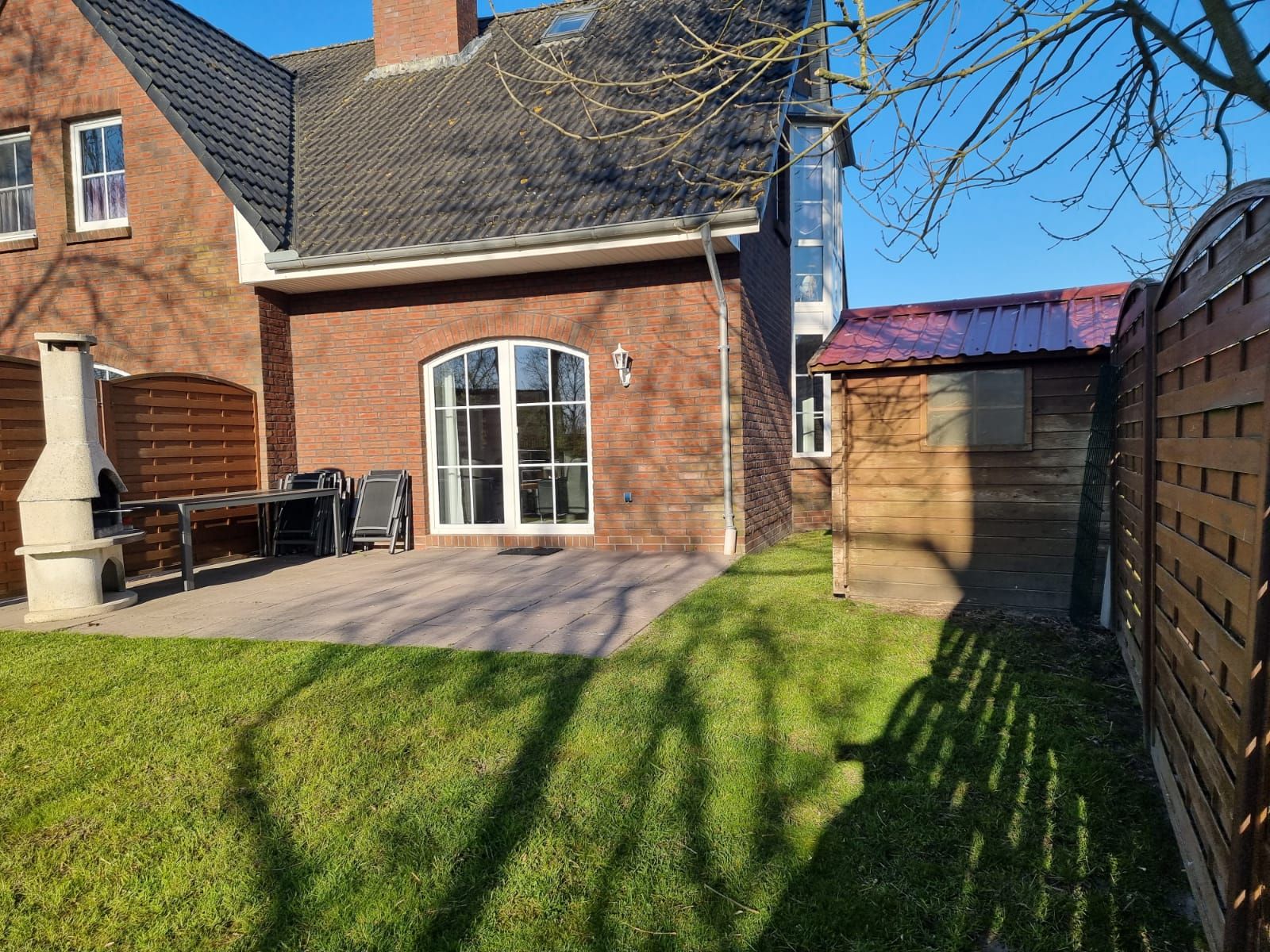 Vom Wohnzimmer aus gelangen Sie direkt auf die Terrasse, auf der Sie ungestörte Sonnenstunden genießen können. Ein Gartengrillkamin steht Ihnen für gesellige Abende im Freien zur Verfügung.