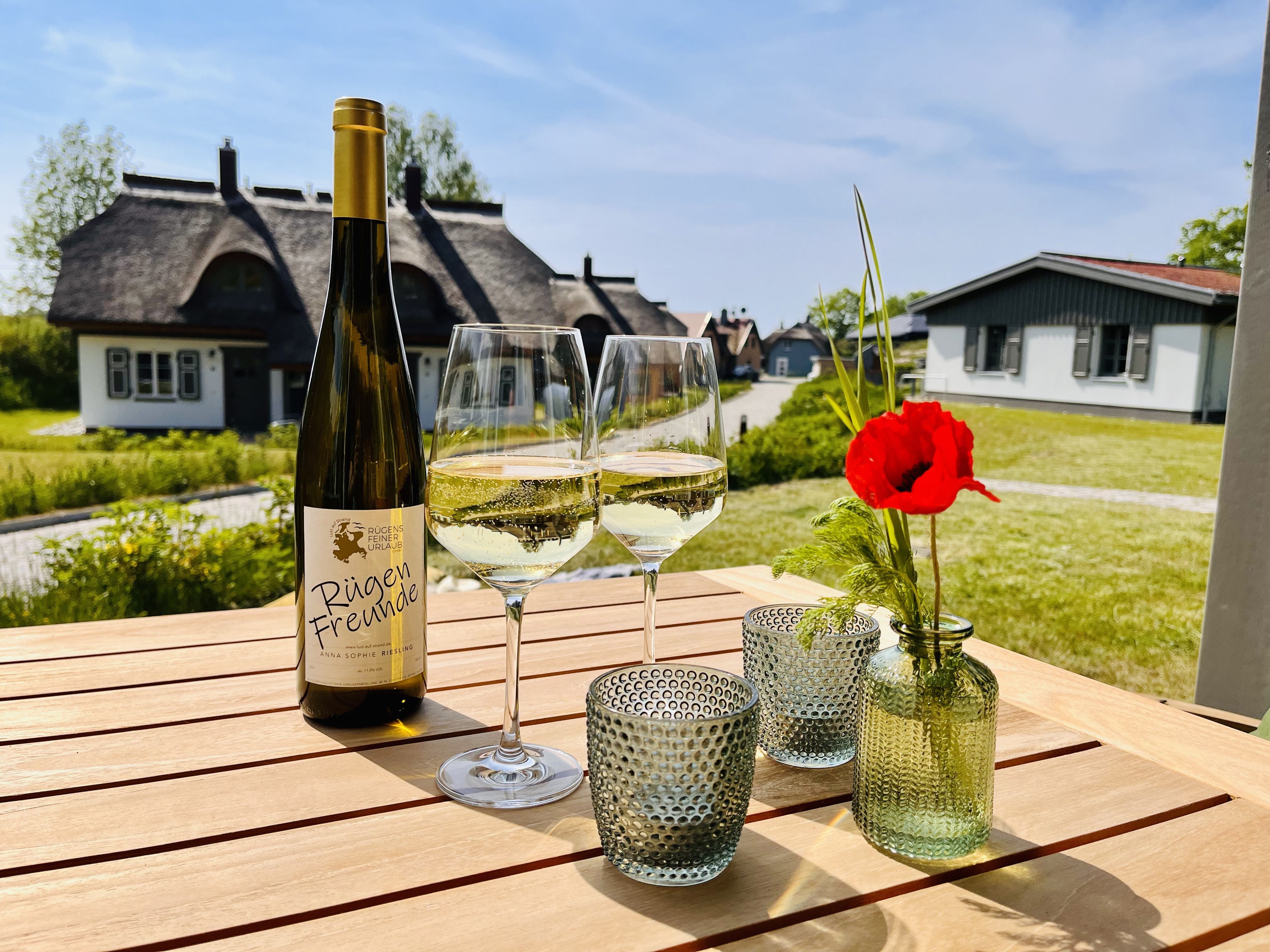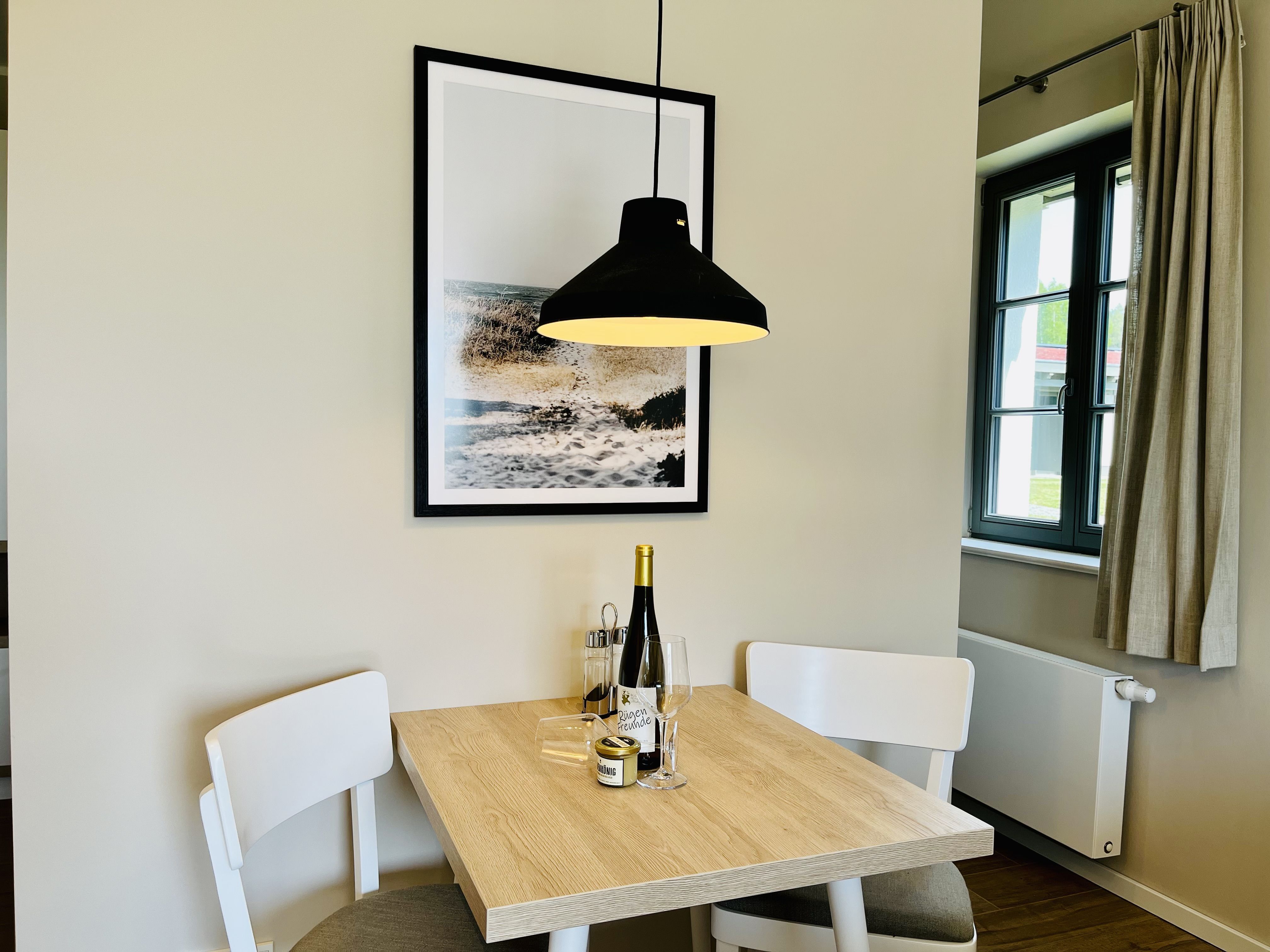 Im Feriendorf Klein Stresow werden Sie auf 53 Quadratmeter in Ihrer eigenen, stylischen Ferienhaushälfte mit Garten und Weitblick begrüßt . Hier beginnt der Urlaub für bis zu 2 Personen schon beim Eintreten. Wenn Sie es genau nehmen, schon beim Ankommen. Das Auto auf dem für Sie reservierten Stellplatz abgestellt, können Sie bei so viel sonniger Leichtigkeit erst einmal richtig durchatmen. Öffnen Sie die bodentiefen Fenster zu Ihrer Süd-Westterrasse weit und genießen Sie die frische Ostseebrise. Hier lässt es sich ausgezeichnet frühstücken. Das Innere Ihrer Ferienhaushälfte ist bis ins Detail aufs Feinste eingerichtet. Lampen, Möbel und Bilder sind nordisch nobel. Ein Sofa lädt zum Relaxen ein. Zur Ausstattung des Wohn-Esszimmers gehört ein Flat-TV. Das WLAN können Sie kostenfrei nutzen. Ein schöner Esstisch mit zwei Stühlen eignet sich bestens für die Mahlzeiten.