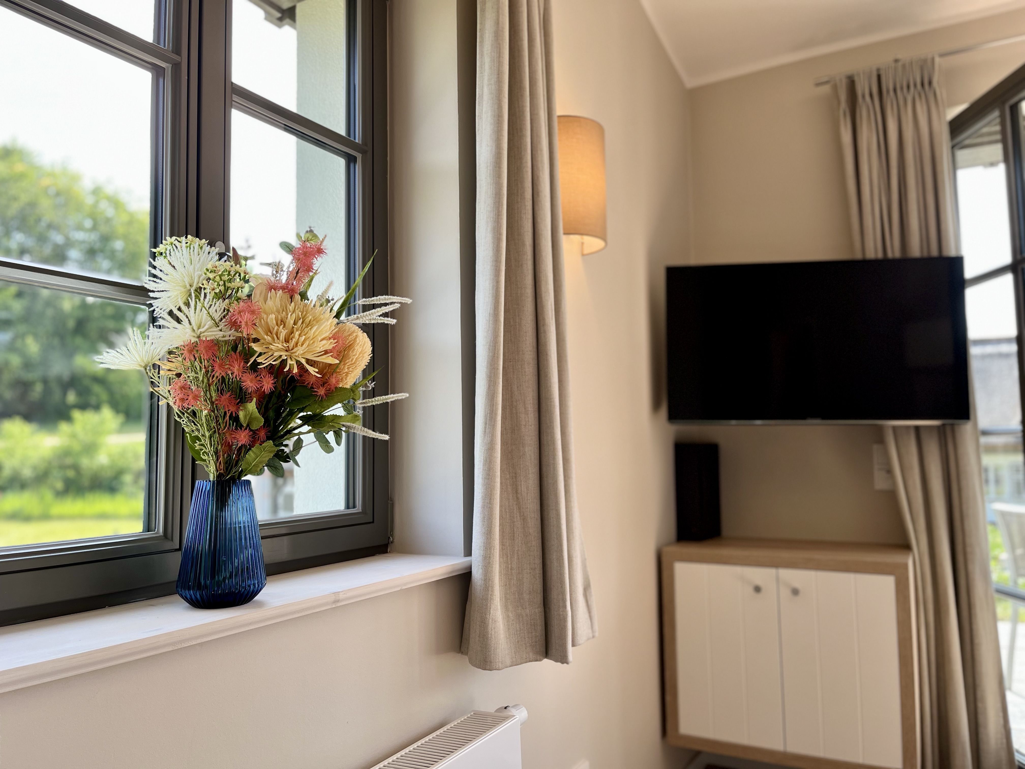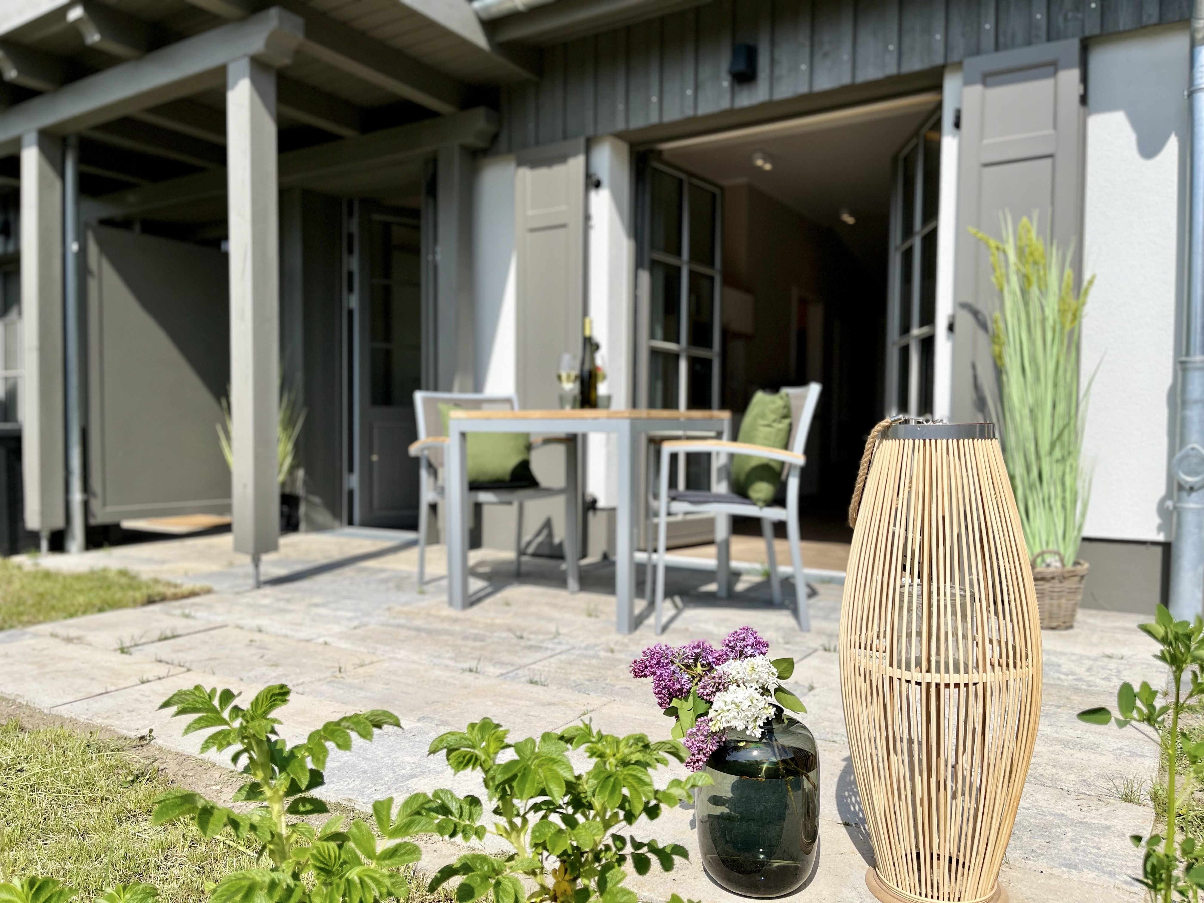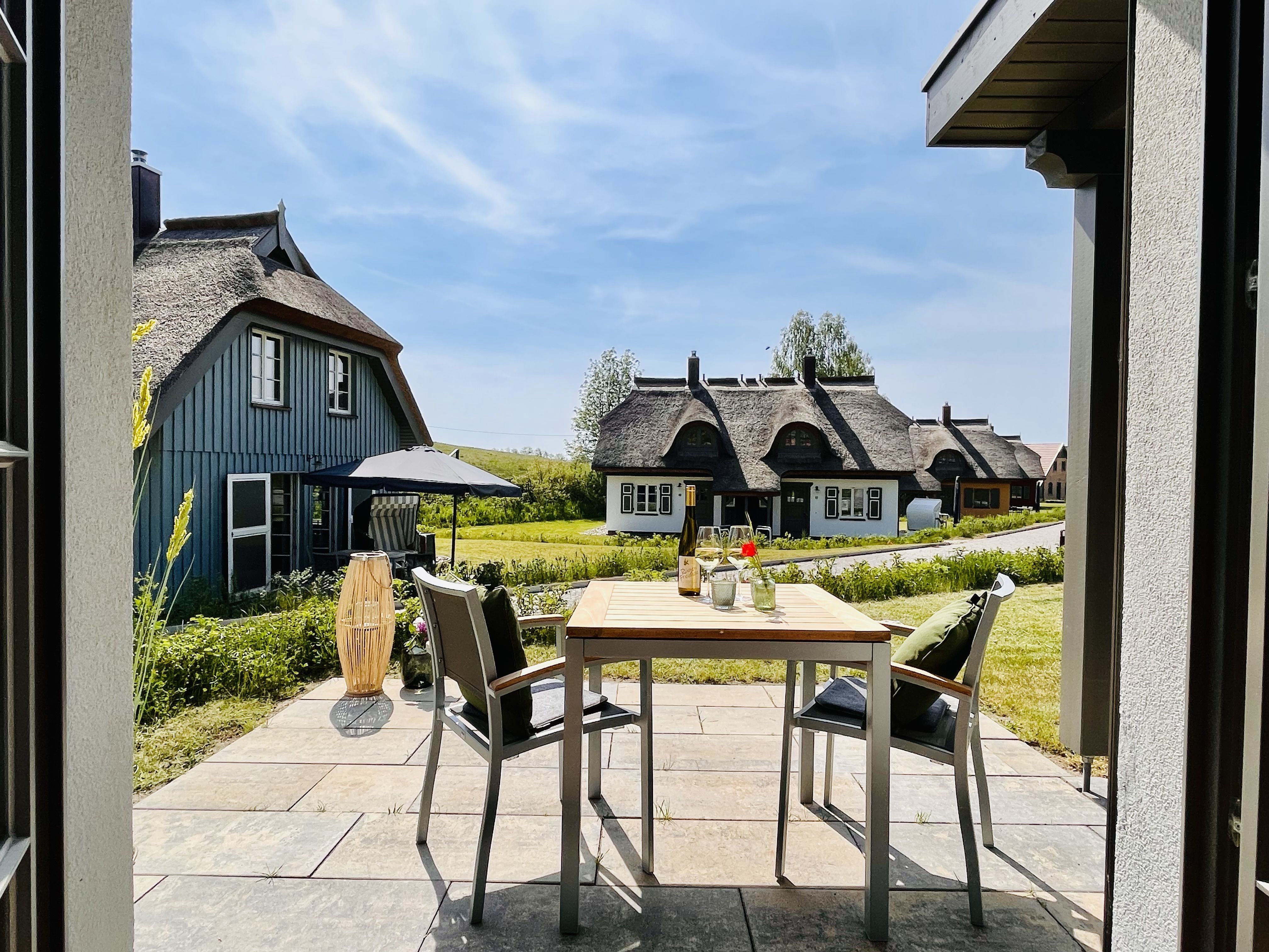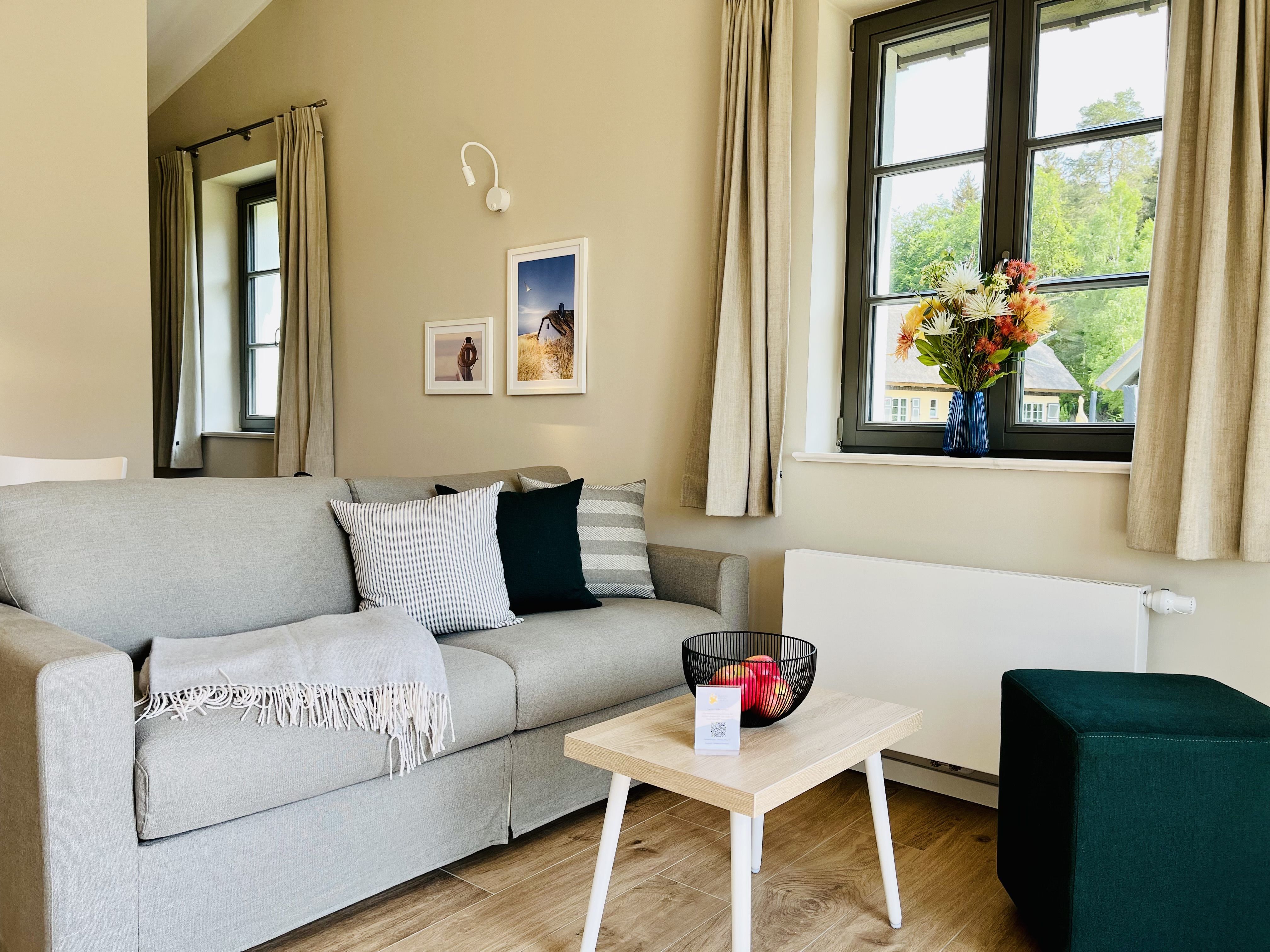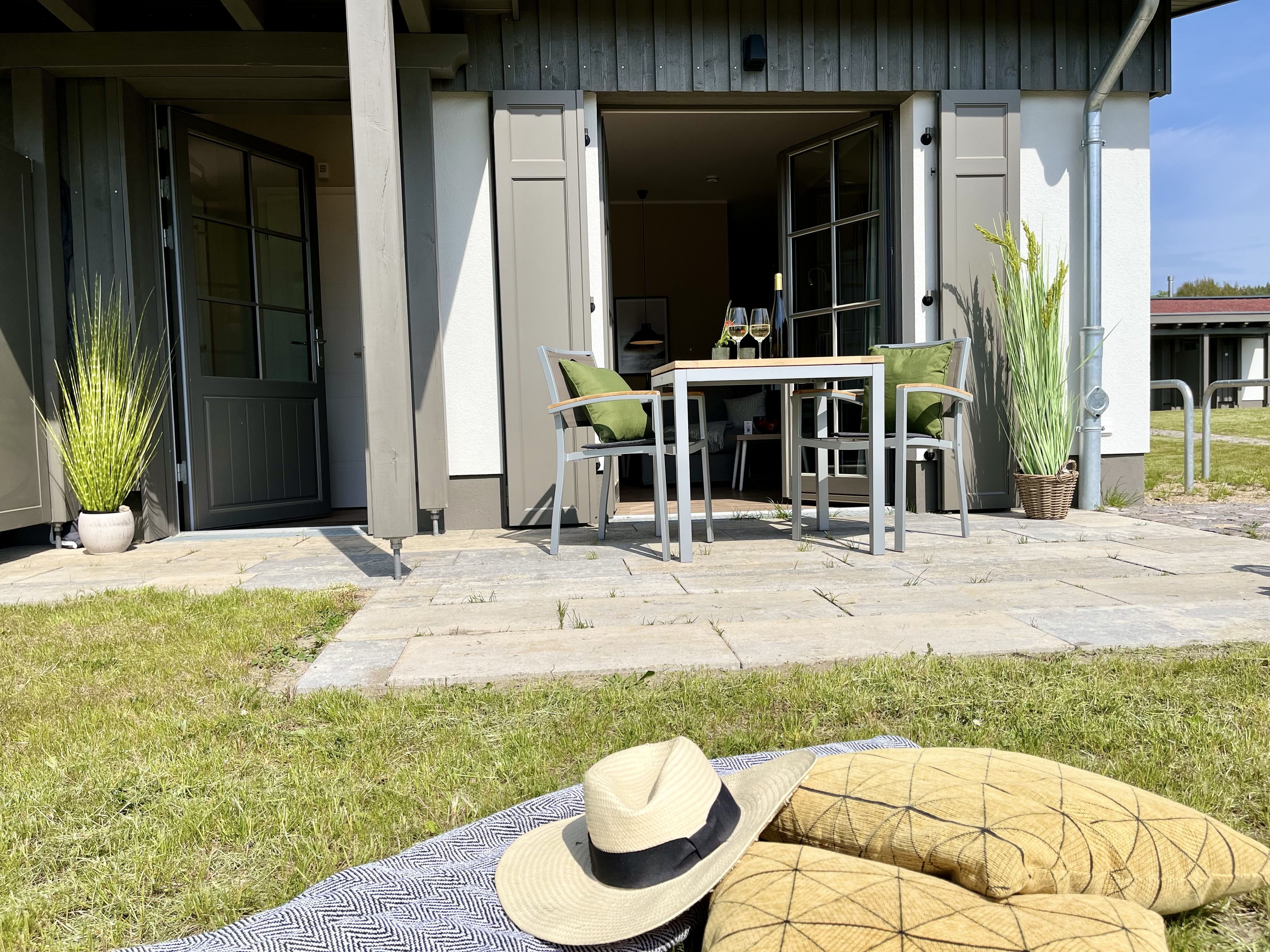 Im Feriendorf Klein Stresow werden Sie auf 41 Quadratmeter in Ihrer eigenen, stylischen Ferienhaushälfte mit Garten und Weitblick begrüßt . Hier beginnt der Urlaub für 2 Personen schon beim Eintreten. Wenn Sie es genau nehmen, schon beim Ankommen. Das Auto auf dem für Sie reservierten Stellplatz abgestellt, können Sie bei so viel sonniger Leichtigkeit erst einmal richtig durchatmen. Öffnen Sie die bodentiefen Fenster zu Ihrer Südterrasse und genießen Sie die frische Ostseebrise. Hier lässt es sich ausgezeichnet frühstücken. Das Innere Ihrer Ferienhaushälfte ist bis ins Detail aufs Feinste eingerichtet. Lampen, Möbel und Bilder sind nordisch nobel. Ein Doppelsofa mit Anstellotomane lädt zum Relaxen ein. Zur Ausstattung des Wohn-Esszimmers gehört ein Flat-TV. Das WLAN können Sie kostenfrei nutzen. Ein schöner Esstisch mit zwei Stühlen eignet sich bestens für die Mahlzeiten.