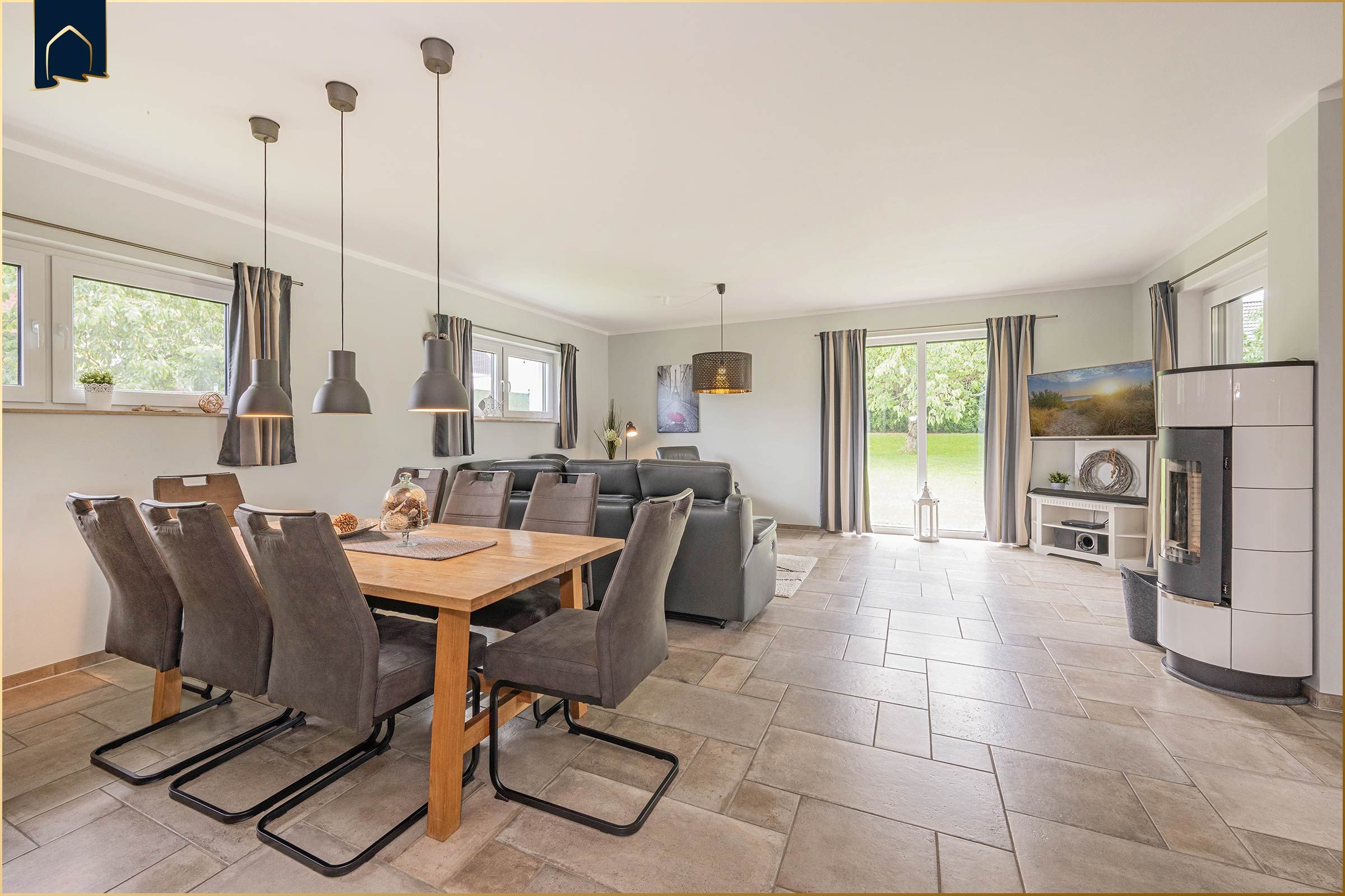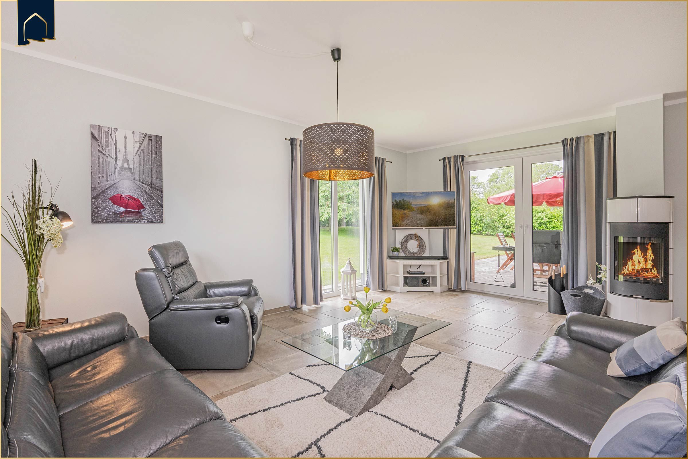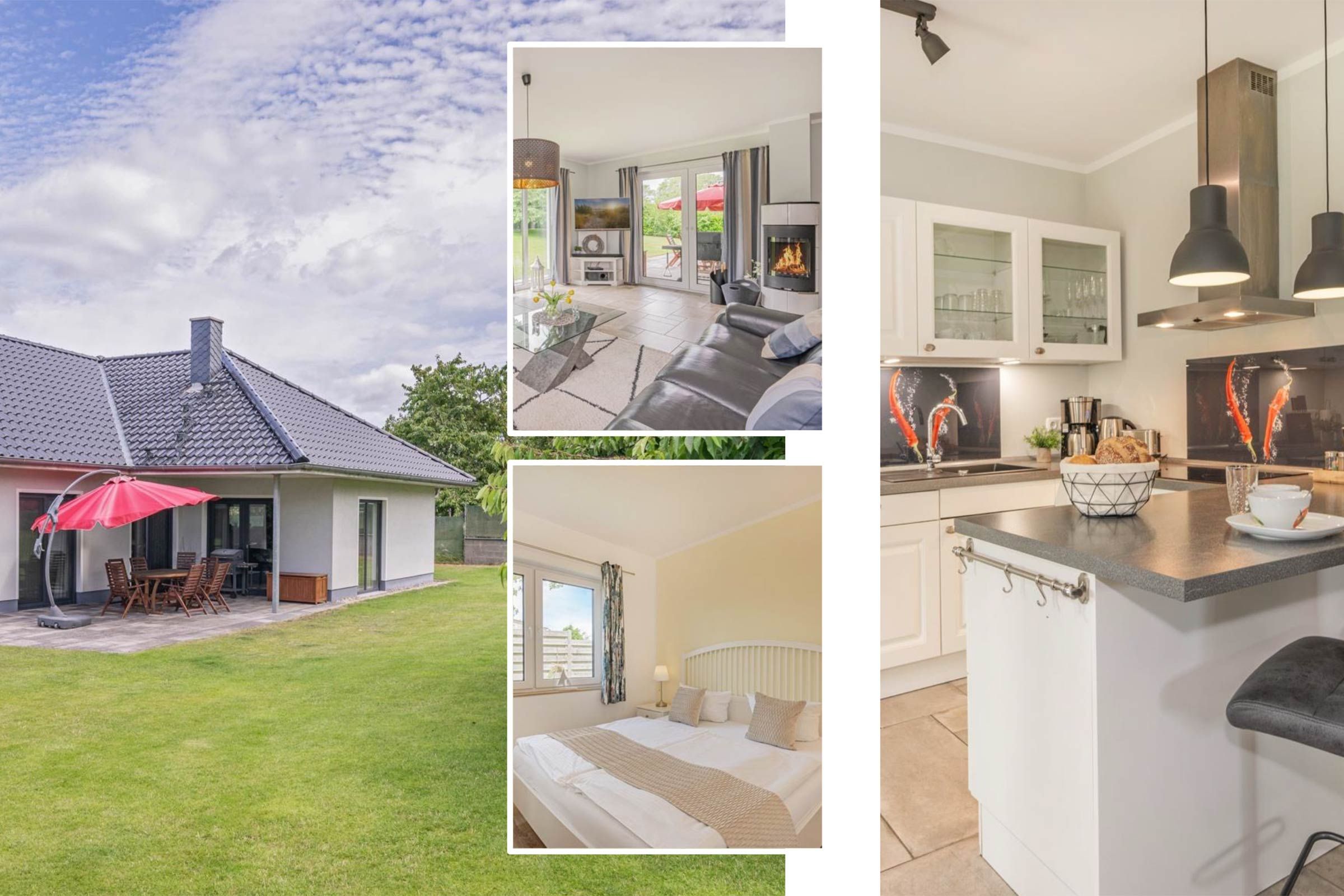 Dieses liebevoll eingerichtete Ferienhaus ist die perfekte Wahl für alle, die Erholung in ruhiger, naturnaher Umgebung suchen. Das freistehende Haus bietet auf 126 m² viel Platz für bis zu acht Gäste und verfügt über drei Schlafzimmer sowie zwei moderne Bäder mit Dusche. Der großzügige Wohnbereich mit Kamin und gemütlicher Sofaecke lädt zum Entspannen ein, während die voll ausgestattete Küche keine Wünsche offenlässt. Für Familien mit Kindern und Hundebesitzer besonders praktisch: Das rund 1.000 m² große Grundstück ist komplett eingezäunt. Auf der überdachten Terrasse mit Grillmöbeln lässt sich der Tag wunderbar ausklingen. Auch WLAN, TV, Waschmaschine und Fußbodenheizung sind vorhanden. Einkaufsmöglichkeiten, Restaurants, ein See sowie die Ostsee sind in wenigen Minuten mit dem Auto erreichbar. Das Haus liegt ruhig am Waldrand in einem kleinen Dorf – ideal für Naturliebhaber, Wanderfreunde und Ruhesuchende.