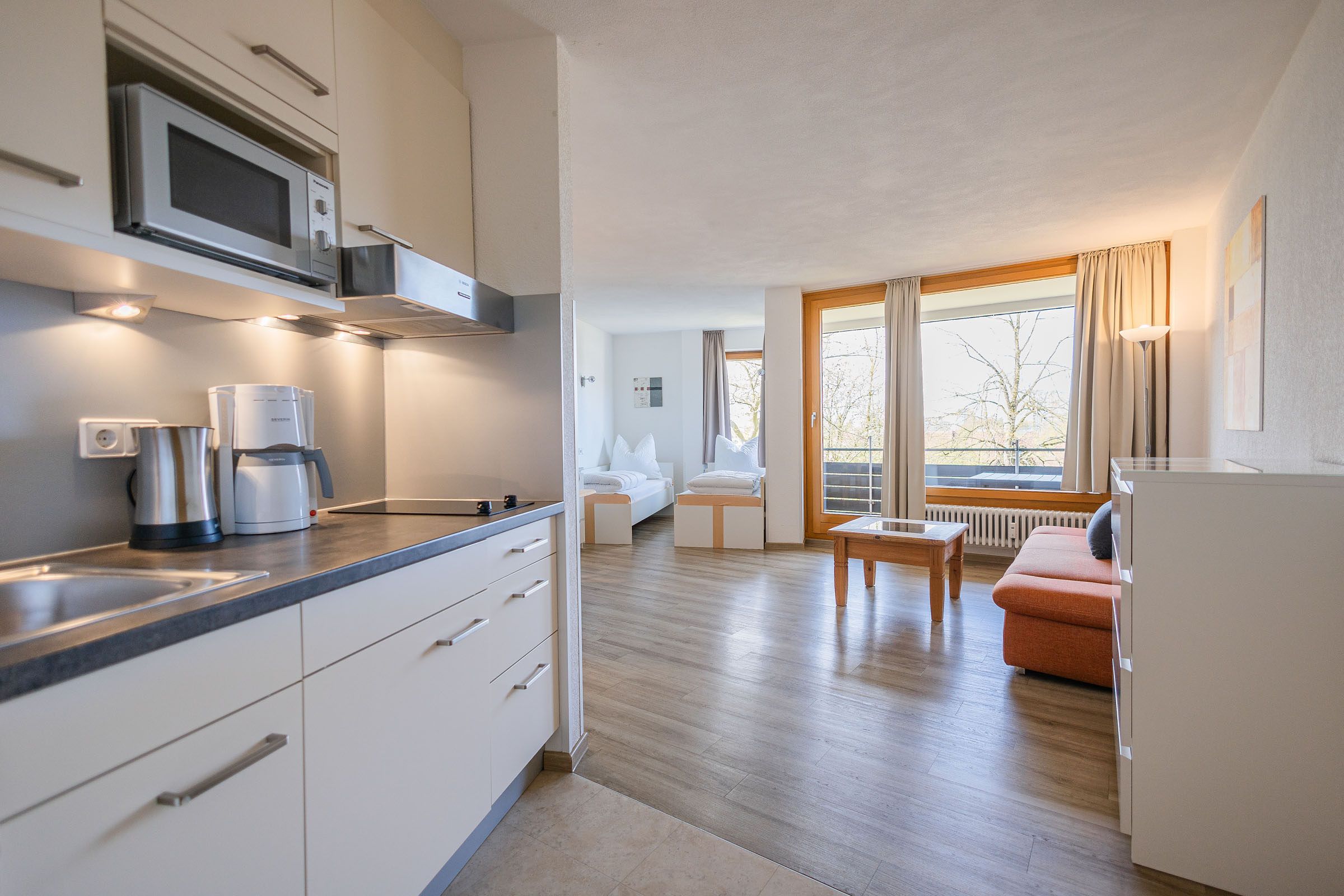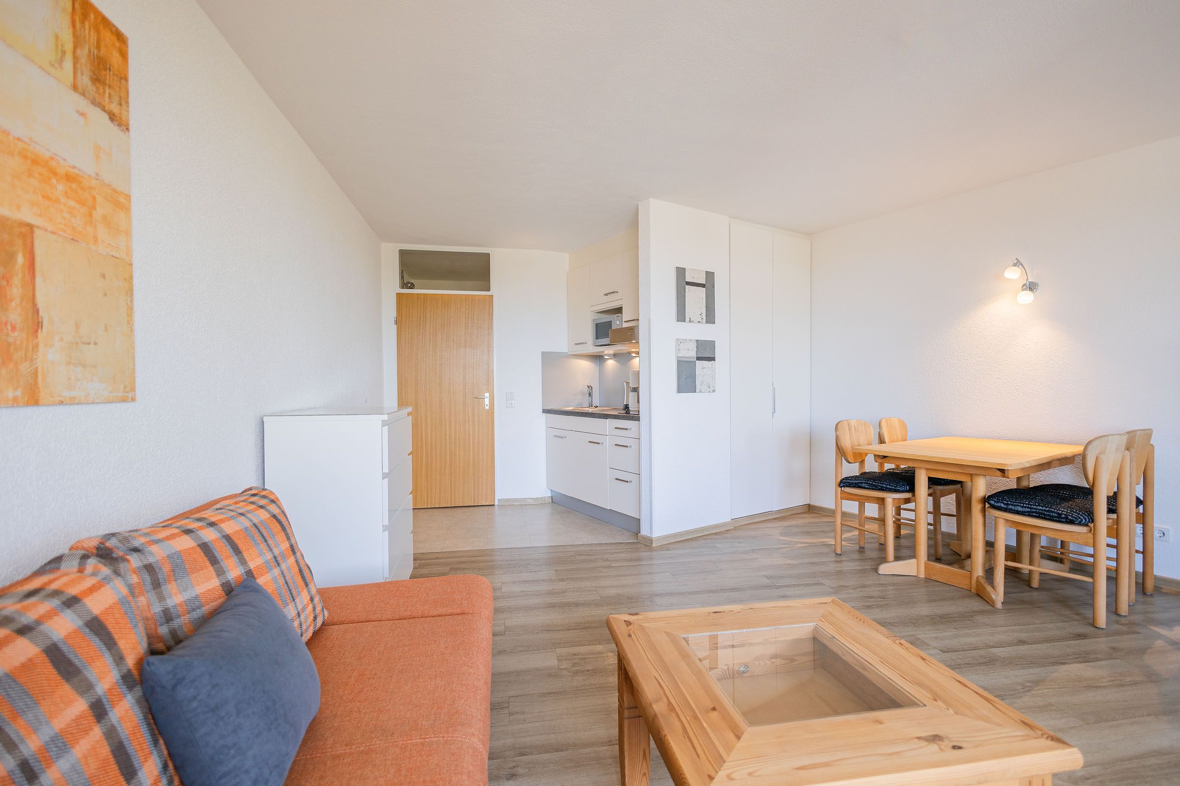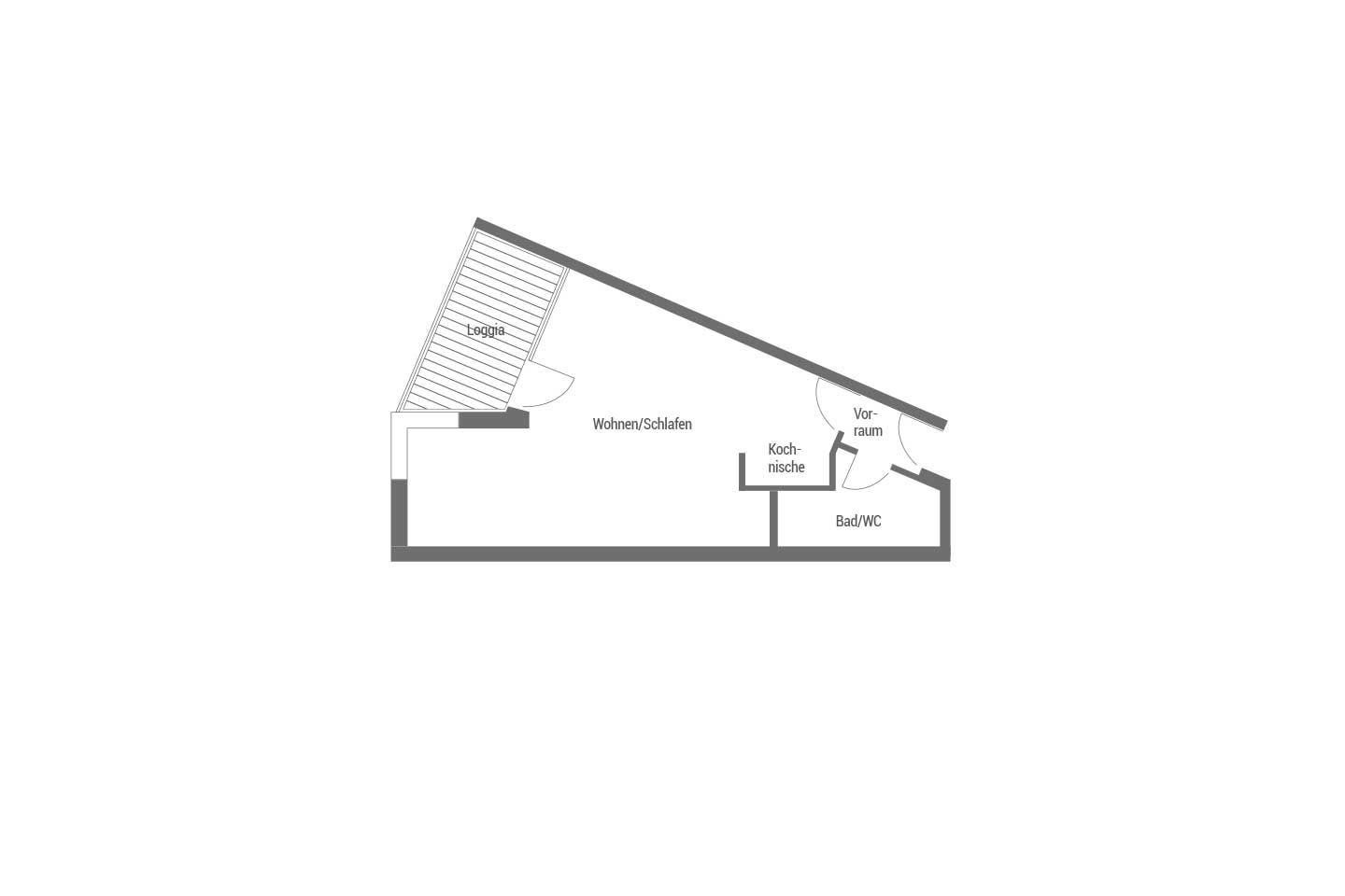 Die Wohnung (ca. 40 m²) verfügt über einen Wohn-Schlafraum, Küchenzeile, Dusche/WC, Balkon sowie einen eigenen PKW-Stellplatz.