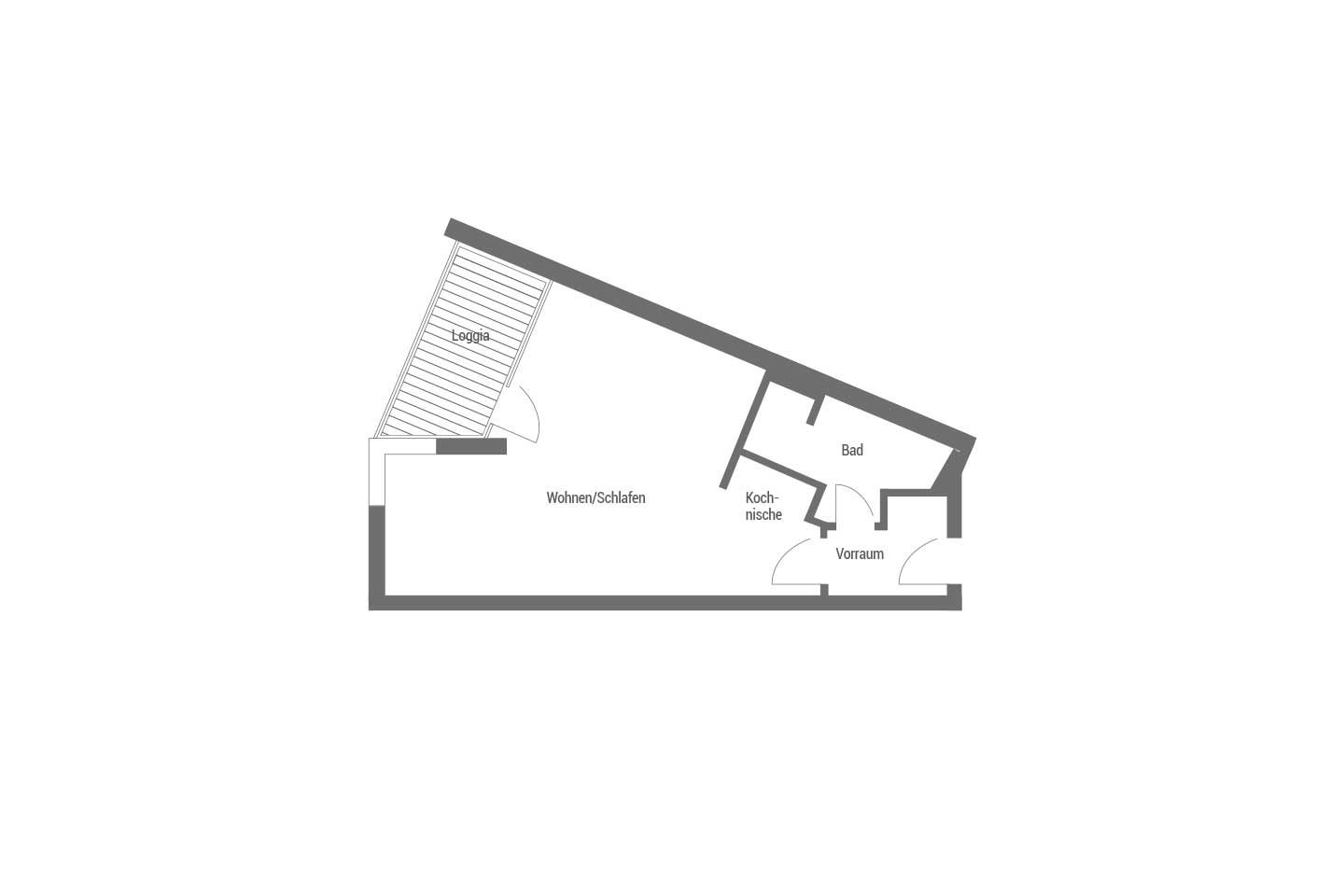 Die Wohnung (ca. 40 m²) verfügt über einen Wohn-Schlafraum, Küchenzeile, Dusche/WC, Balkon sowie einen eigenen PKW-Stellplatz.