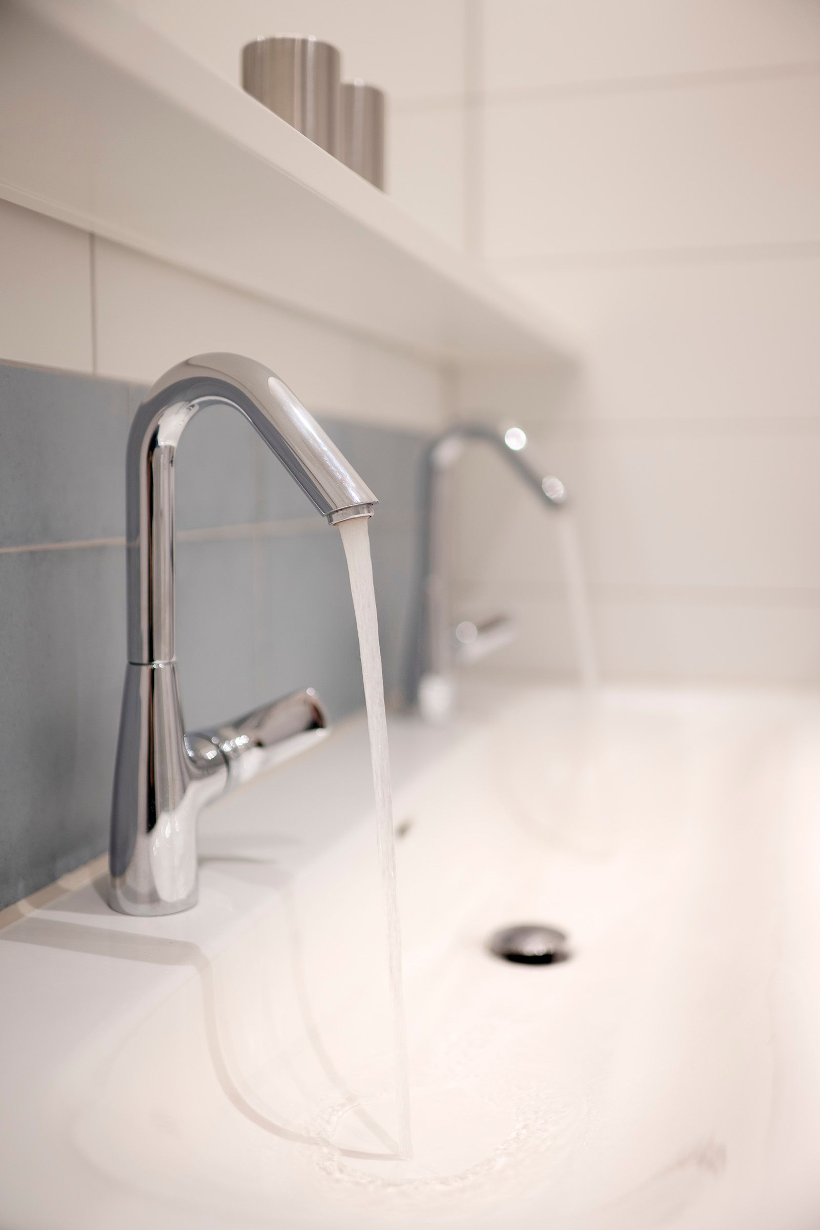 Das helle, lichtdurchflutete Bad bietet neben Waschtisch und WC eine bodengleiche Dusche.