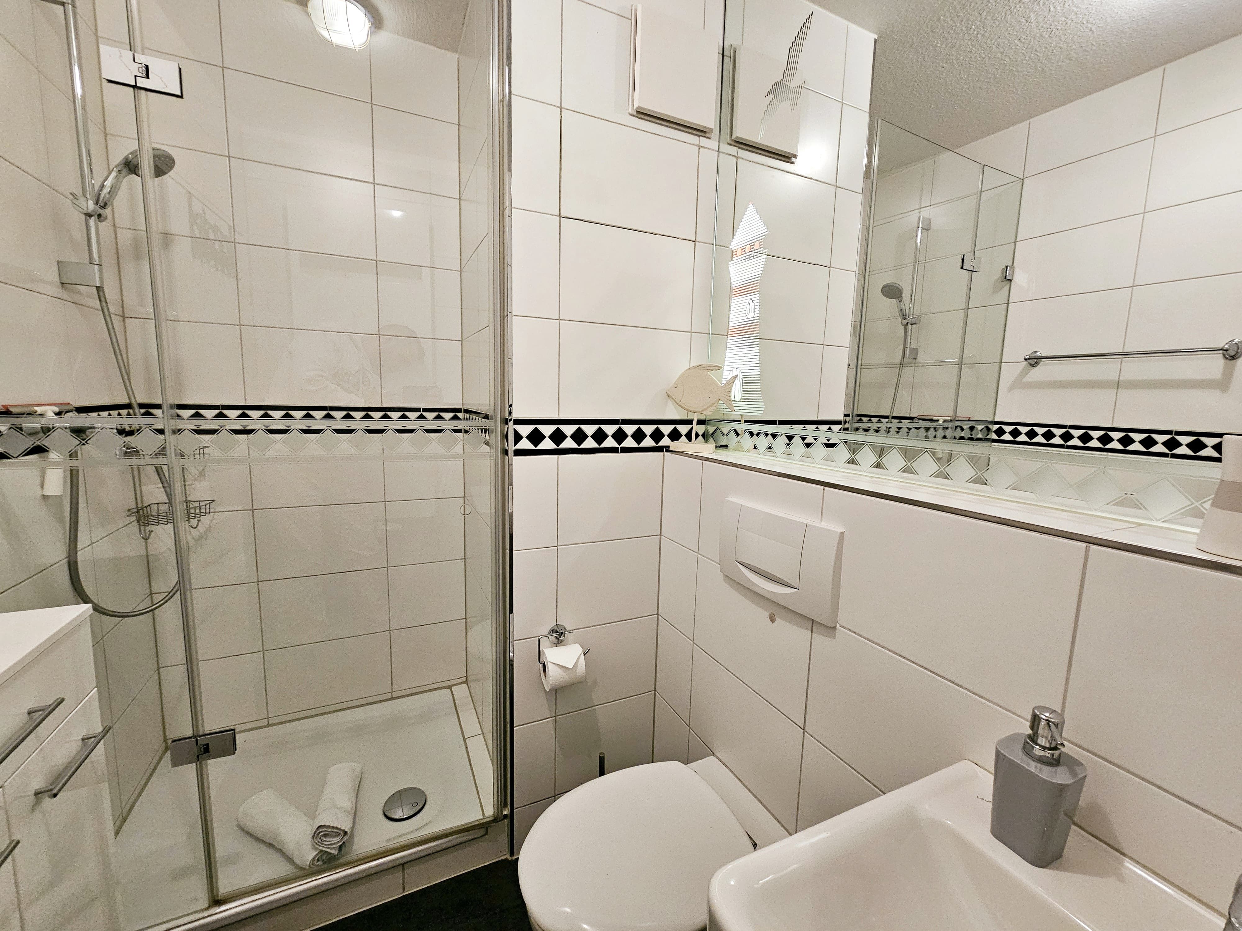 Die Küche ist modern ausgestattet und bietet alles, was Sie für Ihren Aufenthalt benötigen: Cerankochfeld, Backofen, Geschirrspüler, Kühlschrank mit Gefrierfach sowie Kaffeemaschine, Toaster und Wasserkocher. Das Schlafzimmer ist mit einem bequemen Doppelbett und ausreichend Stauraum eingerichtet und sorgt für erholsamen Schlaf. Im Wohnbereich lädt eine gemütliche Couch zum Entspannen ein – ideal für Lesestunden oder Filmabende.