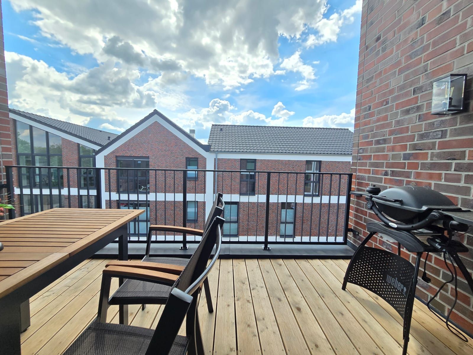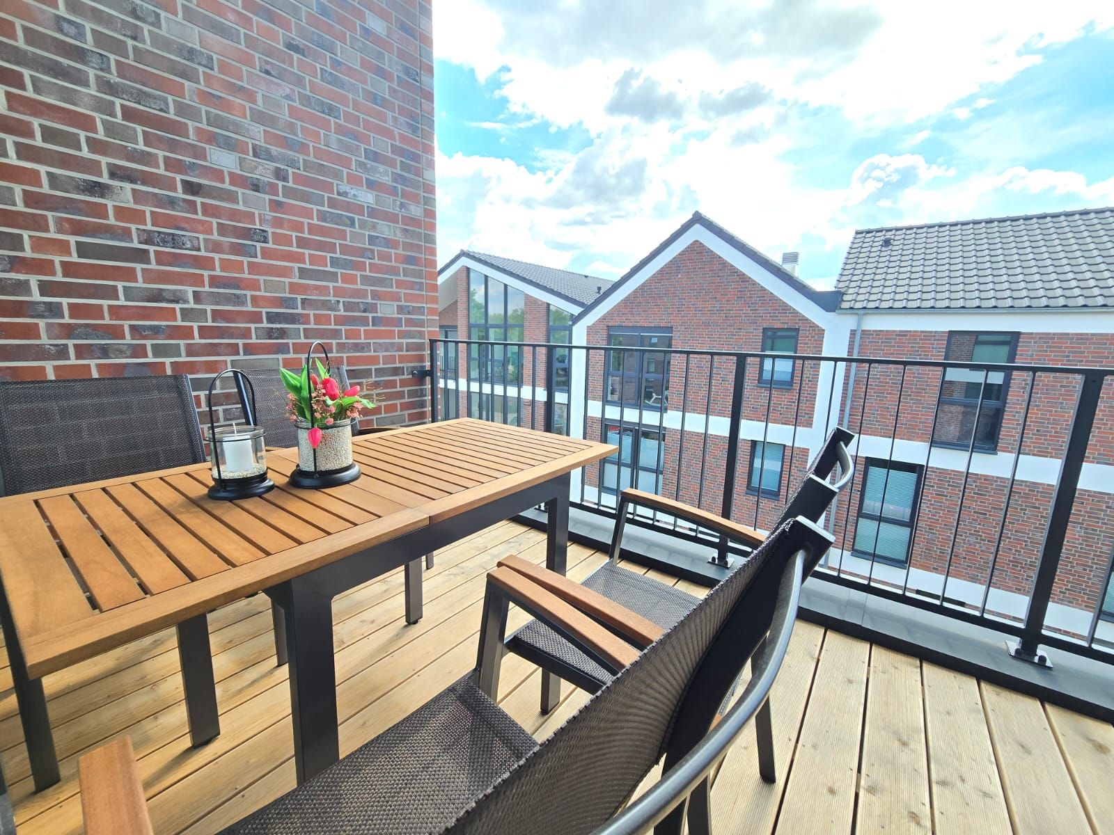 Der Balkon mit seitlichem Wasserblick lädt zu entspannten Stunden ein – perfekt nach einem erlebnisreichen Tag an der Nordseeküste. Bettwäsche und Handtücher können auf Wunsch und gegen Aufpreis hinzugebucht werden.