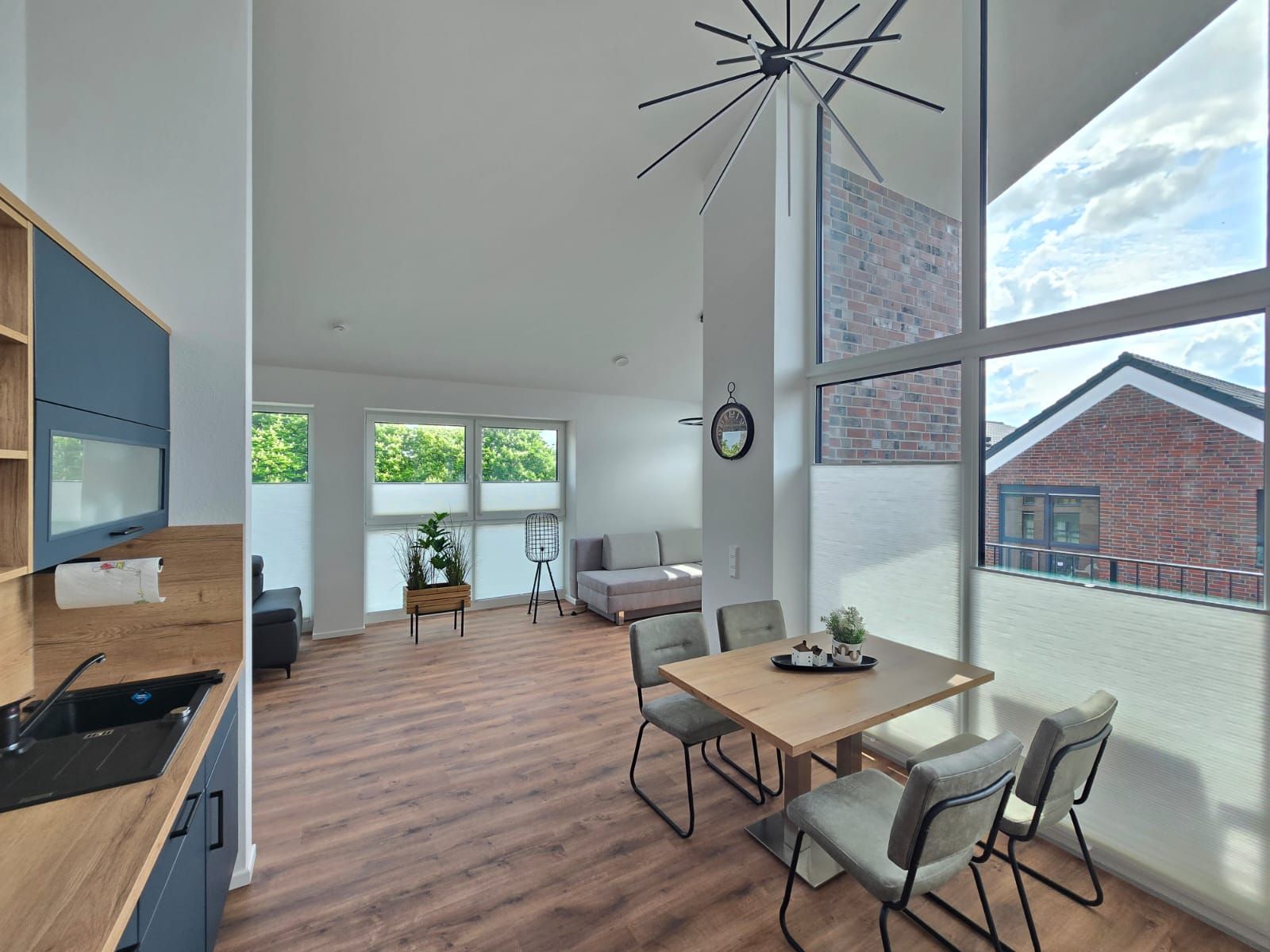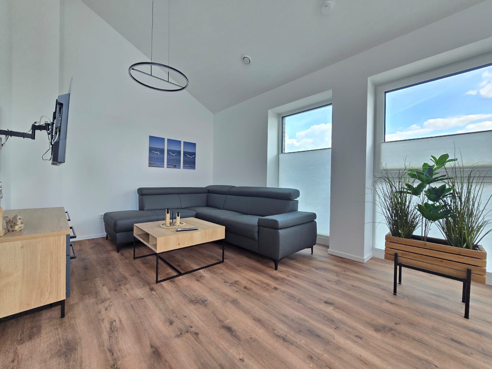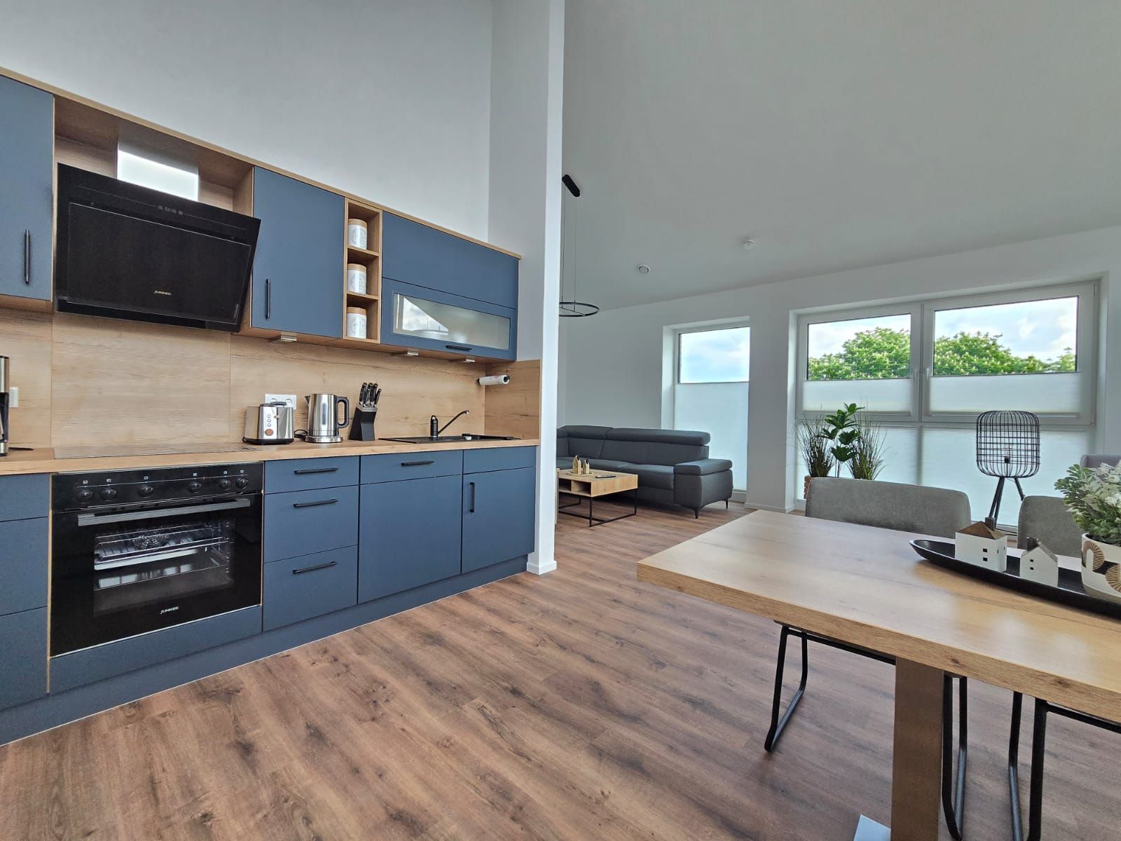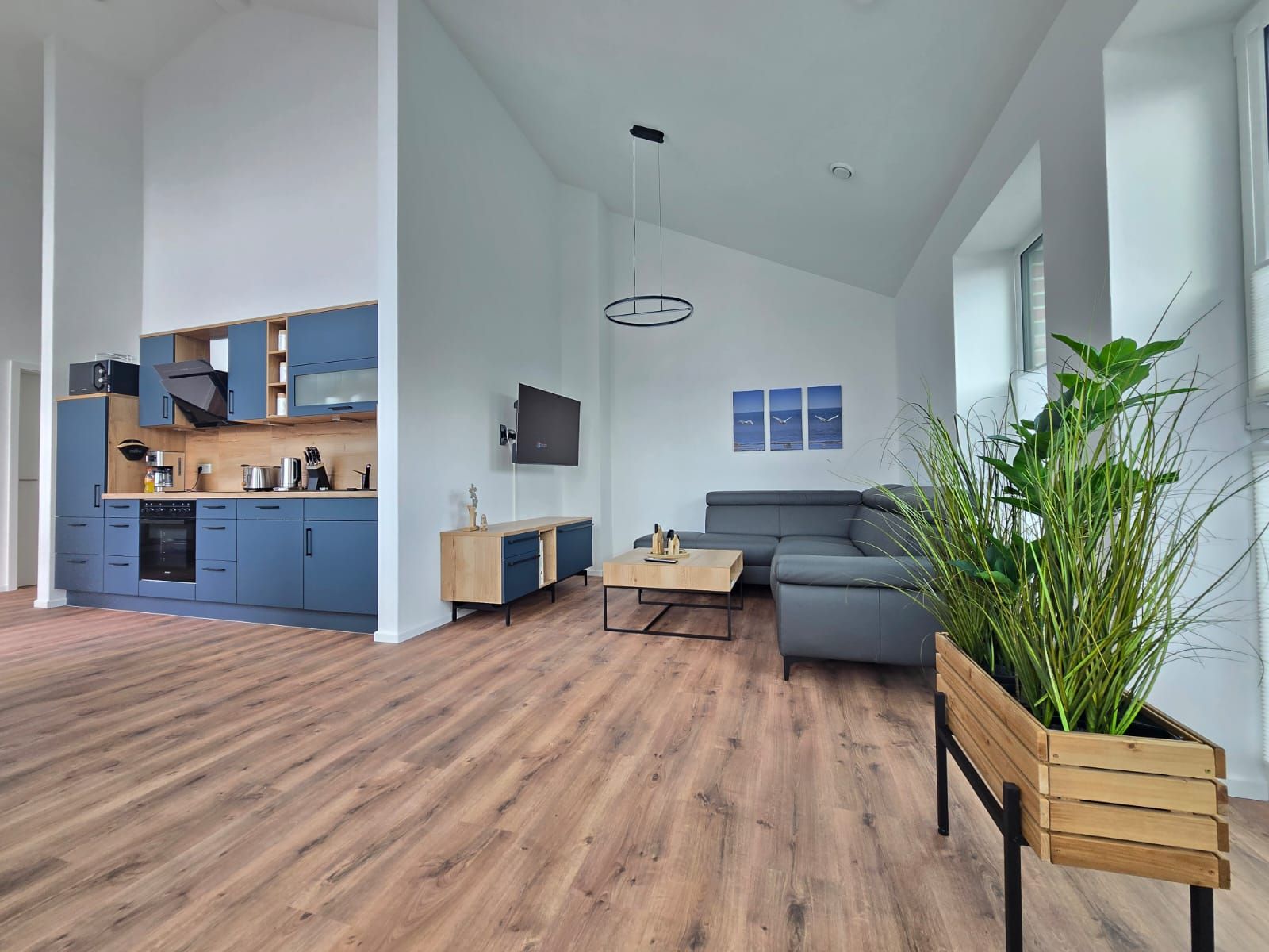 Die hell eingerichtete Ferienwohnung überzeugt durch ein modernes Wohnkonzept und hochwertige Ausstattung. Das großzügige Wohnzimmer bietet gemütliche Sitzgelegenheiten, einen Essbereich sowie eine moderne Küche mit hochwertigen Geräten, die das Kochen zum Vergnügen machen.