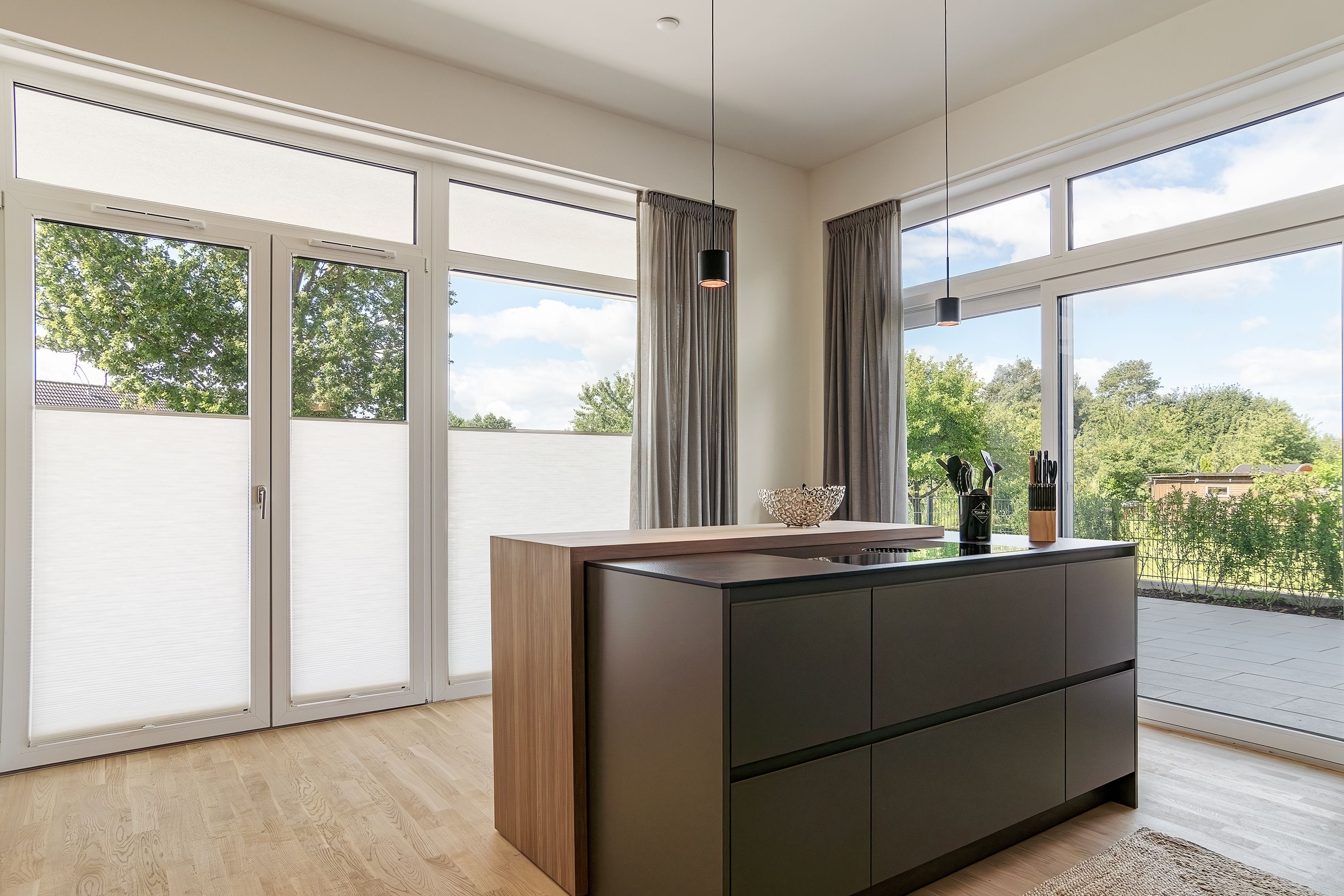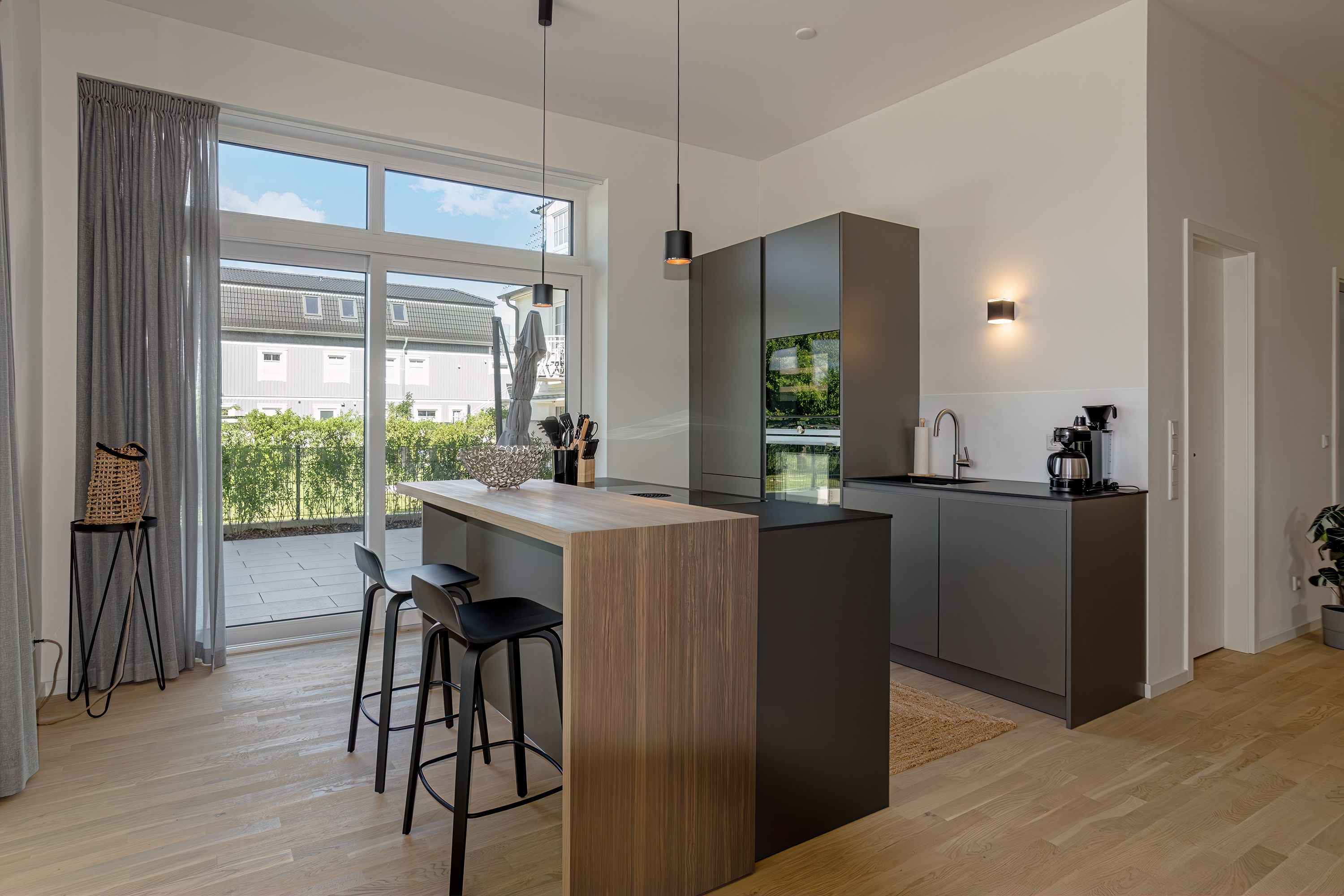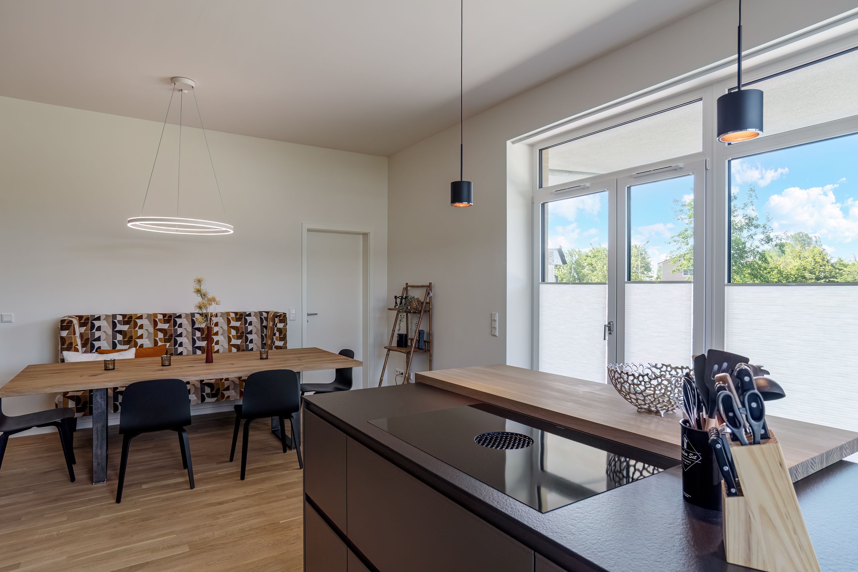 Die voll ausgestattete, offene Küche lässt das Herz jedes Hobbykochs höher schlagen. Hier können kulinarische Köstlichkeiten zubereitet werden, die Sie anschließend im angrenzenden Essbereich genießen können. Große Fenster sorgen dafür, dass viel Tageslicht in die Räume strömt und eine einladende Atmosphäre schafft.