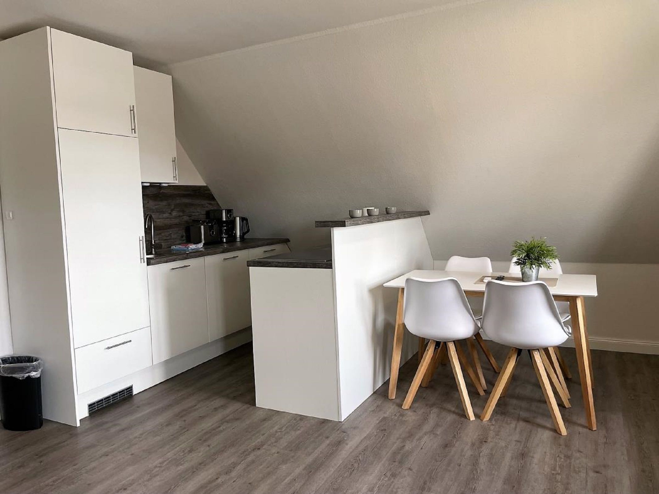 Die offene Küche ist vollständig ausgestattet und bietet Ihnen alle Annehmlichkeiten, die Sie für Ihren Aufenthalt benötigen. Dazu zählen neben einem Herd, Backofen und Kühlschrank auch eine Mikrowelle, Kaffeemaschine und Geschirr sowie Besteck. Ob Sie ein einfaches Frühstück zubereiten oder ein gemütliches Abendessen mit der Familie genießen möchten, hier finden Sie alles, was Sie brauchen.