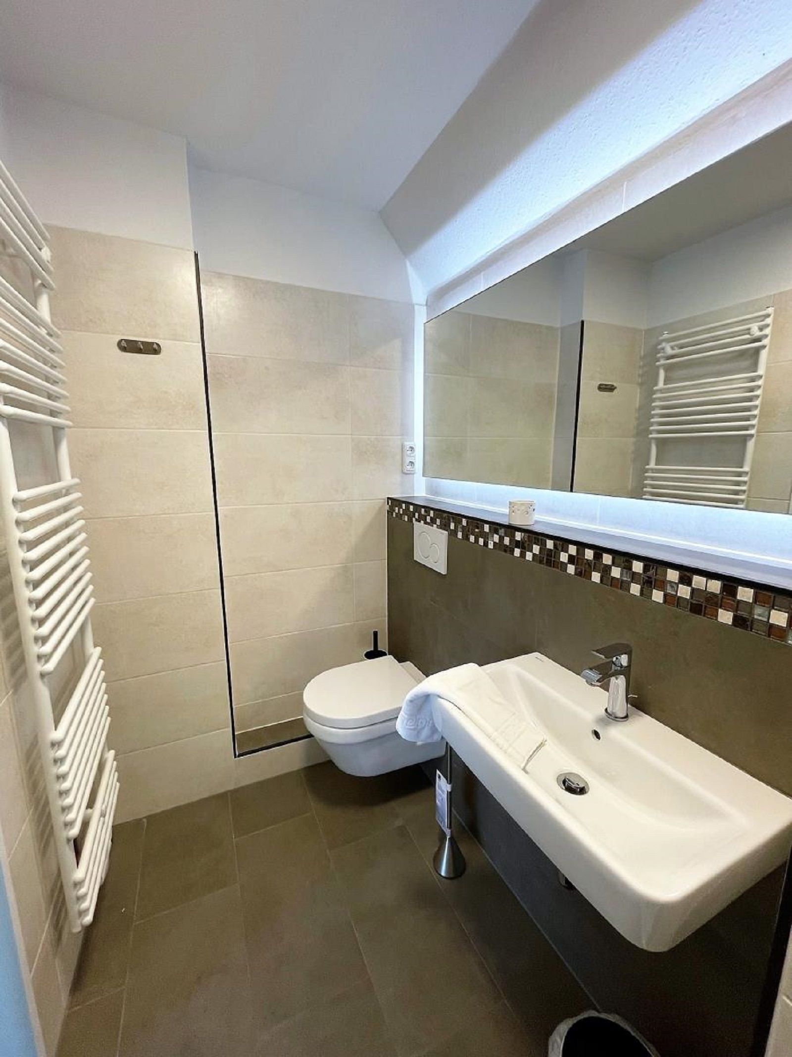 Das Badezimmer ist modern gestaltet und verfügt über eine bodengleiche Dusche, ein Waschbecken und ein WC.