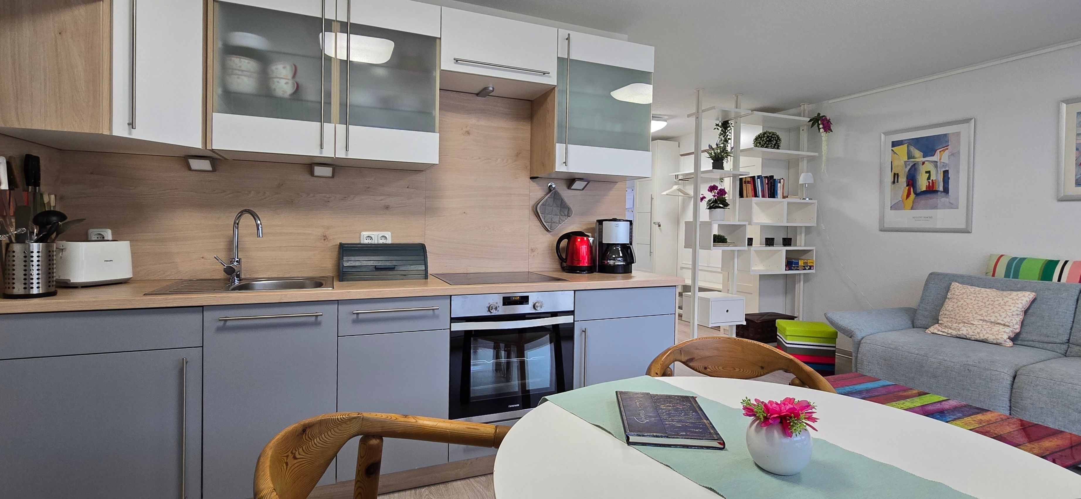 Die helle und freundliche Einrichtung der Ferienwohnung sorgt für ein sofortiges Wohlfühlambiente. Der Wohnbereich ist mit einem gemütlichen Sofa (welches zu einem weiteren Schlafplatz - 150 cm x 190 cm- für zwei weitere Personen umgebaut werden kann) und einem Esstisch ausgestattet, an dem gemütliche Abende mit gemeinsamen Mahlzeiten oder Spielen verbracht werden können. Dank einer voll ausgestatteten Küche, die über alle notwendigen Küchengeräte wie Kühlschrank, Gefrierfach, Spülmaschine, Backofen, 4-Platten-Induktionsherd, Espressokocher und Kaffeemaschine verfügt, können Sie kulinarische Köstlichkeiten zubereiten und Ihre Familie oder Freunde verwöhnen. Auch Handmixer, Auflauf- und Backformen sind vorhanden.