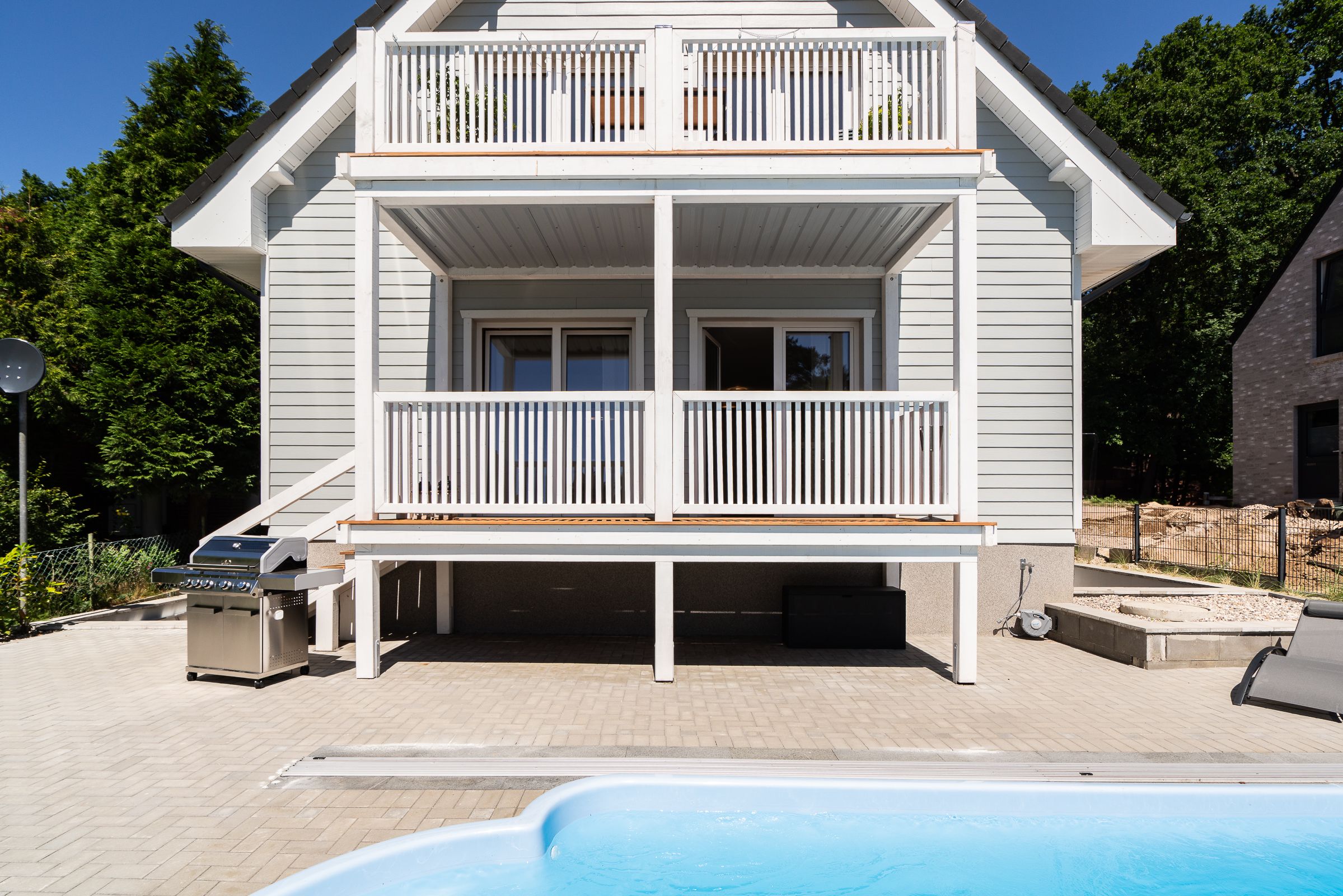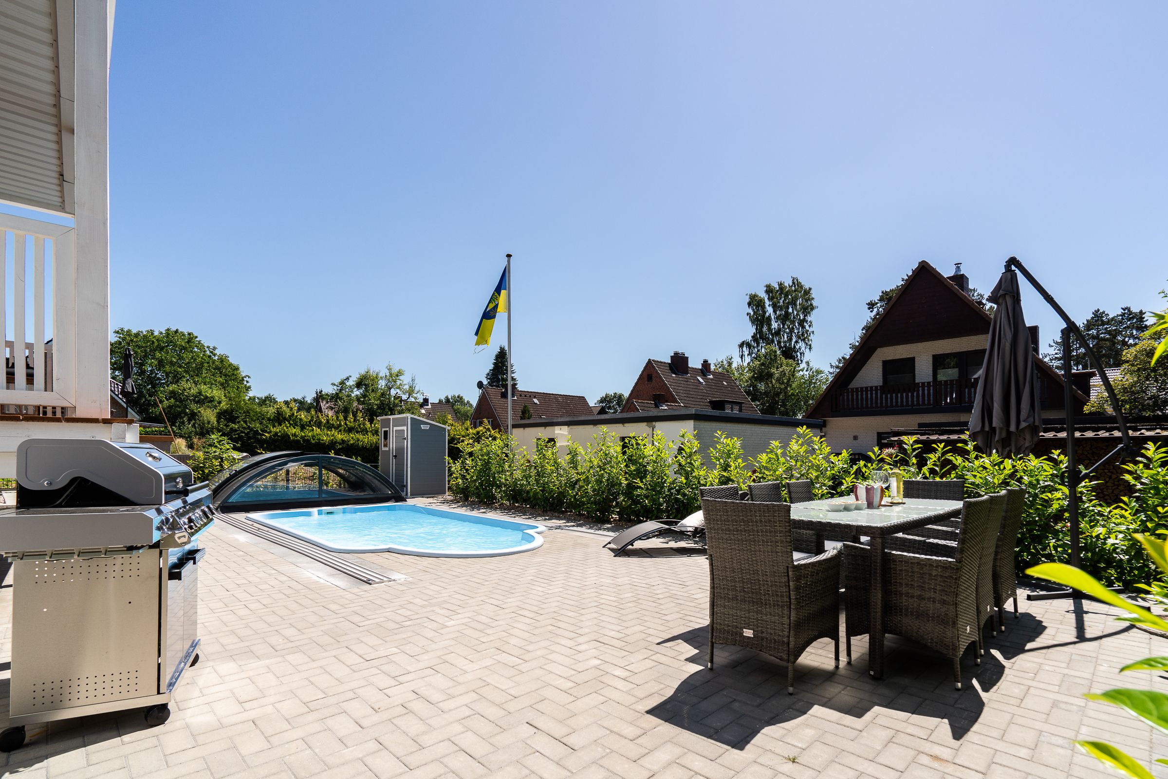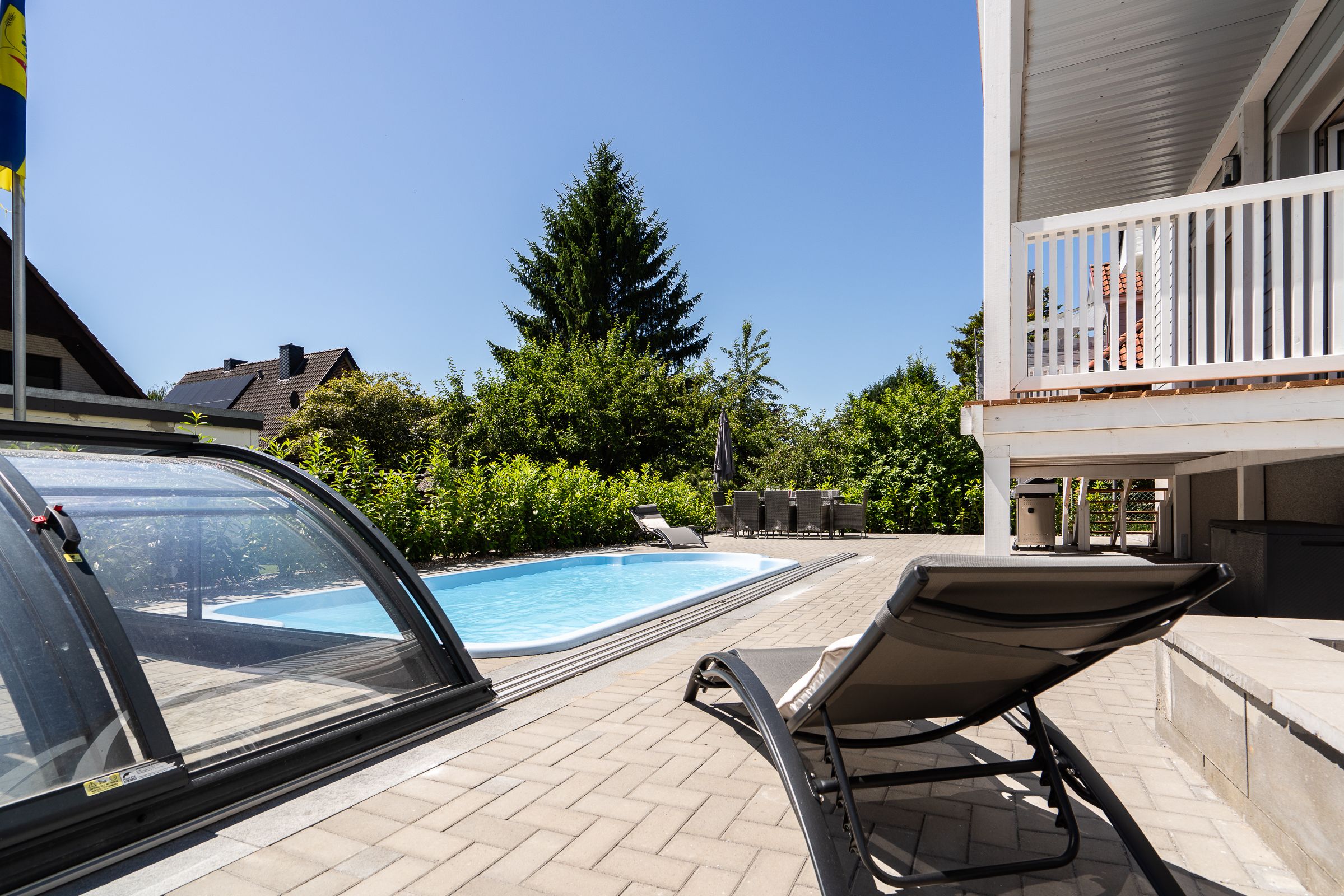 Der Außenbereich bietet besondere Highlights für einen erholsamen Urlaub: Vom Balkon aus blicken Sie auf die Terrasse mit dem beheizten Salzwasser-Pool (24°C von Ostern - Oktober), der auf einem abgeschlossenen, kinder- und hundesicheren Grundstück liegt. Die Poolüberdachung kann man nach Bedarf auf- oder zuschieben, so dass sich auch kleine Kinder problemlos unbeaufsichtigt auf dem Grundstück bewegen können. Und selbst bei kühlen Außentemperaturen kann man den Pool wie ein Hallenbad nutzen. Im Untergeschoss befindet sich zudem eine Sauna für 2 Personen.Hunde (maximal zwei) sind gerne willkommen. Für gemeinsame Stunden im Freien stehen Gartenmöbel, Sonnenliegen, Sonnenschirm und ein großer Gasgrill zur Verfügung. Der beheizte Outdoor-Pool zur Eigennutzung lädt zum Schwimmen und Entspannen ein – ein exklusives Extra, das das Urlaubsgefühl abrundet.