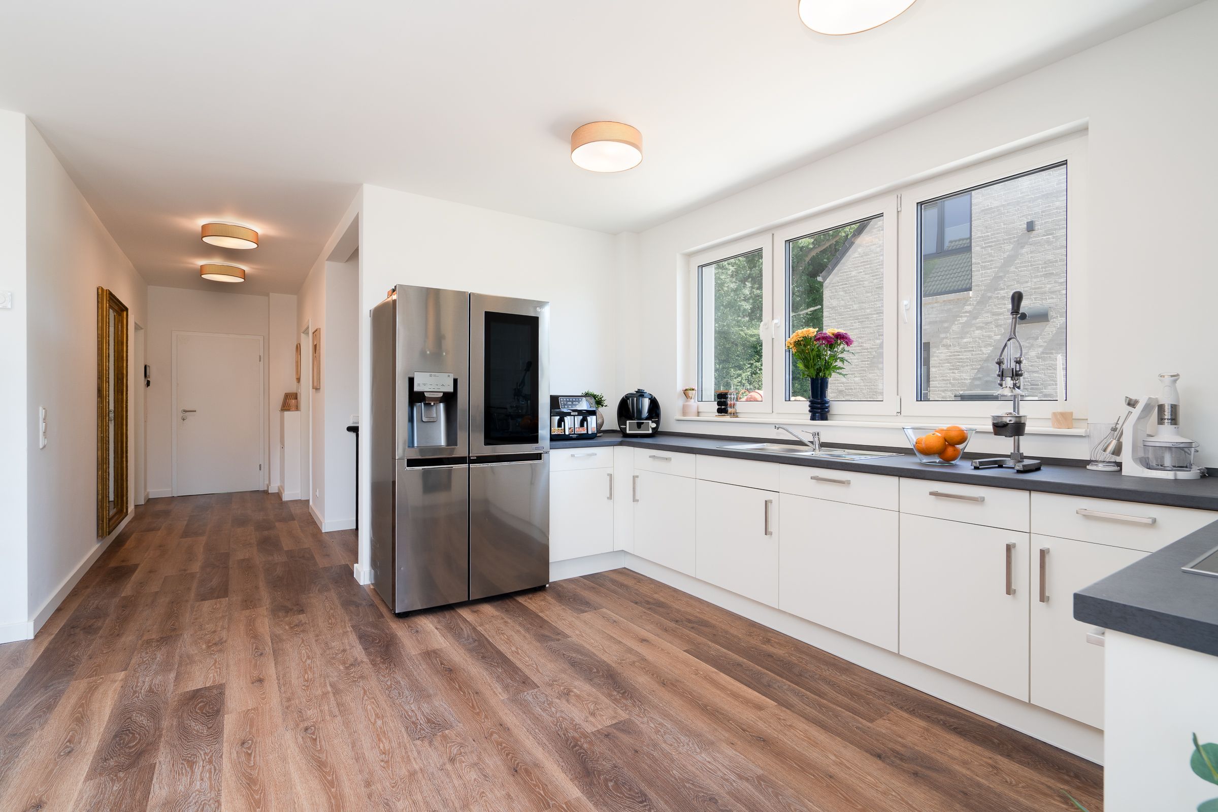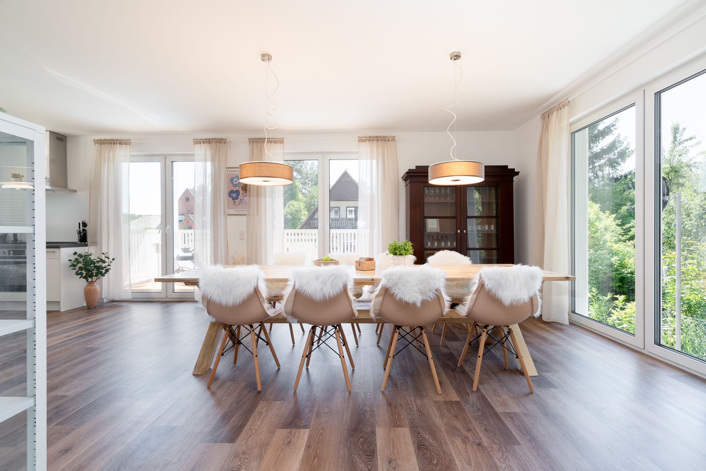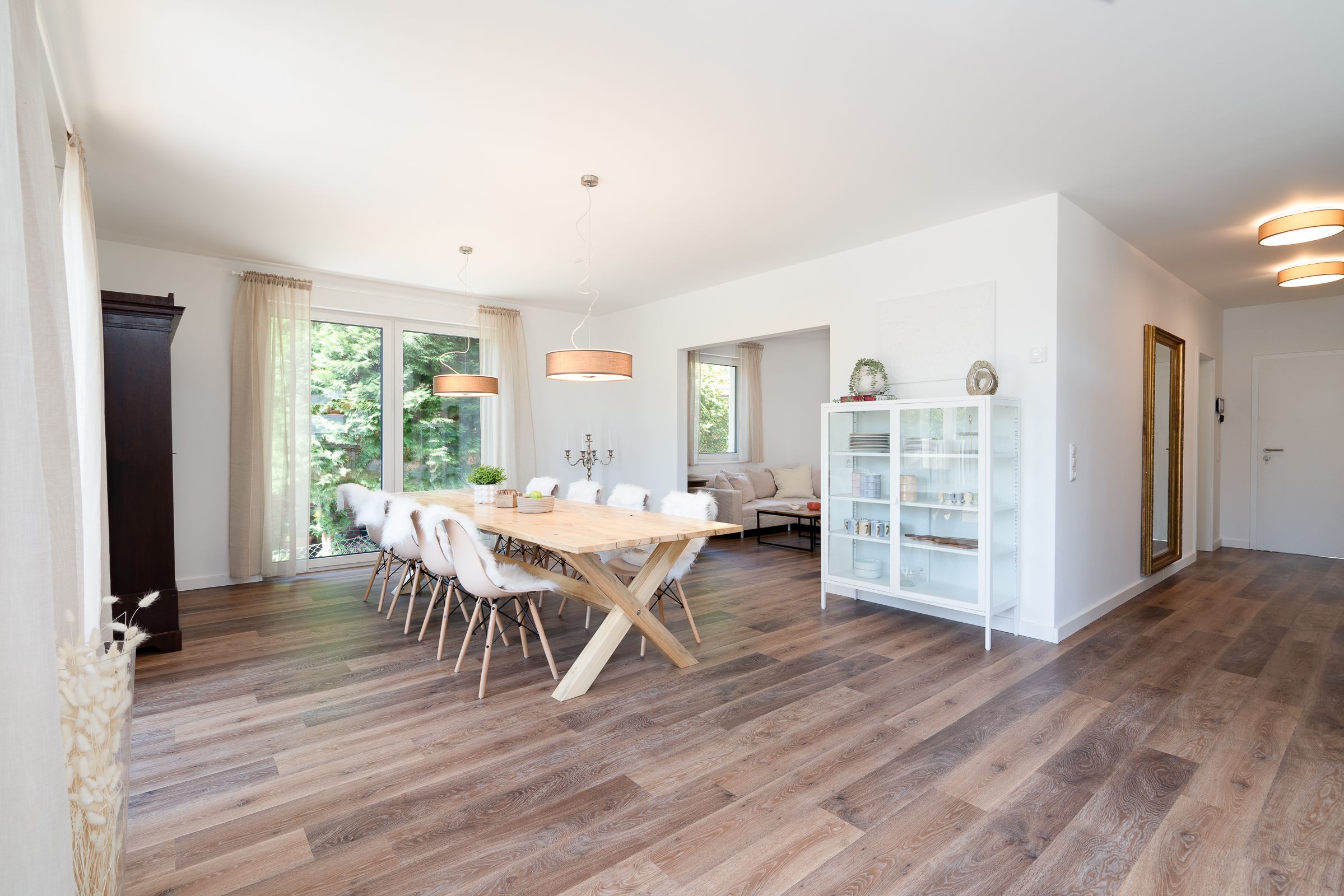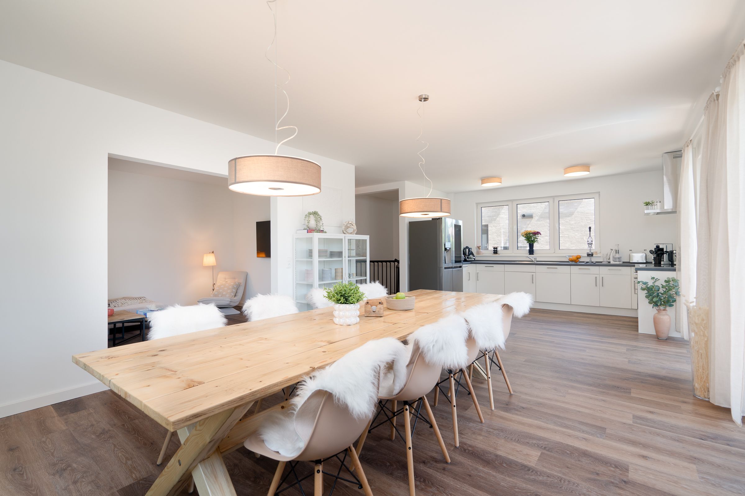 Es erwartet Sie ein lichtdurchfluteter Wohnbereich mit zwei gemütlichen Sofas und einem Essbereich, der zu geselligen Mahlzeiten einlädt. Die offen zum Ess- und Wohnzimmer gestaltete Küche ist vollständig ausgestattet und verfügt unter anderem über einen Backofen, Herd, Heißluftfritteuse, Kühlschrank mit Eiswürfelspender, Gefrierschrank, Spülmaschine, Kaffeemaschine, Wasserkocher und Toaster. Ein absolutes Highlight in der Küche ist der neue Thermomix, mit dem Sie kurzerhand und ganz unkompliziert leckere Mahlzeiten zaubern können. Für die morgendliche Dosis Vitamine sorgt die elektrische Saftpresse. Sämtliches Geschirr, Besteck und Küchenutensilien sind in ausreichender Anzahl vorhanden. Die Einrichtung wurde so gewählt, dass Familien mit Kindern, Eltern und Großeltern gleichermaßen ihren Aufenthalt genießen können. Zwei Babybetten und zwei Kinderhochstühle stehen für die jüngsten Gäste bereit.