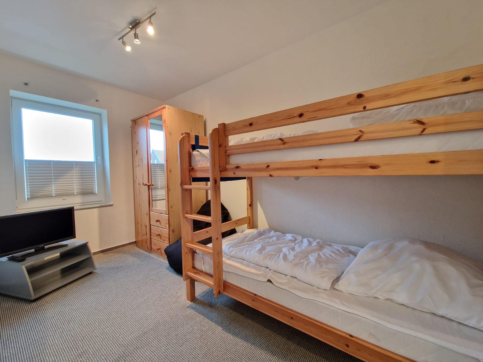 Ein Kinderzimmer mit Etagenbett und eigenem Fernseher