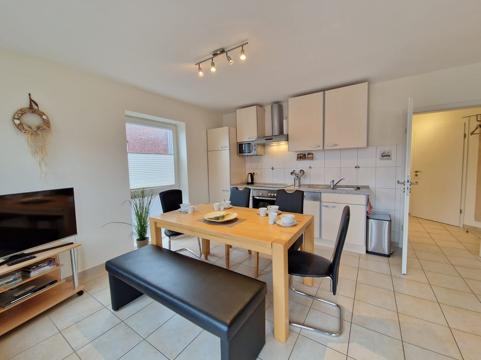Die Wohnung verfügt über einen hellen und großzügigen Wohn-/Essbereich mit offener, voll ausgestatteter Küche. Hier finden Sie alles, was Sie für die Selbstversorgung benötigen: Cerankochfeld, Geschirrspüler, Mikrowelle, Gefrierfach, Kaffeemaschine und Toaster. Der Essbereich bietet ausreichend Platz für gemeinsame Mahlzeiten oder Spieleabende.