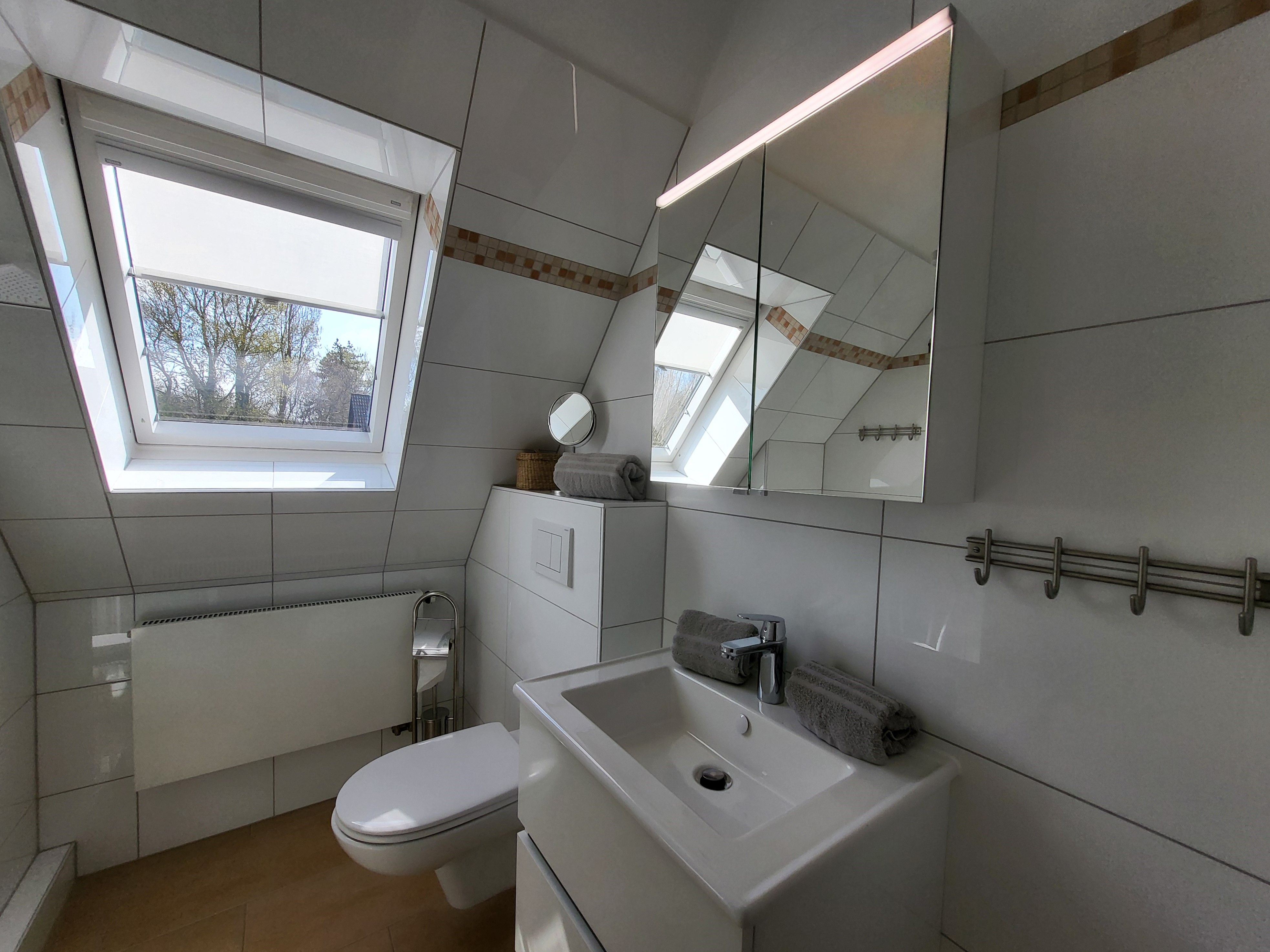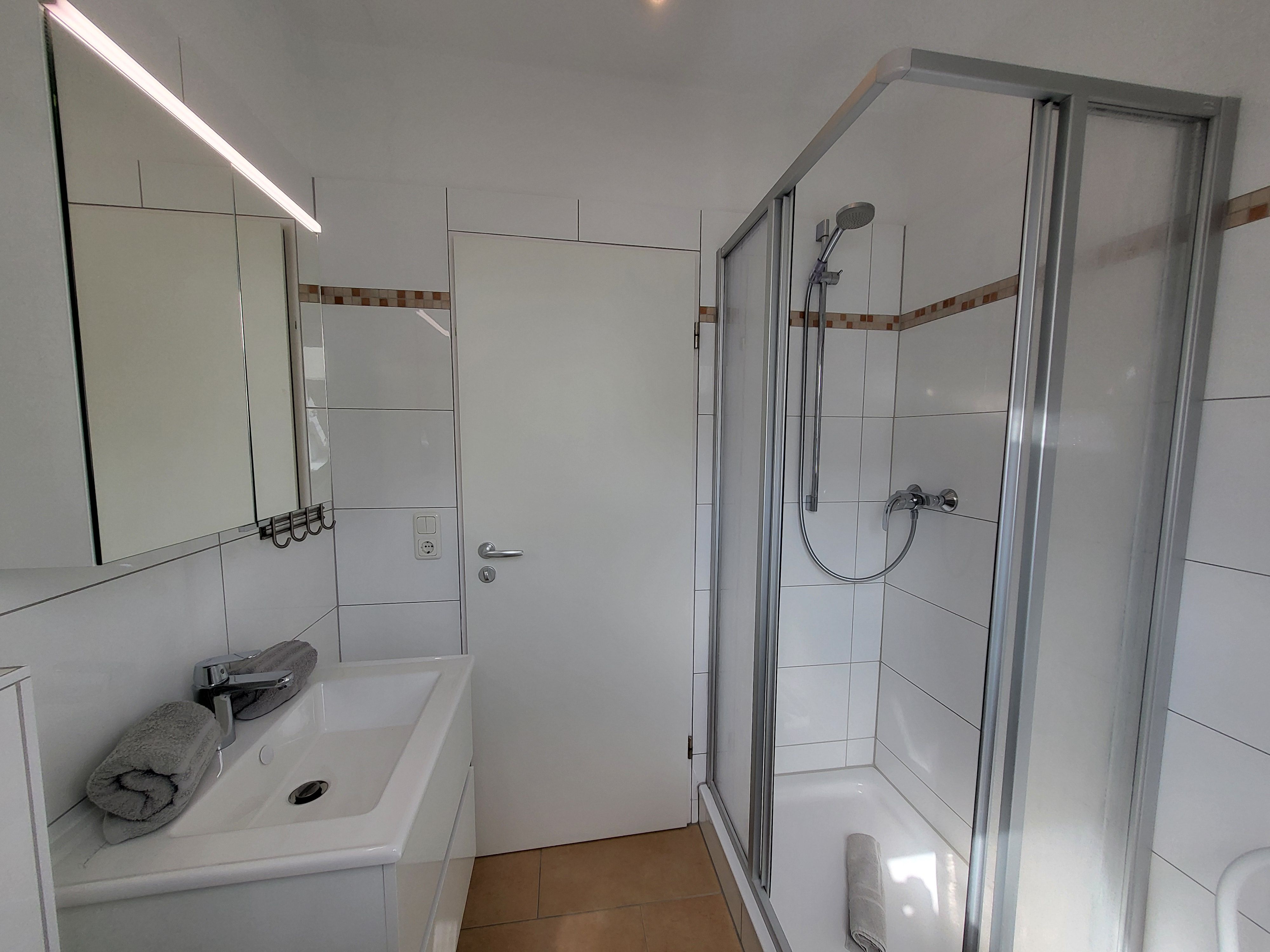 Das moderne und helle Badezimmer ist mit einer Dusche und einer Badewanne ausgestattet.